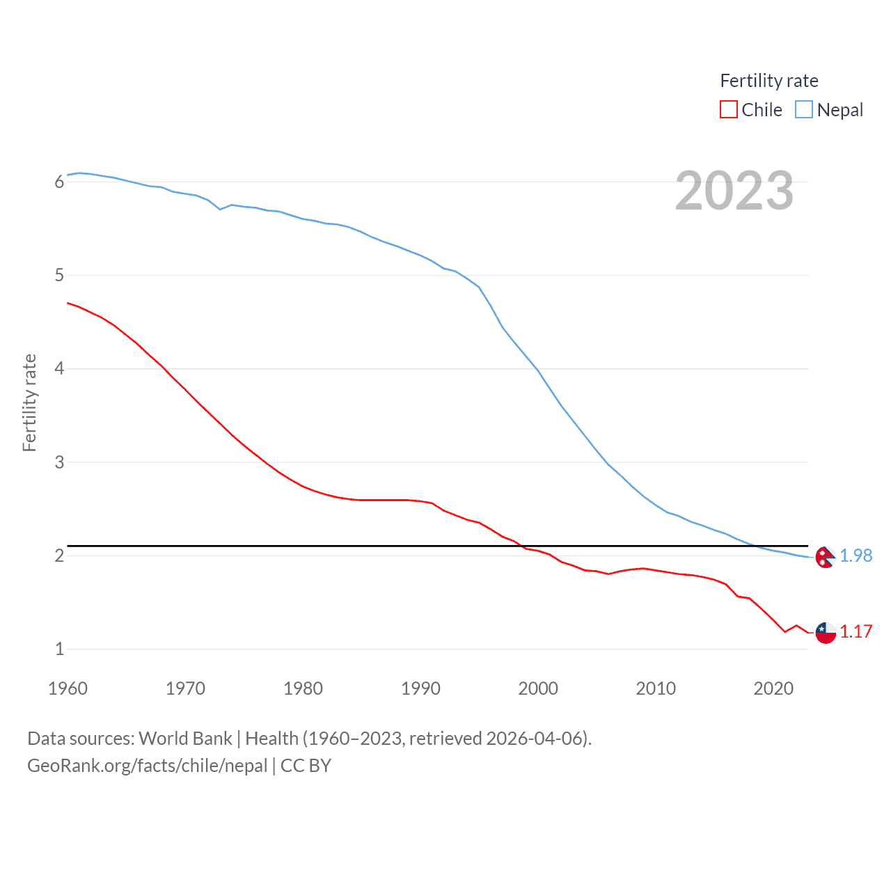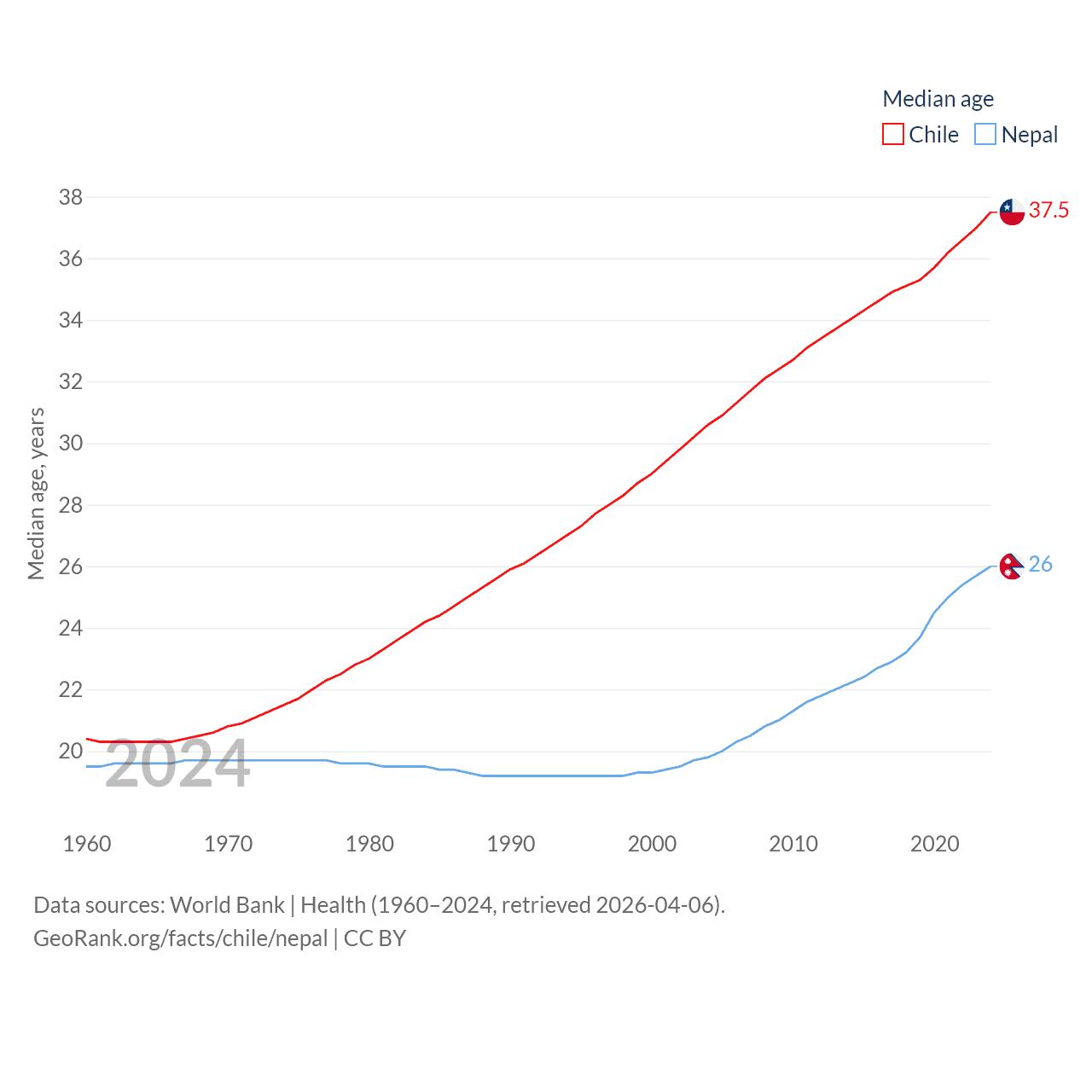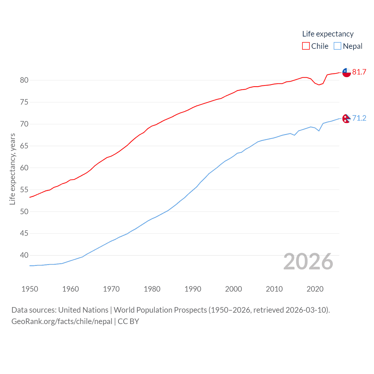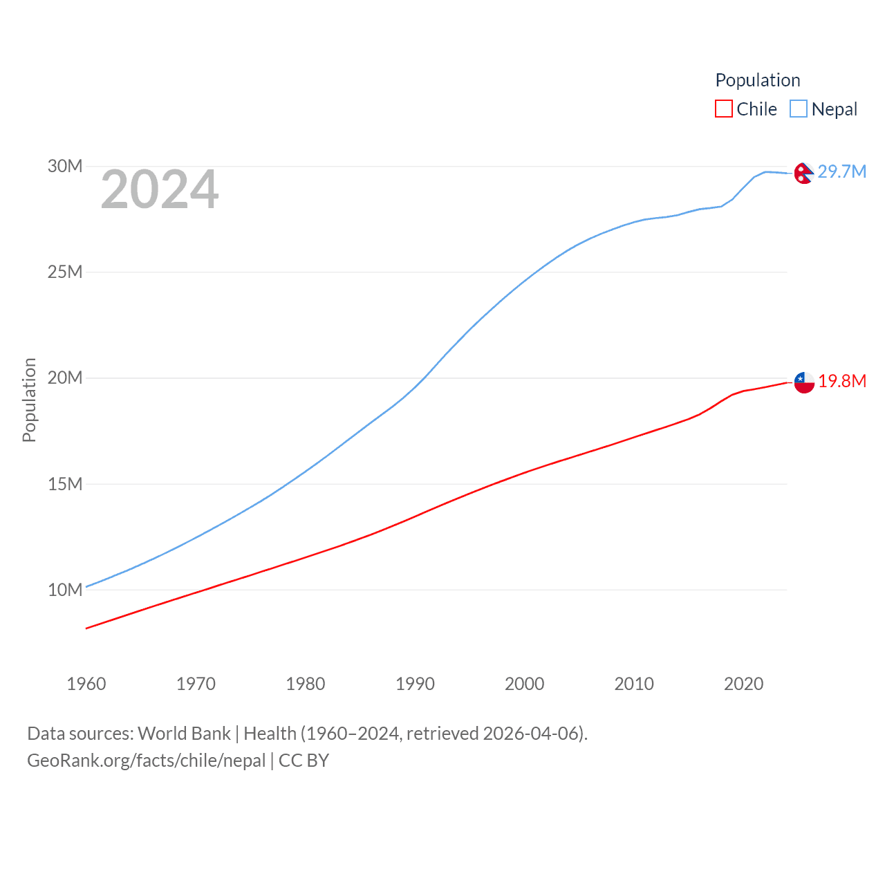 Chile has a population of 19.8M (ranked 66/197), compared with 29.7M in Nepal (ranked 51/197). Chile's land area is 286,809 sq mi versus 55,348 sq mi for Nepal (ranked 38th vs. 92nd).