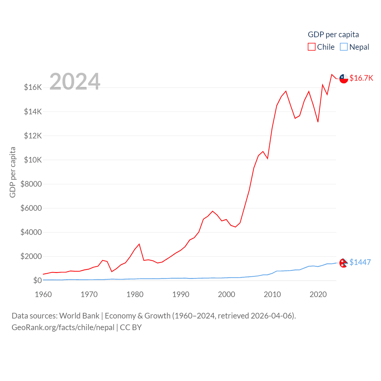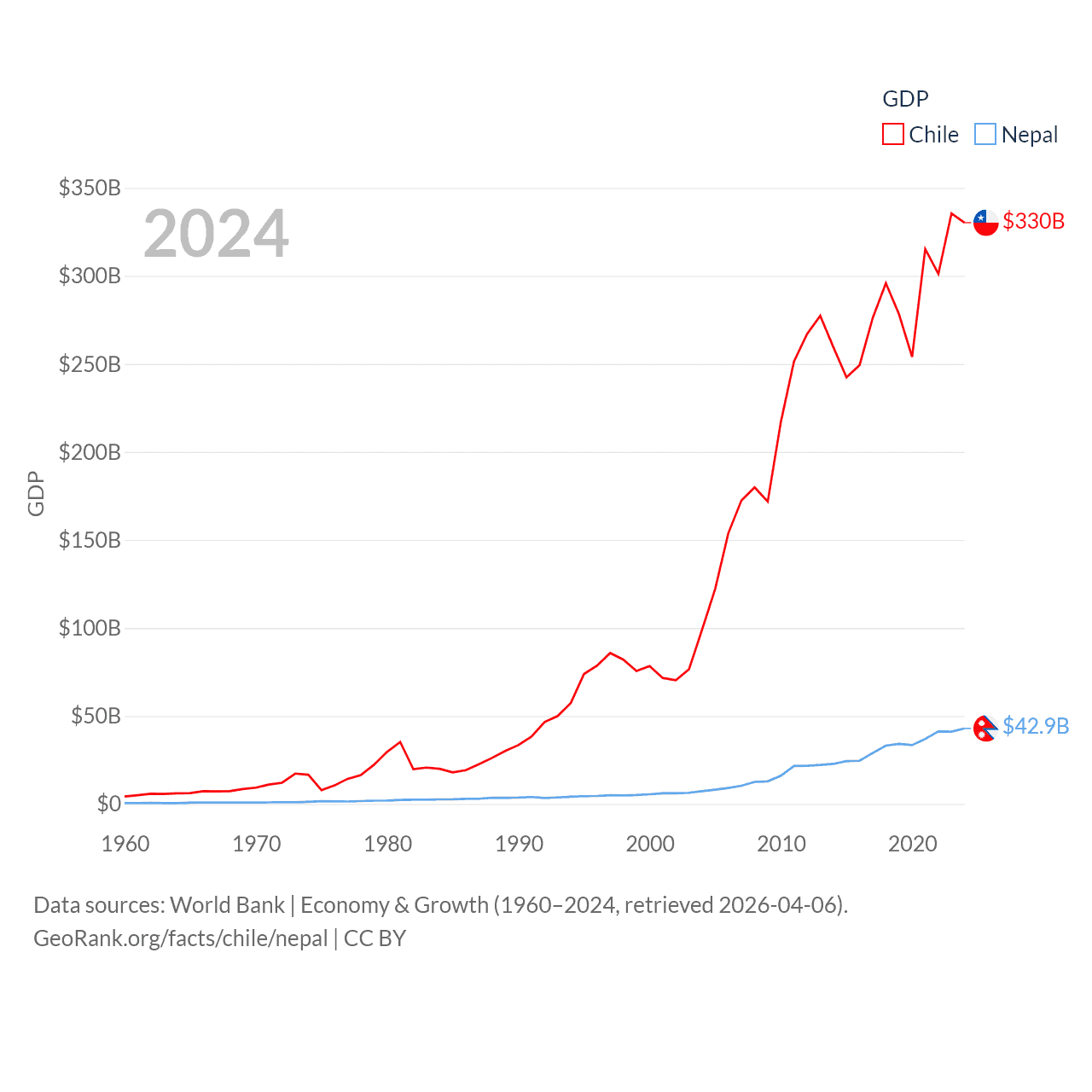 By GDP, Chile ranks 45/197 ($330B) and Nepal ranks 101/197 ($42.9B). By GDP per capita, Chile ranks 65/197 ($16,710), while Nepal ranks 164/197 ($1,447).