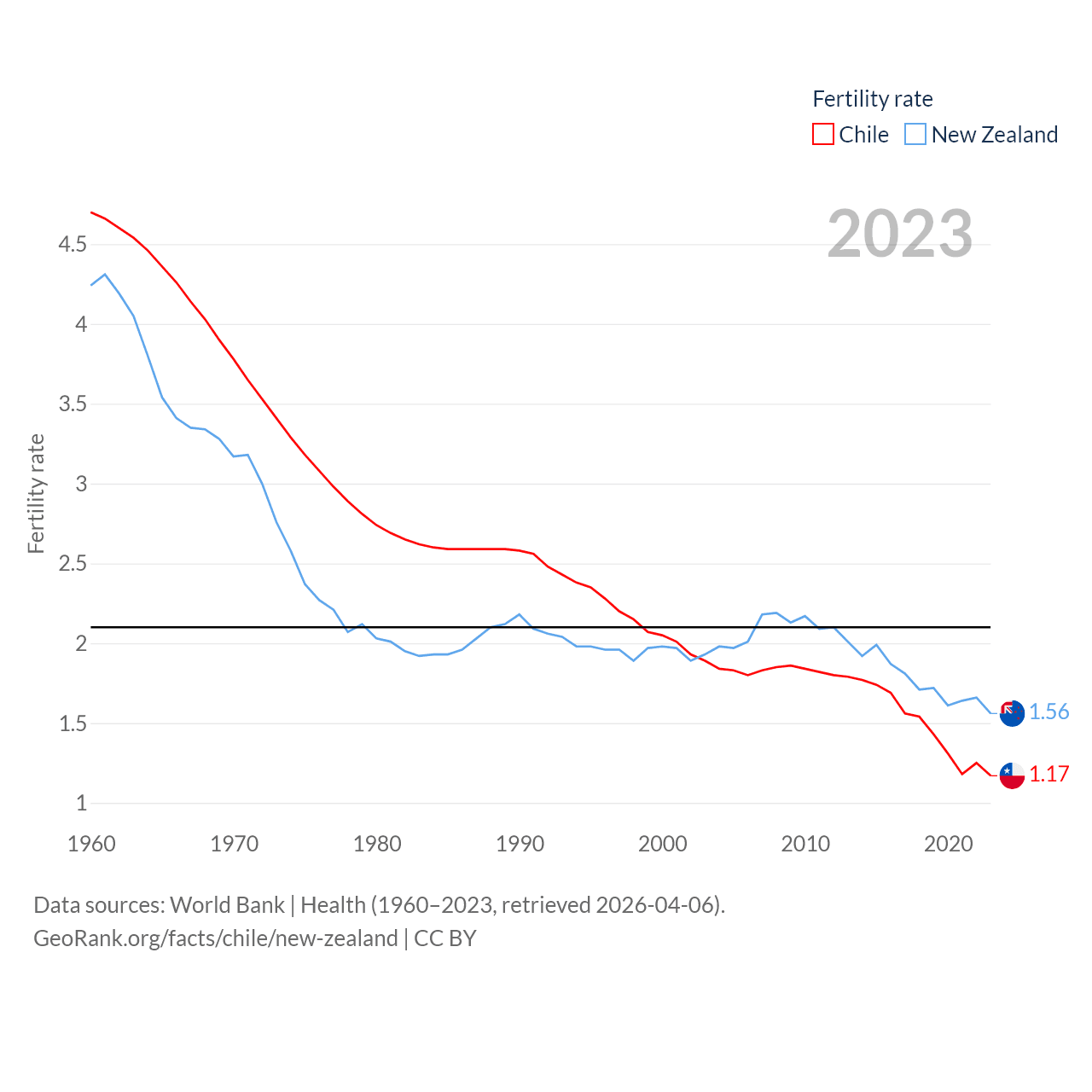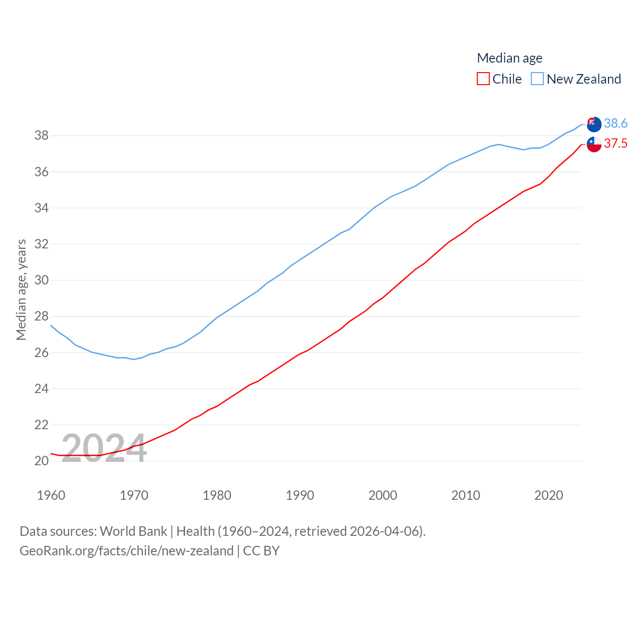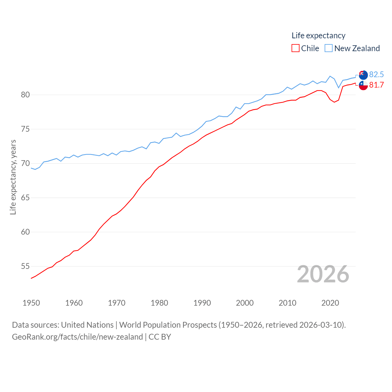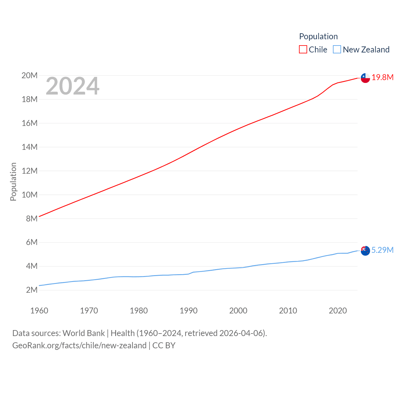 Chile has a population of 19.8M (ranked 66/197), compared with 5.29M in New Zealand (ranked 123/197). Chile's land area is 286,809 sq mi versus 101,665 sq mi for New Zealand (ranked 38th vs. 74th).