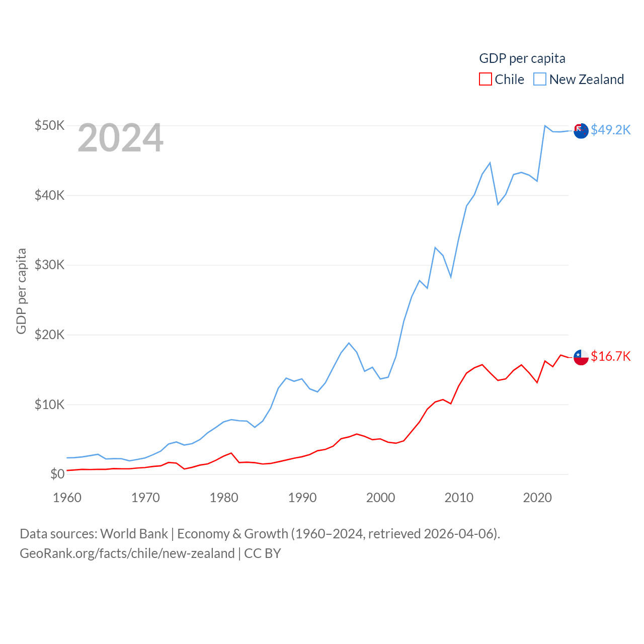 By GDP, Chile ranks 45/197 ($330B) and New Zealand ranks 52/197 ($260B). By GDP per capita, Chile ranks 65/197 ($16,710), while New Zealand ranks 26/197 ($49,205).