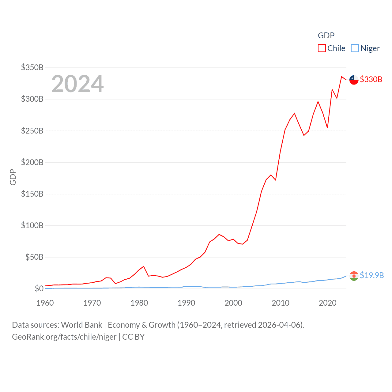 By GDP, Chile ranks 45/197 ($330B) and Niger ranks 130/197 ($19.9B). By GDP per capita, Chile ranks 65/197 ($16,710), while Niger ranks 187/197 ($735).