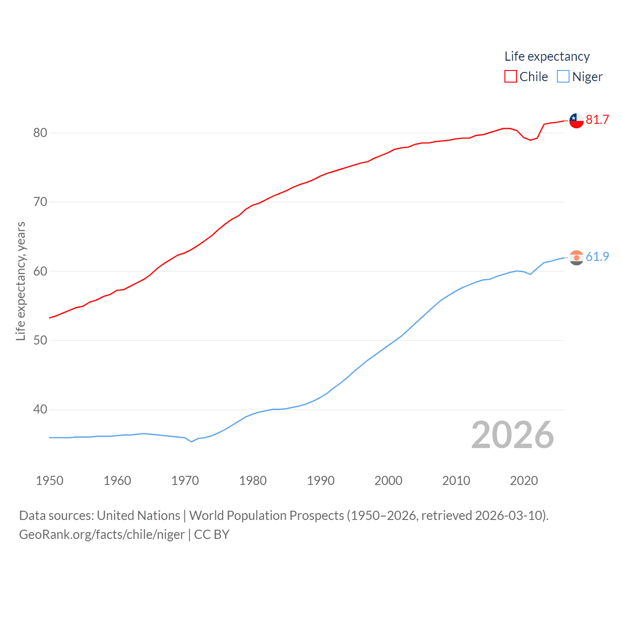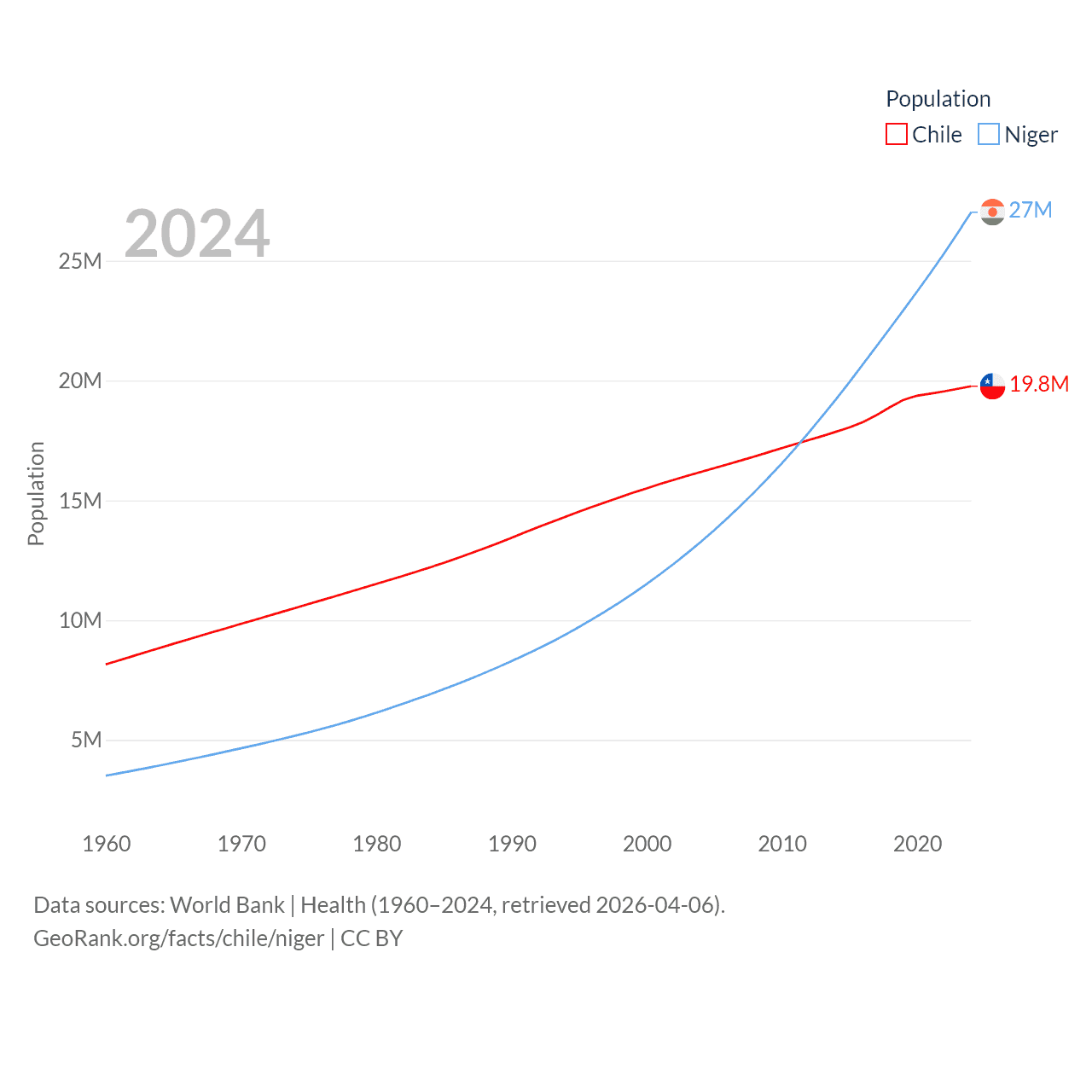 Chile has a population of 19.8M (ranked 66/197), compared with 27M in Niger (ranked 55/197). Chile's land area is 286,809 sq mi versus 489,076 sq mi for Niger (ranked 38th vs. 20th).