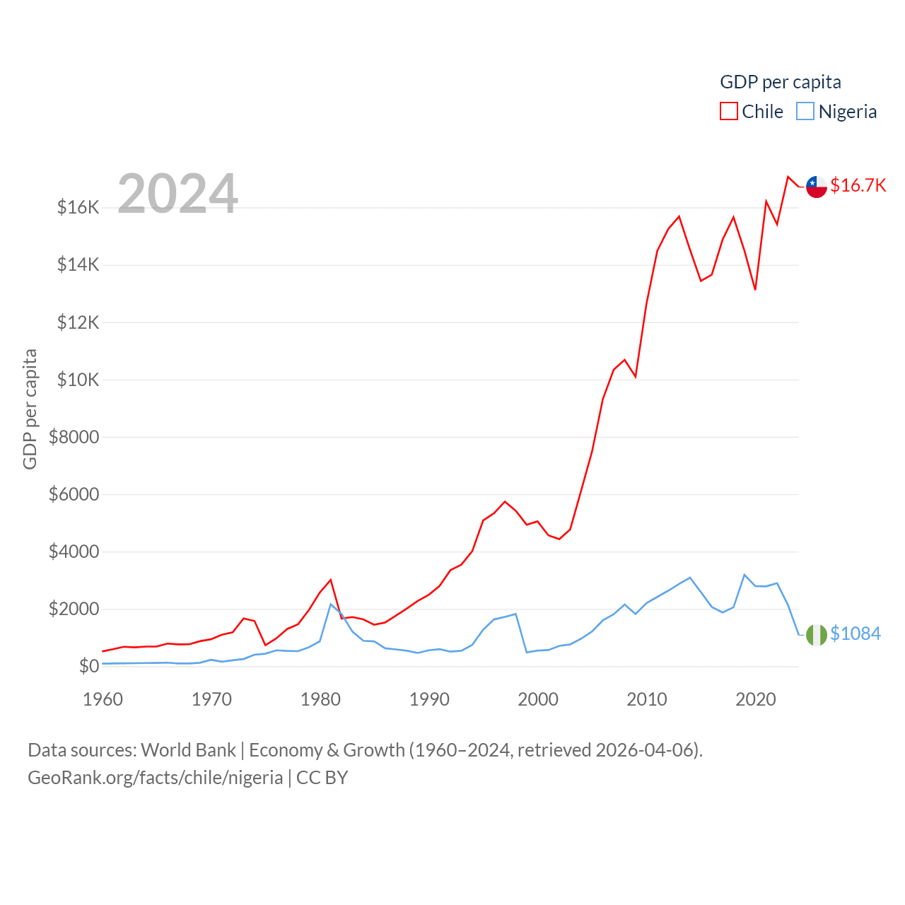 By GDP, Chile ranks 45/197 ($330B) and Nigeria ranks 54/197 ($252B). By GDP per capita, Chile ranks 65/197 ($16,710), while Nigeria ranks 174/197 ($1,084).