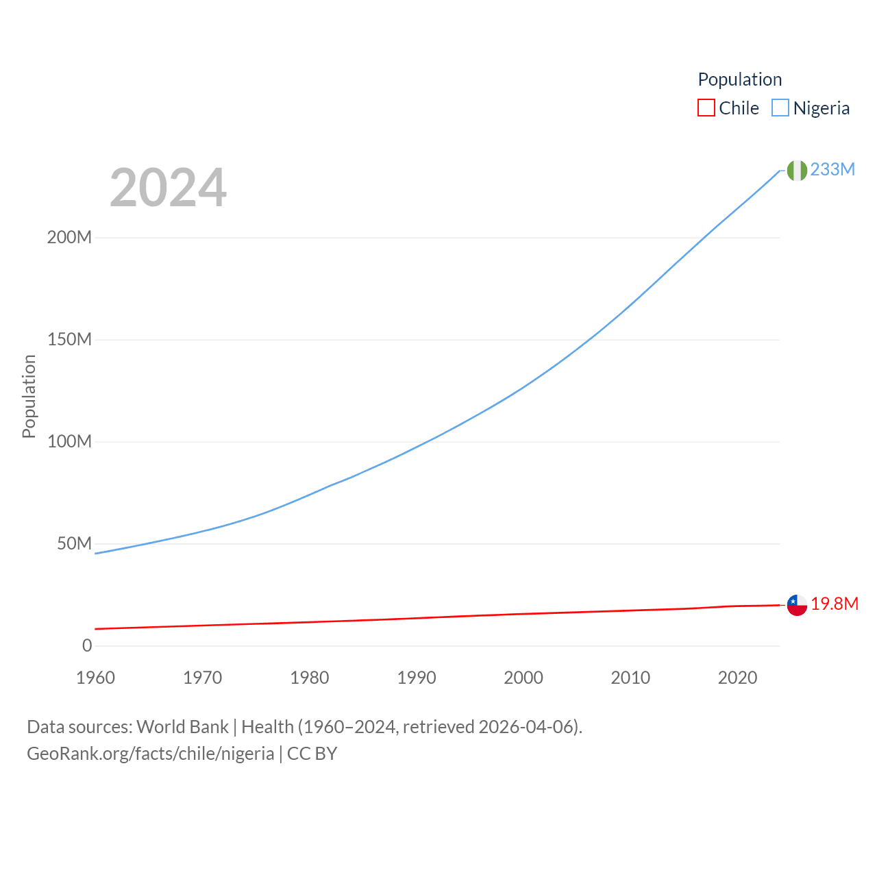 Chile has a population of 19.8M (ranked 66/197), compared with 233M in Nigeria (ranked 6/197). Chile's land area is 286,809 sq mi versus 351,650 sq mi for Nigeria (ranked 38th vs. 30th).