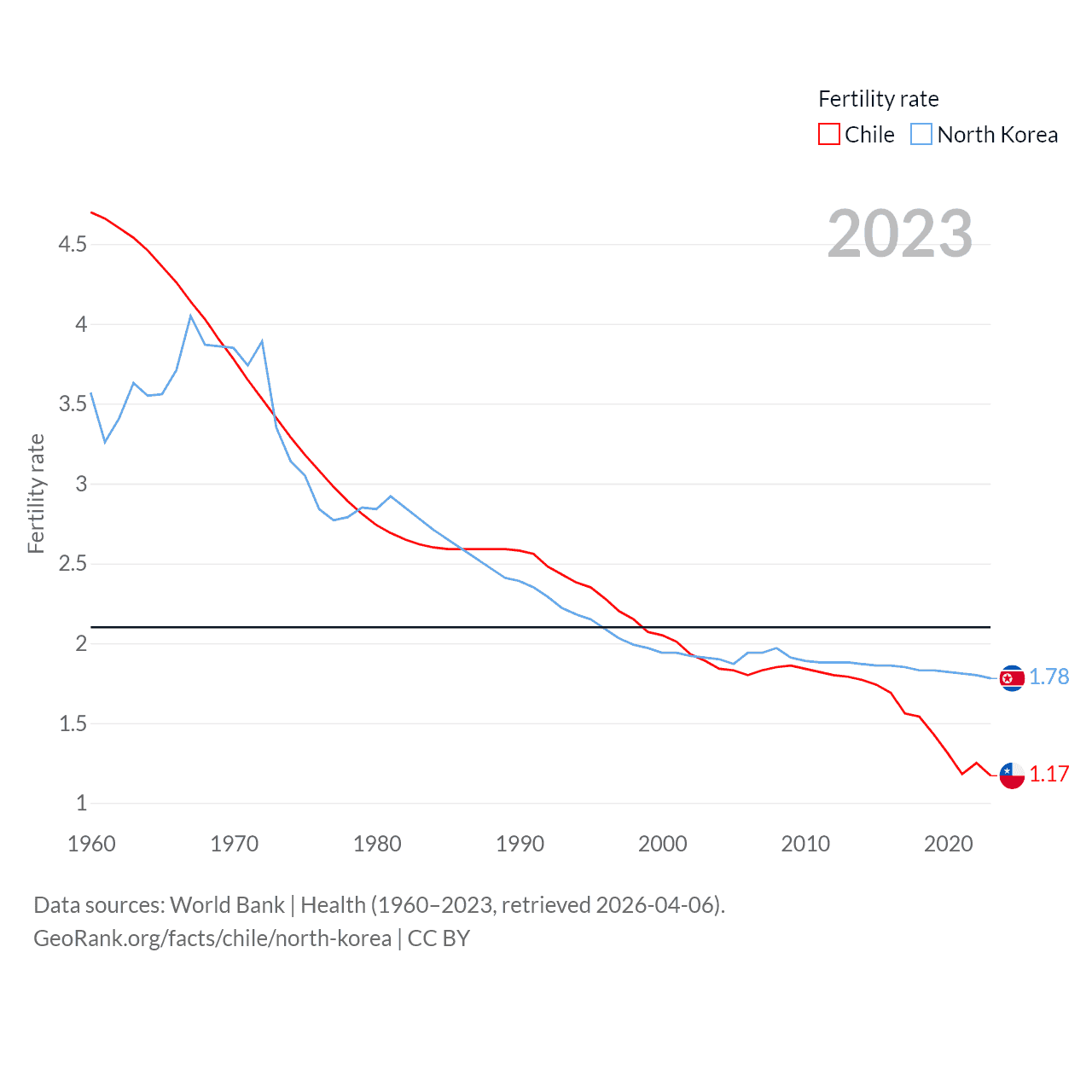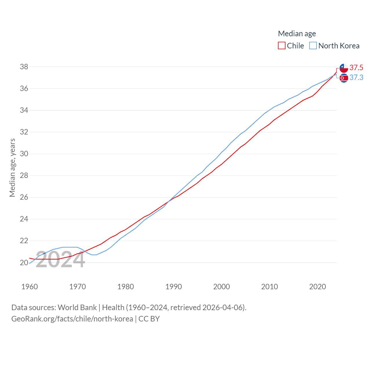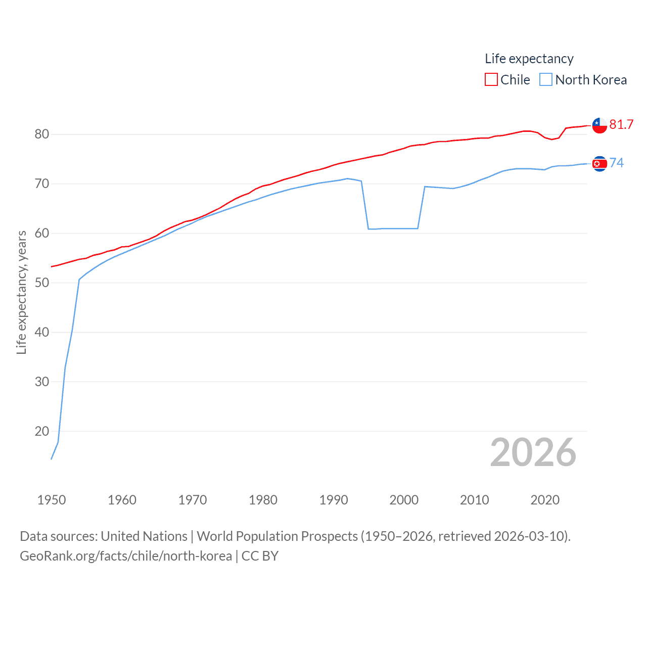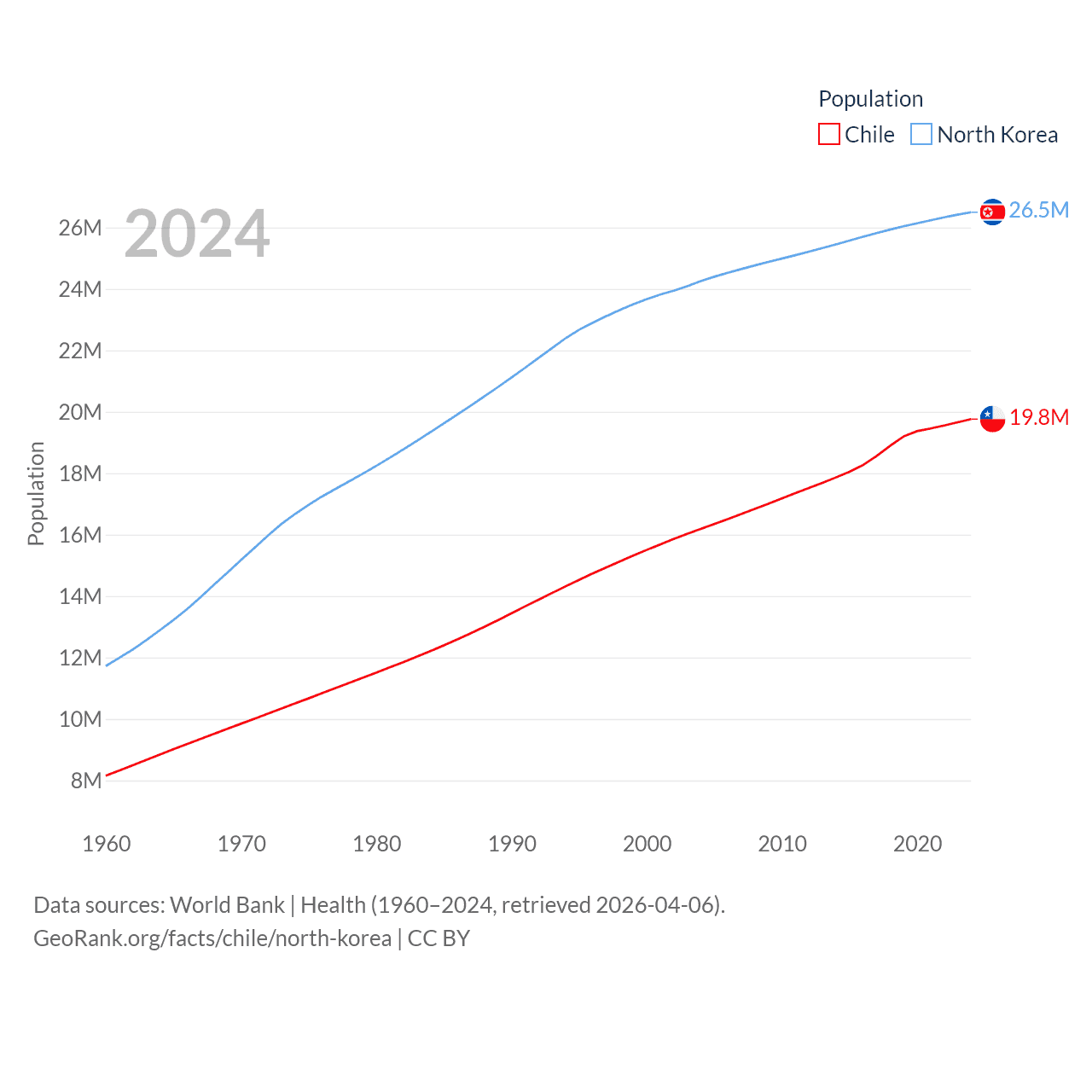 Chile has a population of 19.8M (ranked 66/197), compared with 26.5M in North Korea (ranked 56/197). Chile's land area is 286,809 sq mi versus 46,491 sq mi for North Korea (ranked 38th vs. 97th).