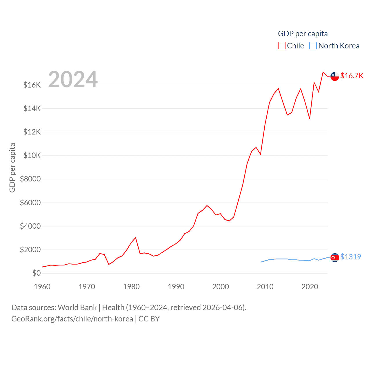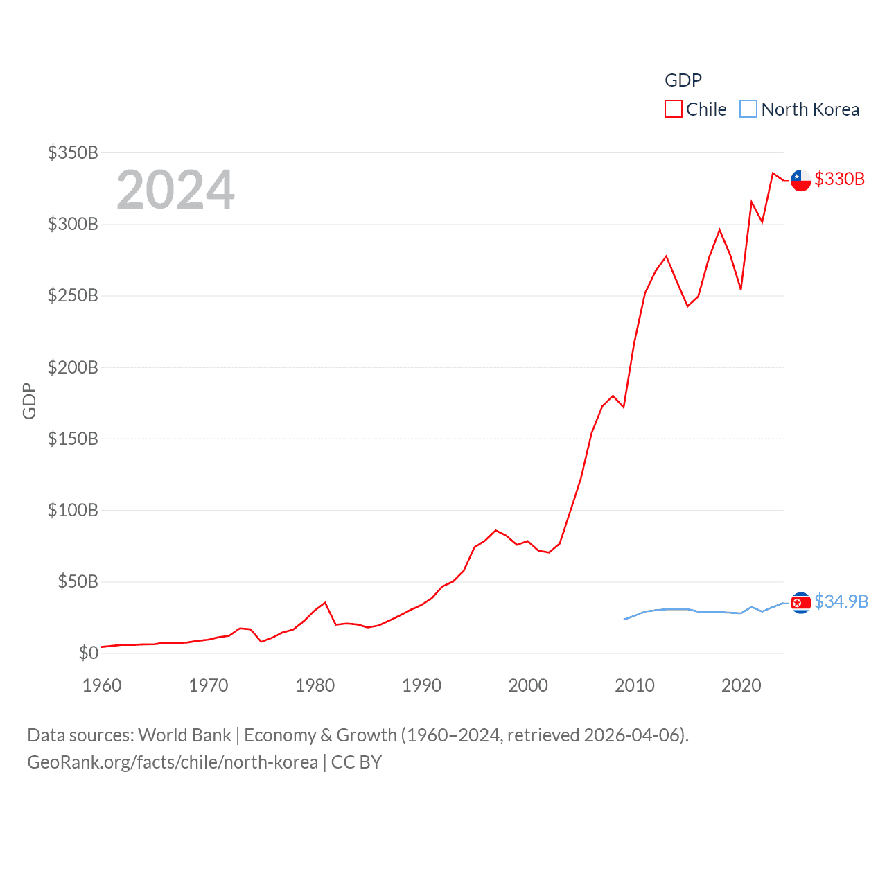 By GDP, Chile ranks 45/197 ($330B) and North Korea ranks 106/197 ($34.9B). By GDP per capita, Chile ranks 65/197 ($16,710), while North Korea ranks 168/197 ($1,319).