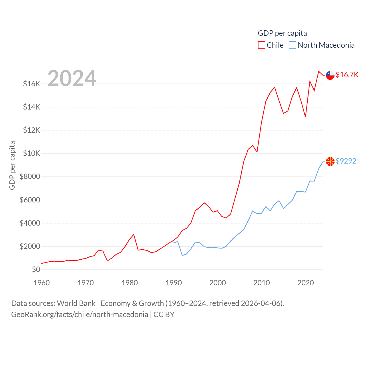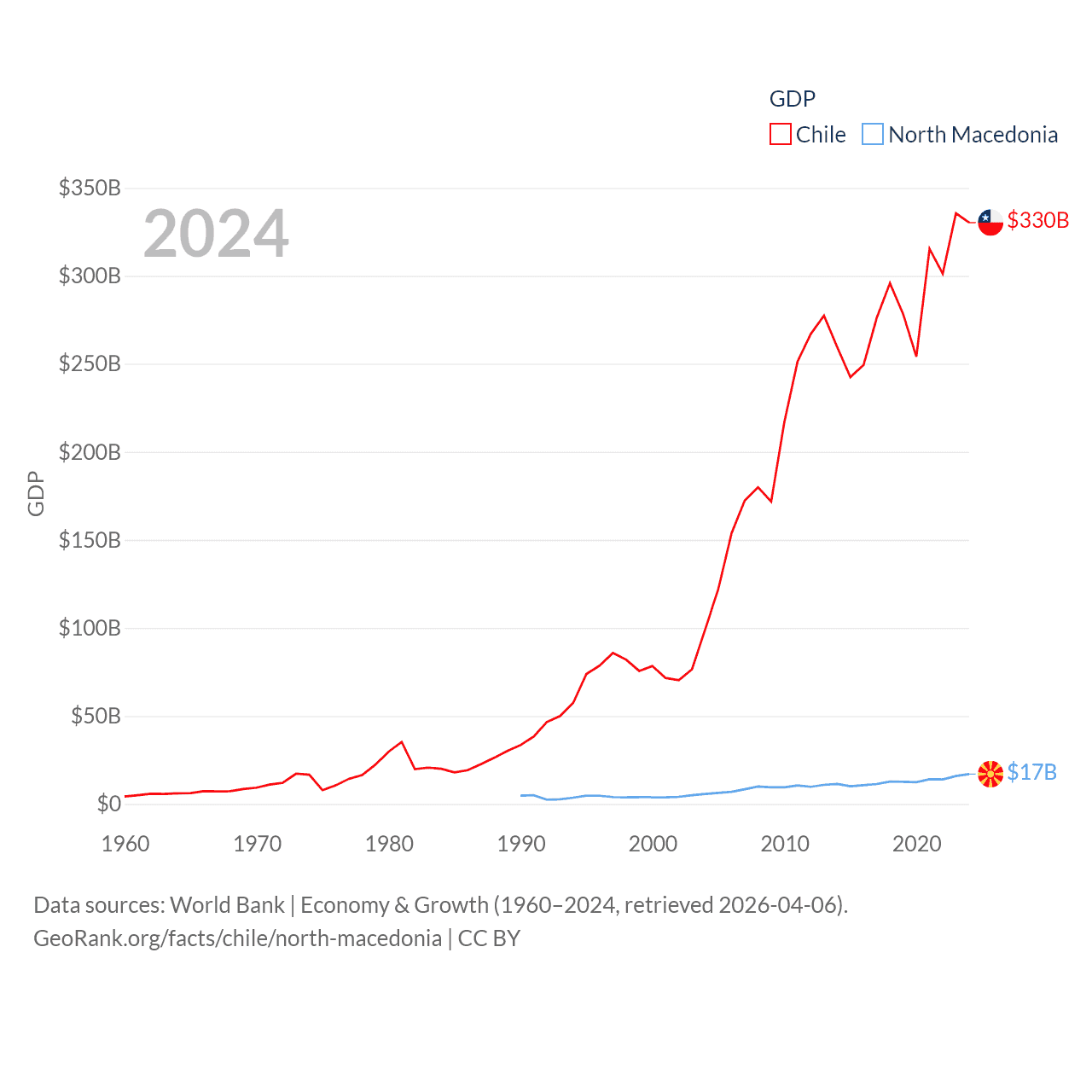 By GDP, Chile ranks 45/197 ($330B) and North Macedonia ranks 138/197 ($17B). By GDP per capita, Chile ranks 65/197 ($16,710), while North Macedonia ranks 88/197 ($9,292).