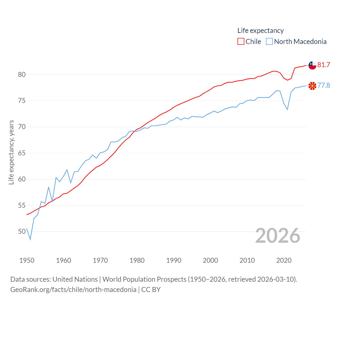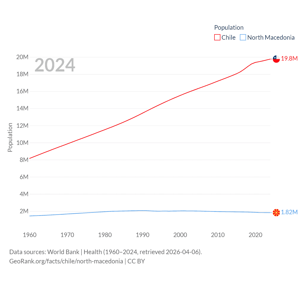 Chile has a population of 19.8M (ranked 66/197), compared with 1.82M in North Macedonia (ranked 150/197). Chile's land area is 286,809 sq mi versus 9,737 sq mi for North Macedonia (ranked 38th vs. 145th).