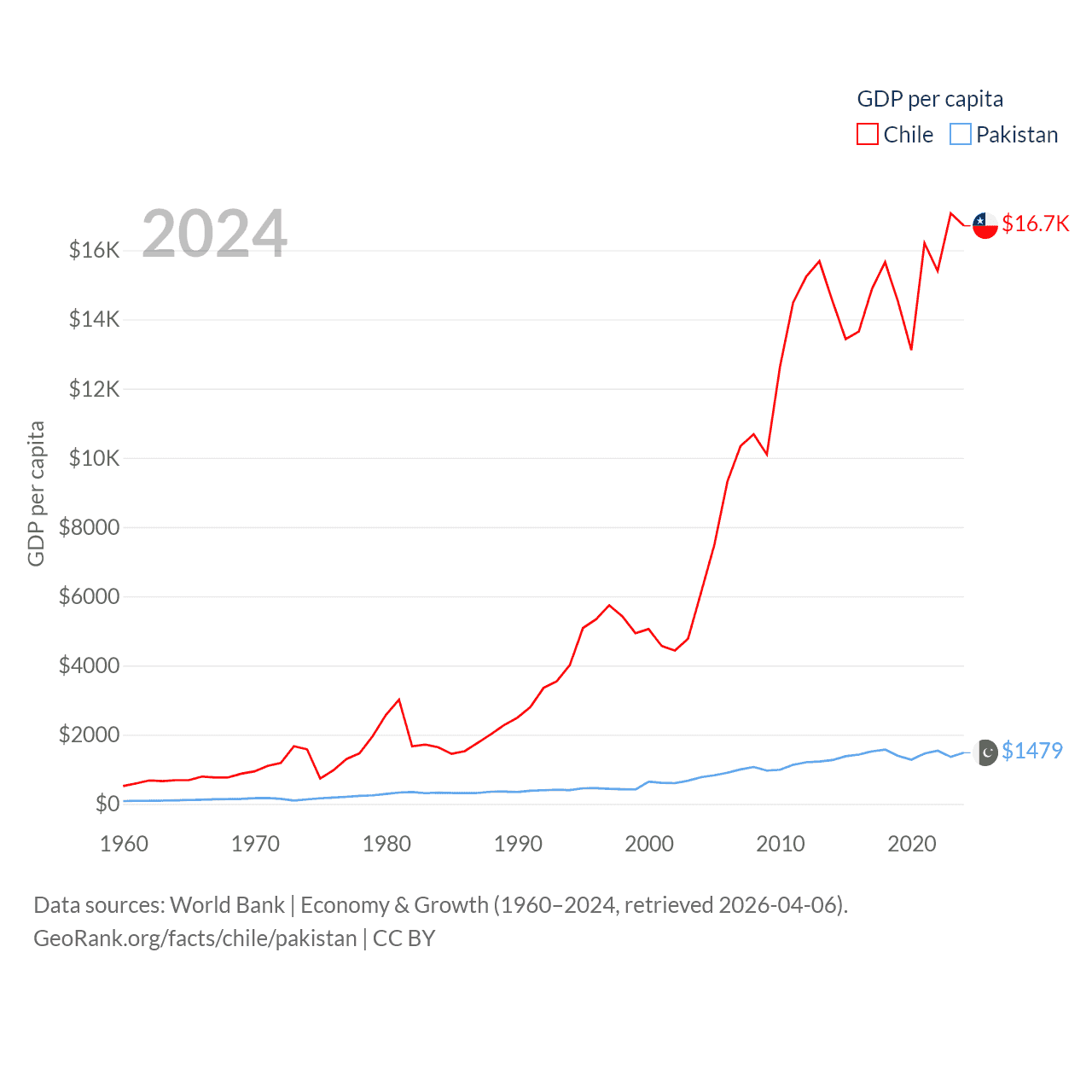 By GDP, Chile ranks 45/197 ($330B) and Pakistan ranks 43/197 ($372B). By GDP per capita, Chile ranks 65/197 ($16,710), while Pakistan ranks 163/197 ($1,479).