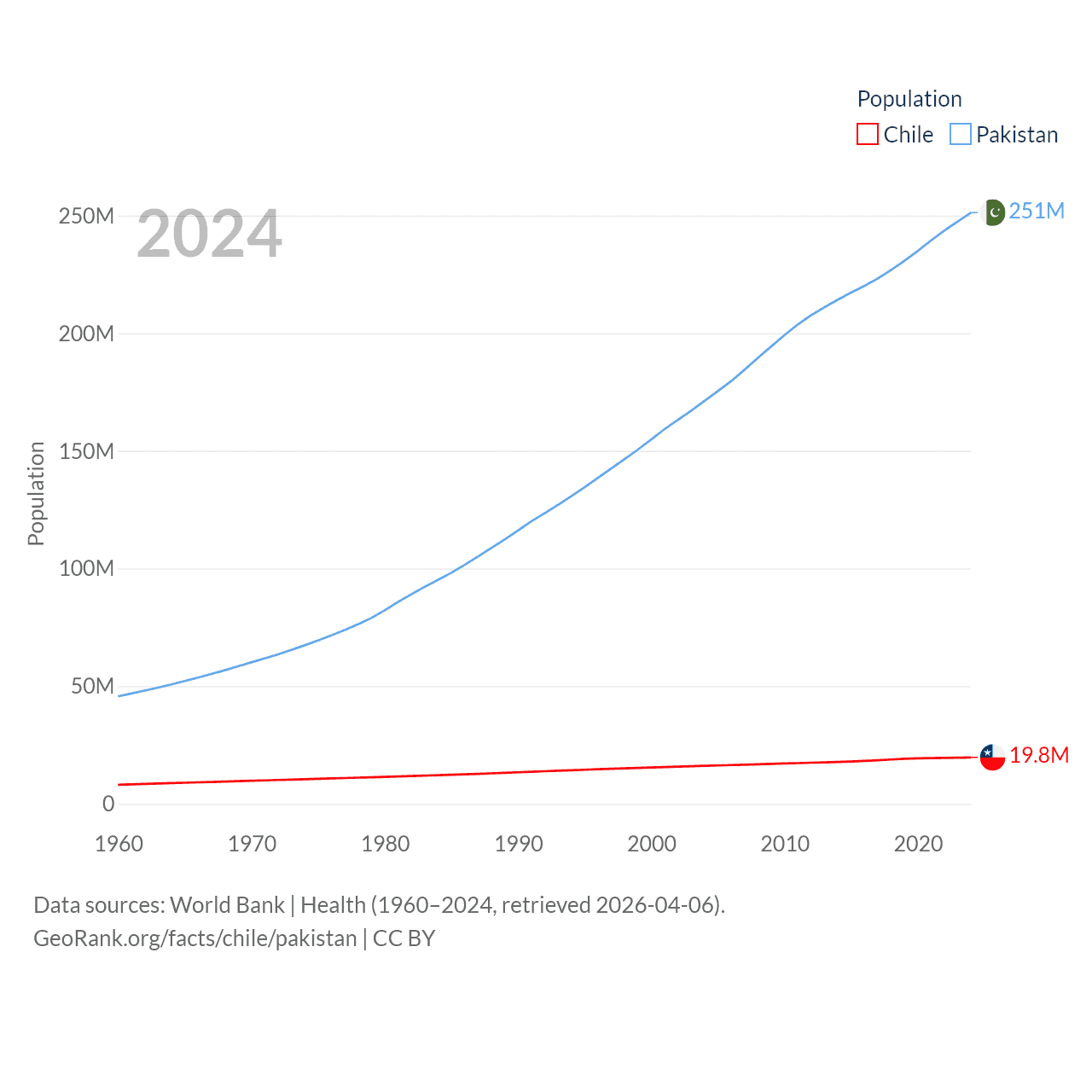 Chile has a population of 19.8M (ranked 66/197), compared with 251M in Pakistan (ranked 5/197). Chile's land area is 286,809 sq mi versus 297,638 sq mi for Pakistan (ranked 38th vs. 35th).