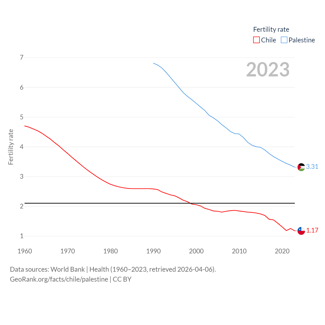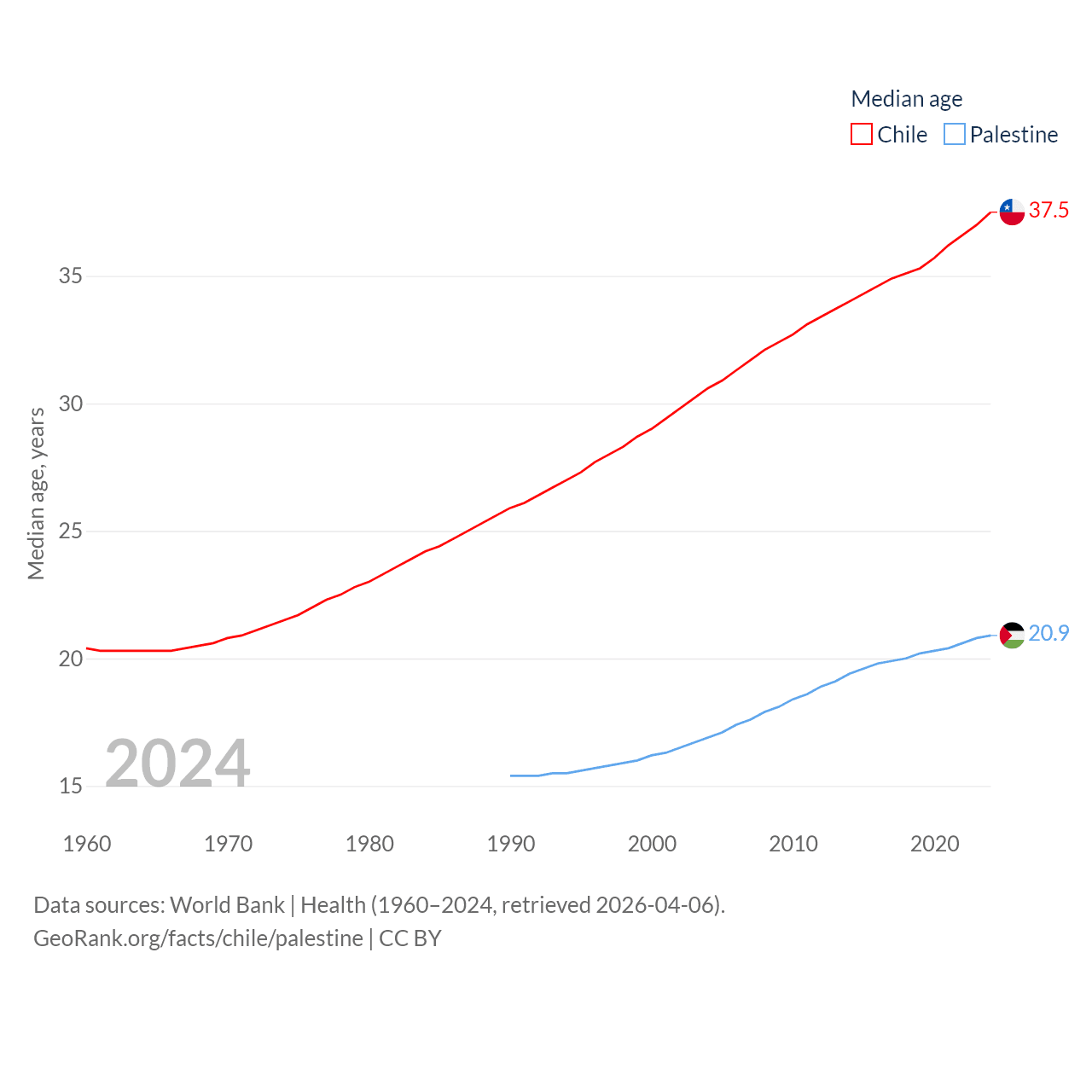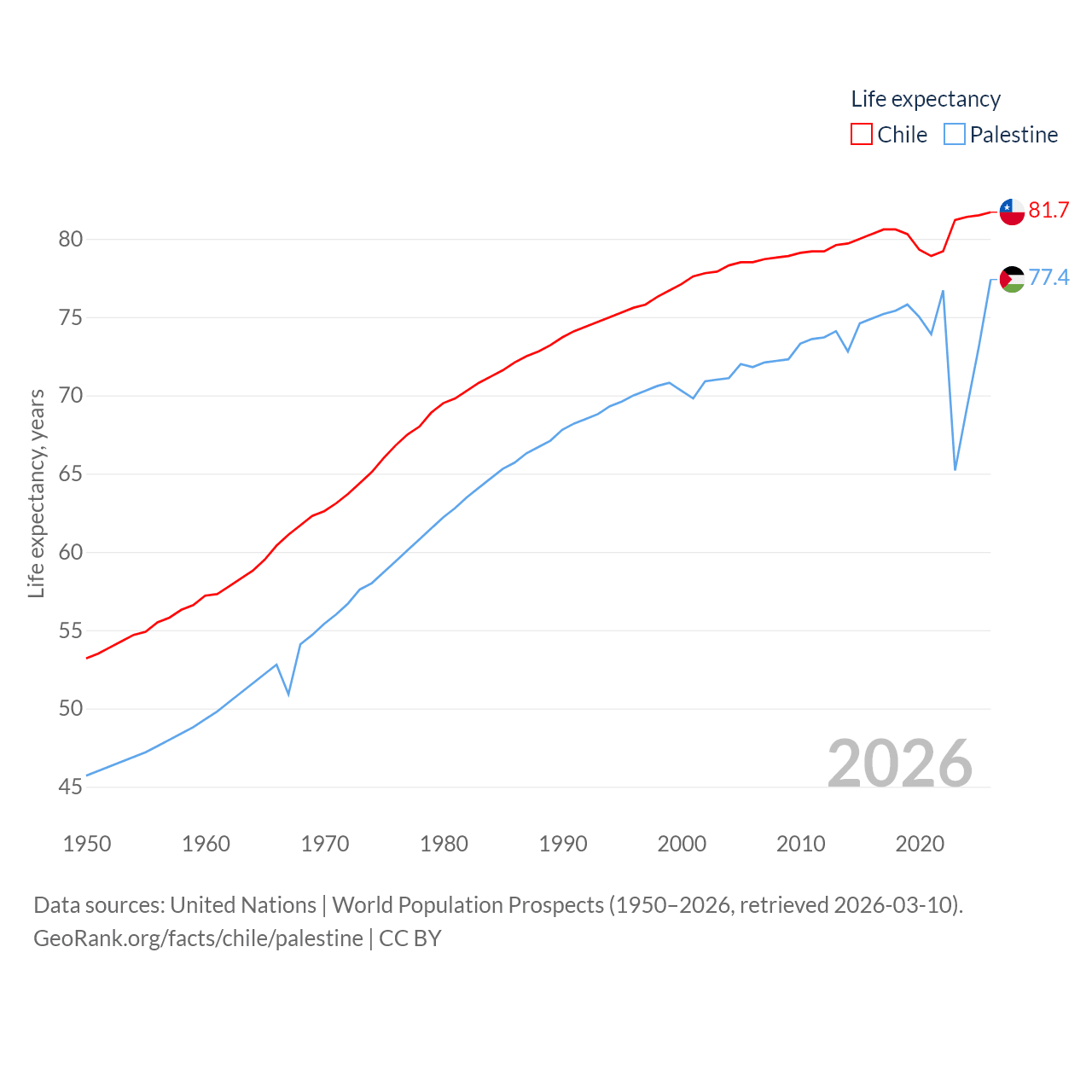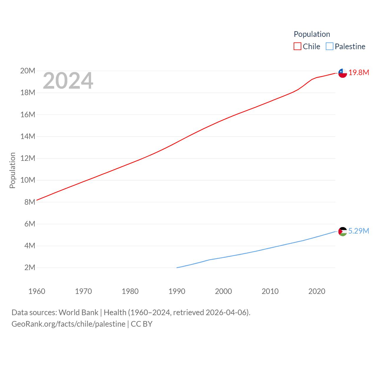 Chile has a population of 19.8M (ranked 66/197), compared with 5.29M in Palestine (ranked 122/197). Chile's land area is 286,809 sq mi versus 2,326 sq mi for Palestine (ranked 38th vs. 164th).