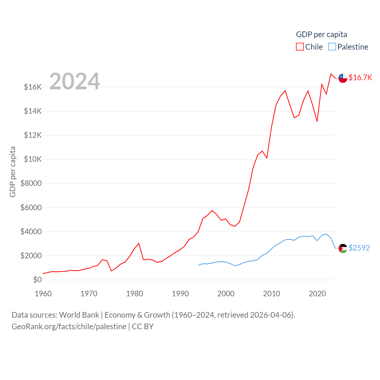 By GDP, Chile ranks 45/197 ($330B) and Palestine ranks 146/197 ($13.7B). By GDP per capita, Chile ranks 65/197 ($16,710), while Palestine ranks 147/197 ($2,592).