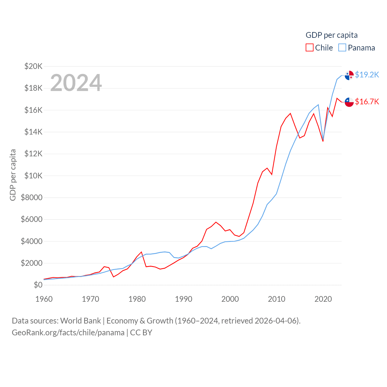 By GDP, Chile ranks 45/197 ($330B) and Panama ranks 78/197 ($86.5B). By GDP per capita, Chile ranks 65/197 ($16,710), while Panama ranks 60/197 ($19,161).