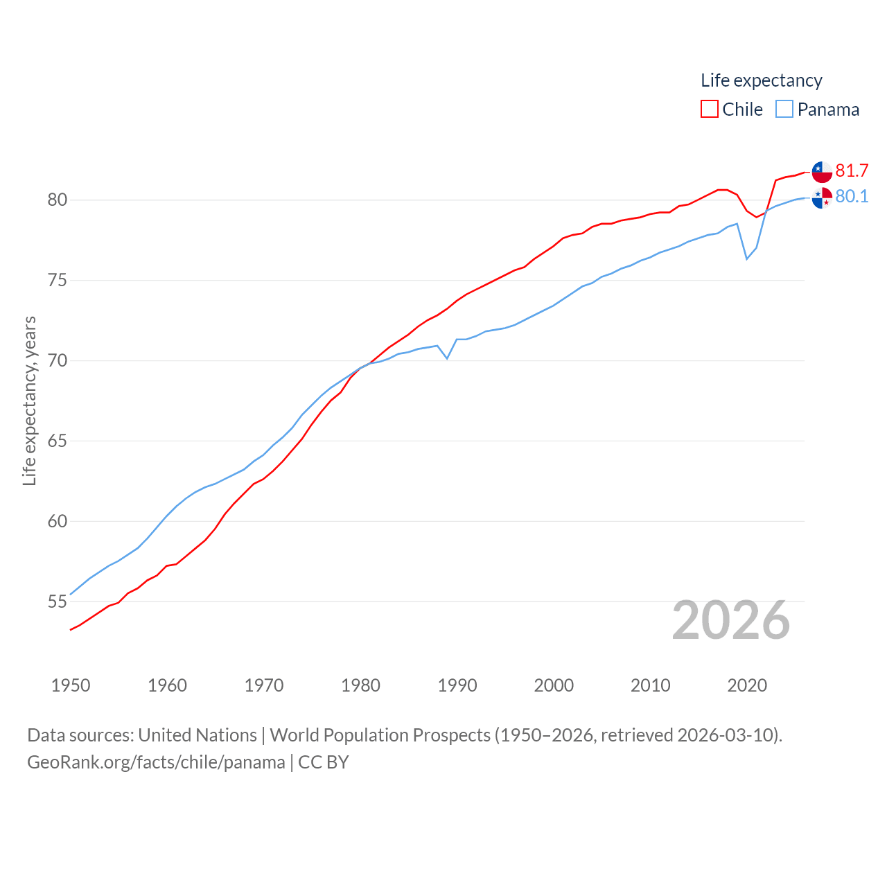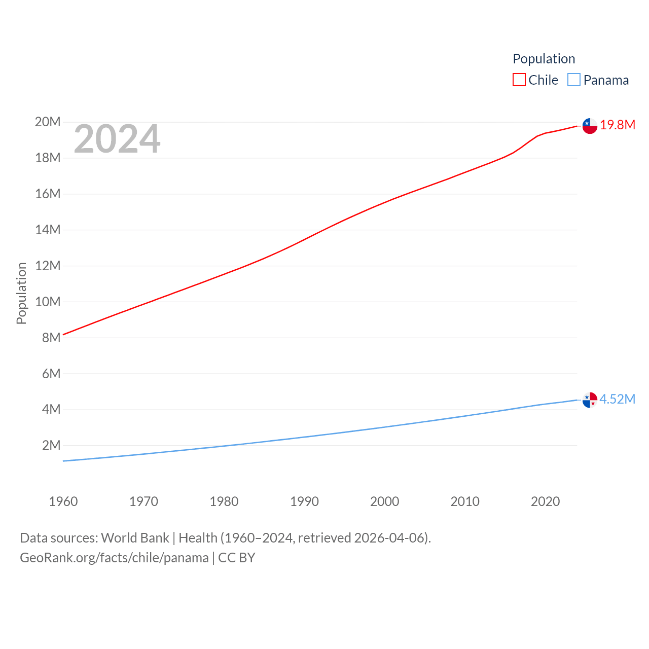 Chile has a population of 19.8M (ranked 66/197), compared with 4.52M in Panama (ranked 128/197). Chile's land area is 286,809 sq mi versus 28,641 sq mi for Panama (ranked 38th vs. 115th).