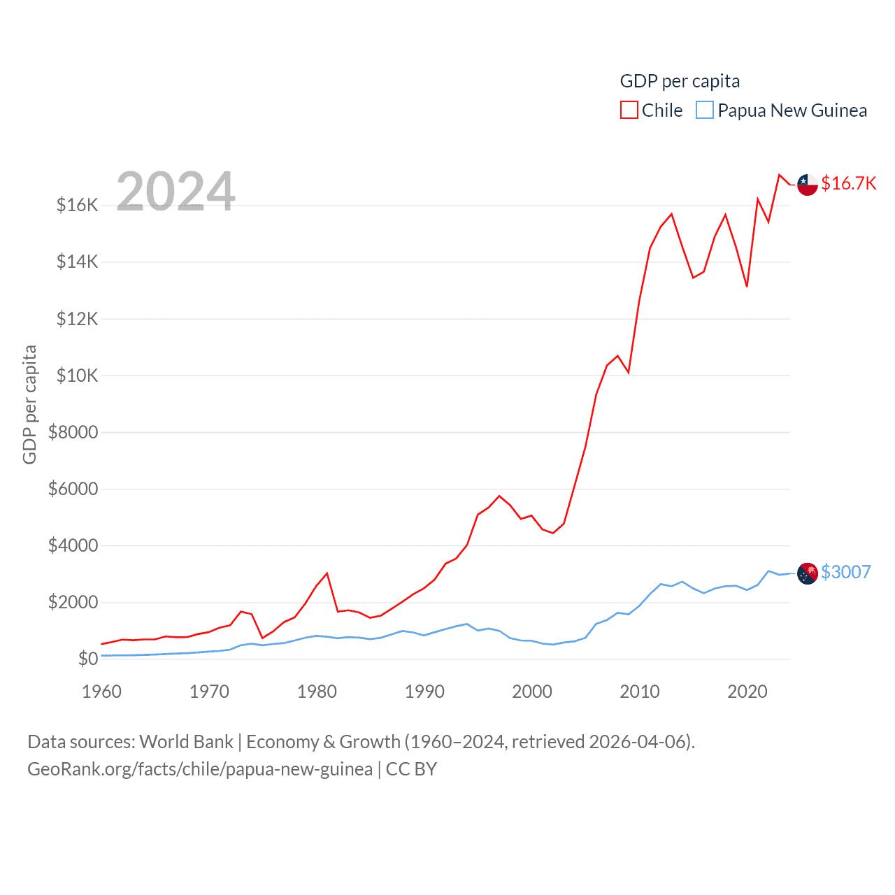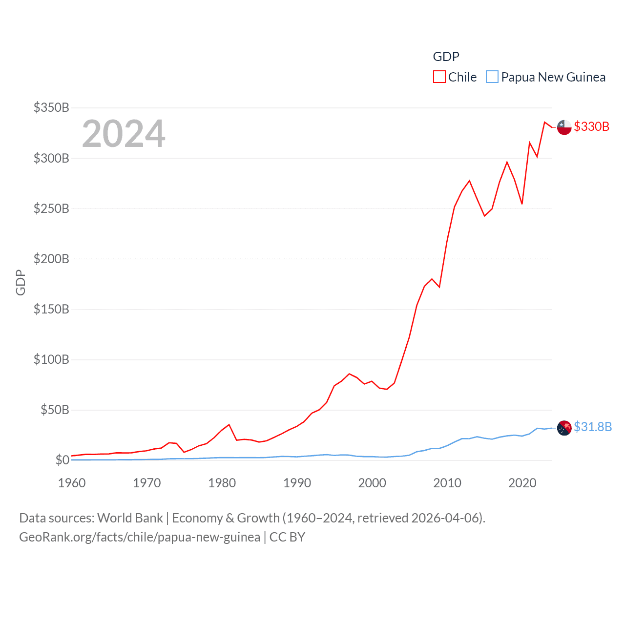 By GDP, Chile ranks 45/197 ($330B) and Papua New Guinea ranks 110/197 ($31.8B). By GDP per capita, Chile ranks 65/197 ($16,710), while Papua New Guinea ranks 140/197 ($3,007).
