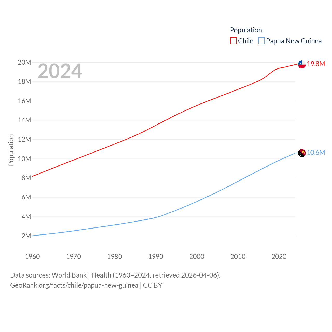 Chile has a population of 19.8M (ranked 66/197), compared with 10.6M in Papua New Guinea (ranked 92/197). Chile's land area is 286,809 sq mi versus 174,850 sq mi for Papua New Guinea (ranked 38th vs. 54th).