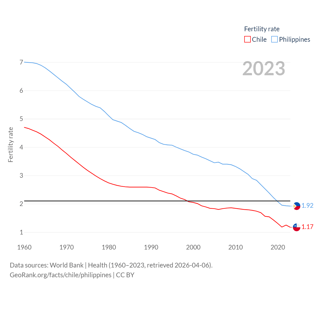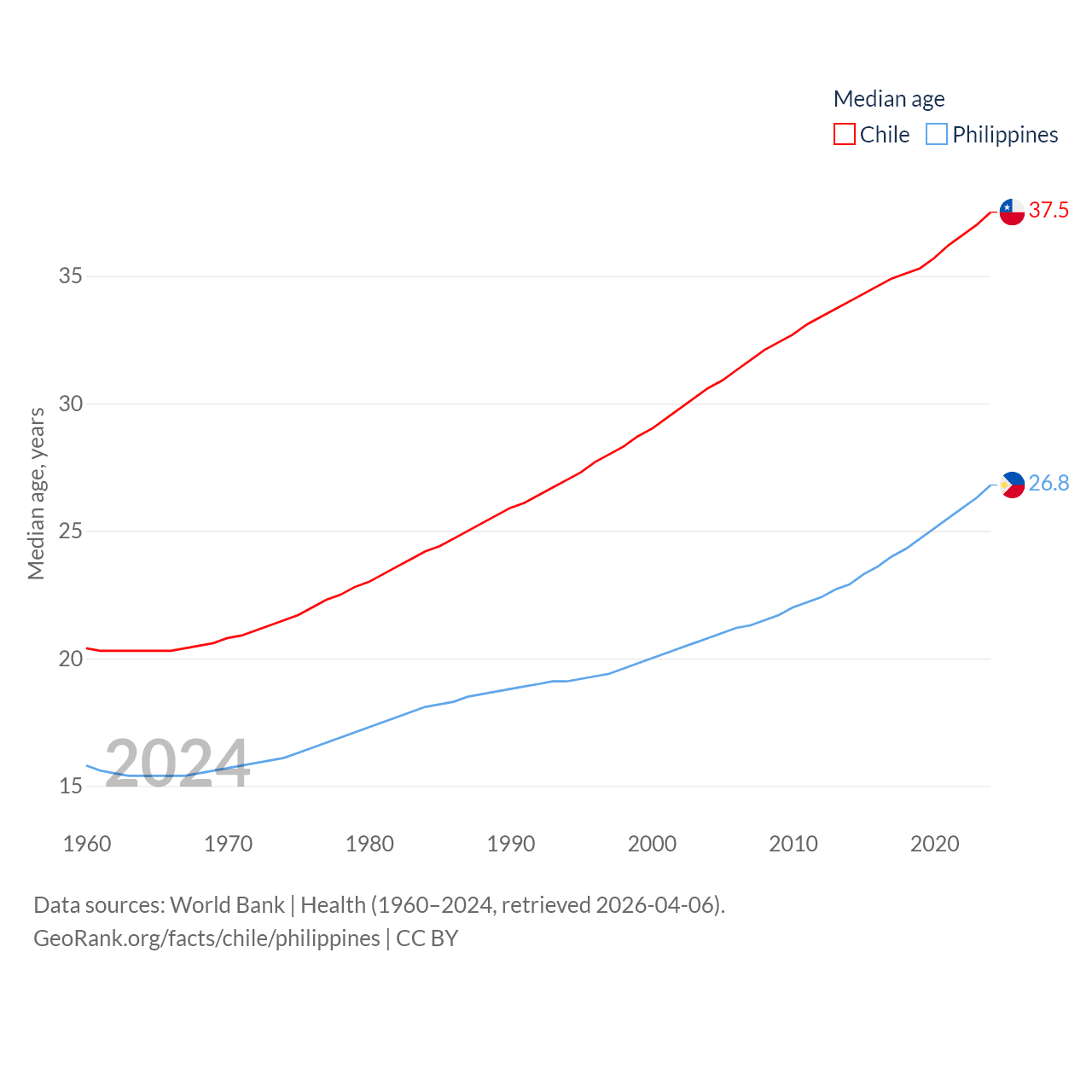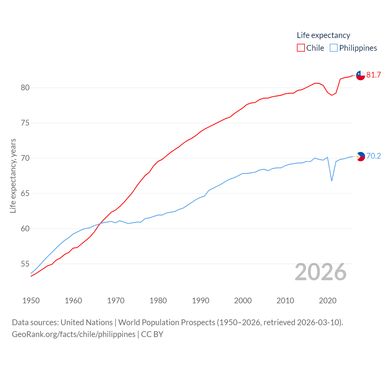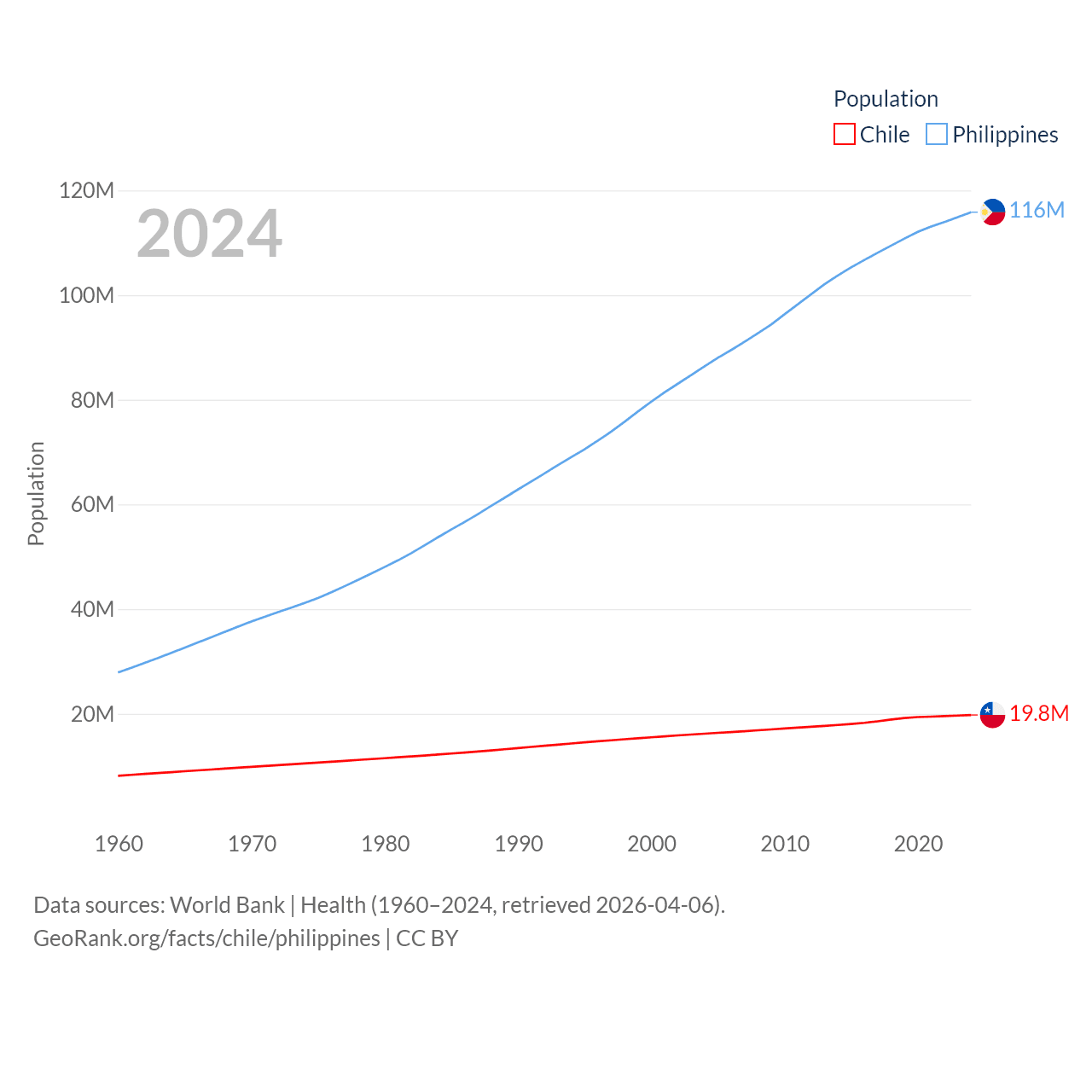 Chile has a population of 19.8M (ranked 66/197), compared with 116M in The Philippines (ranked 14/197). Chile's land area is 286,809 sq mi versus 115,124 sq mi for The Philippines (ranked 38th vs. 71st).