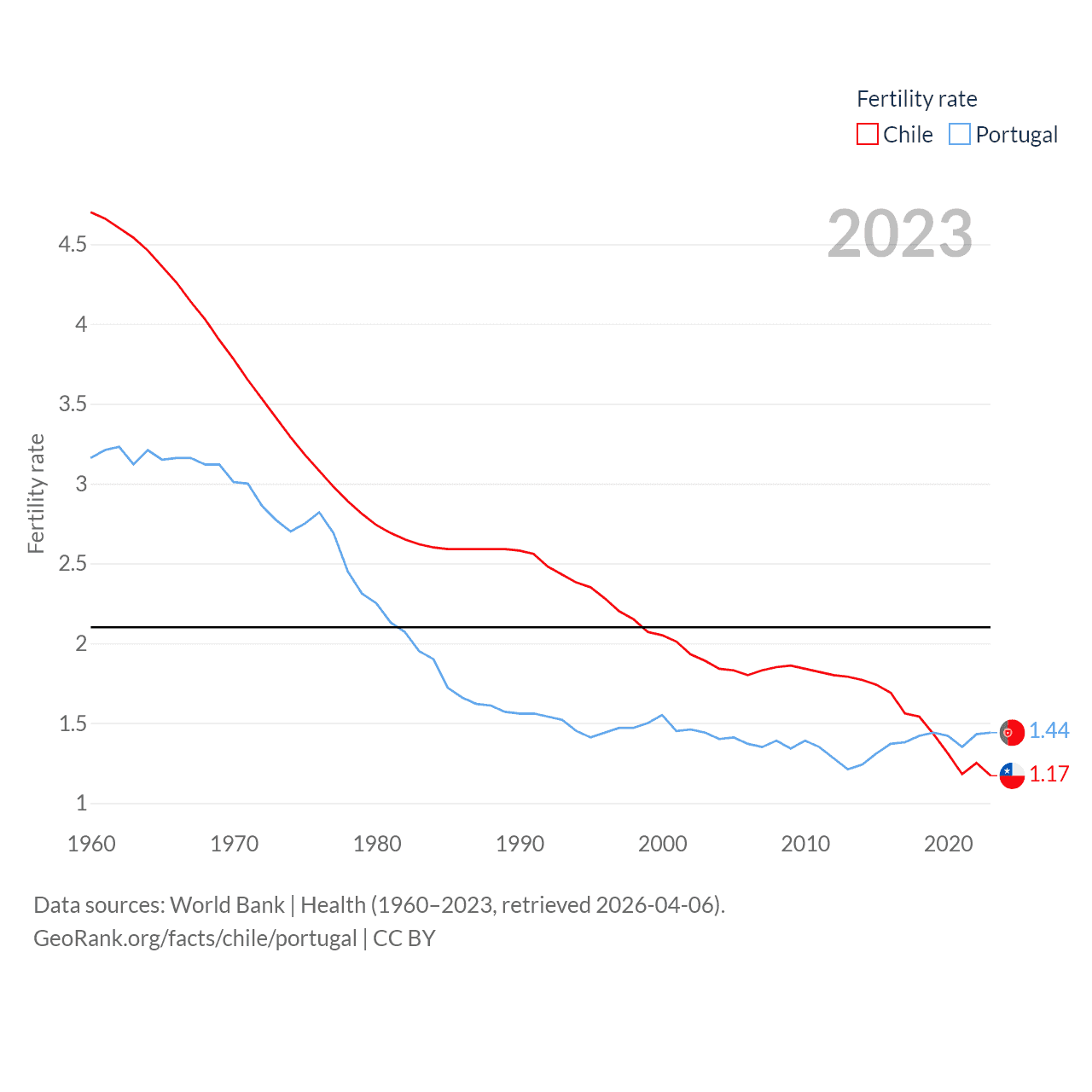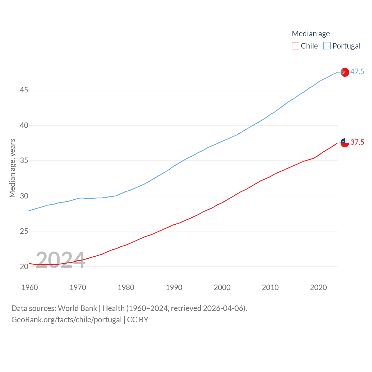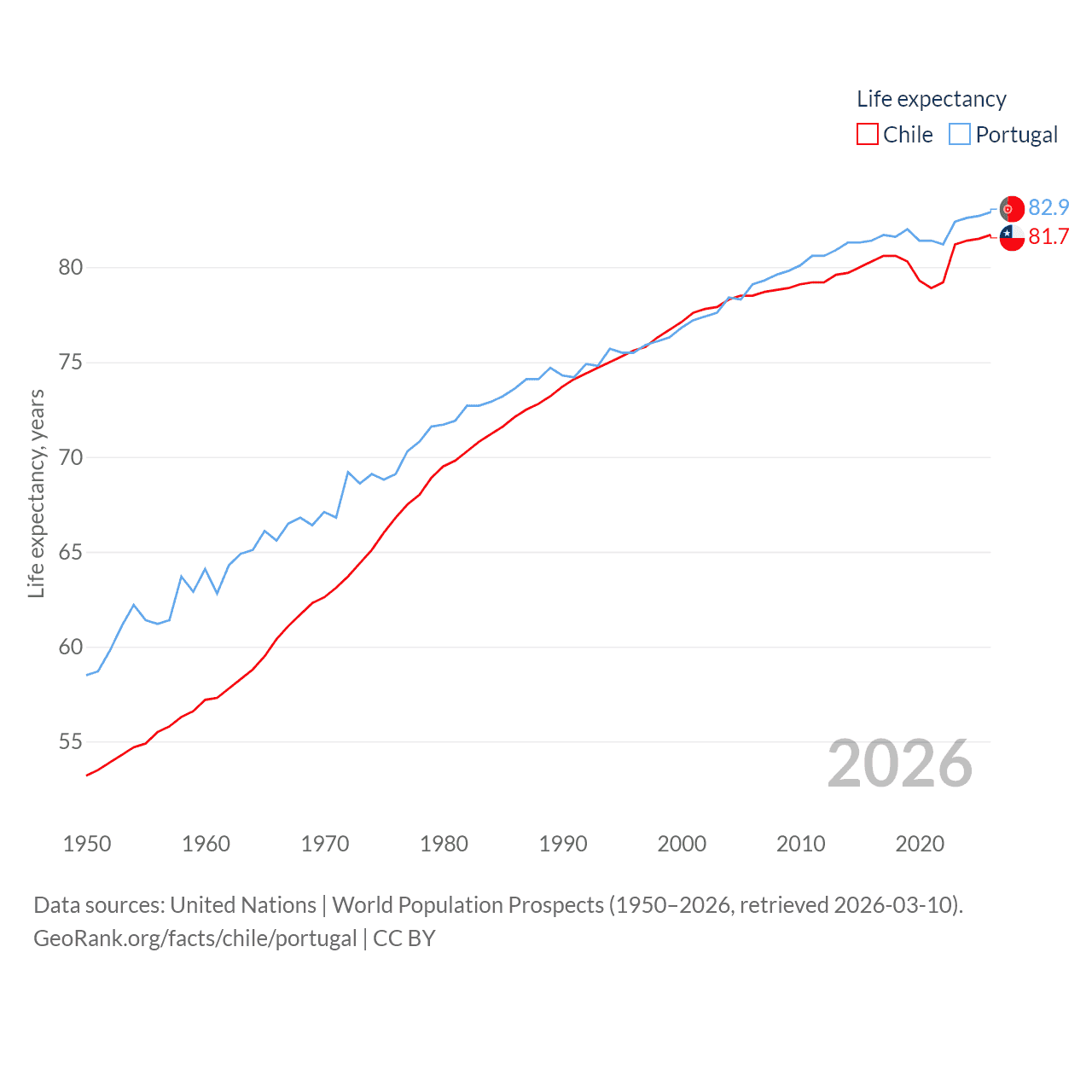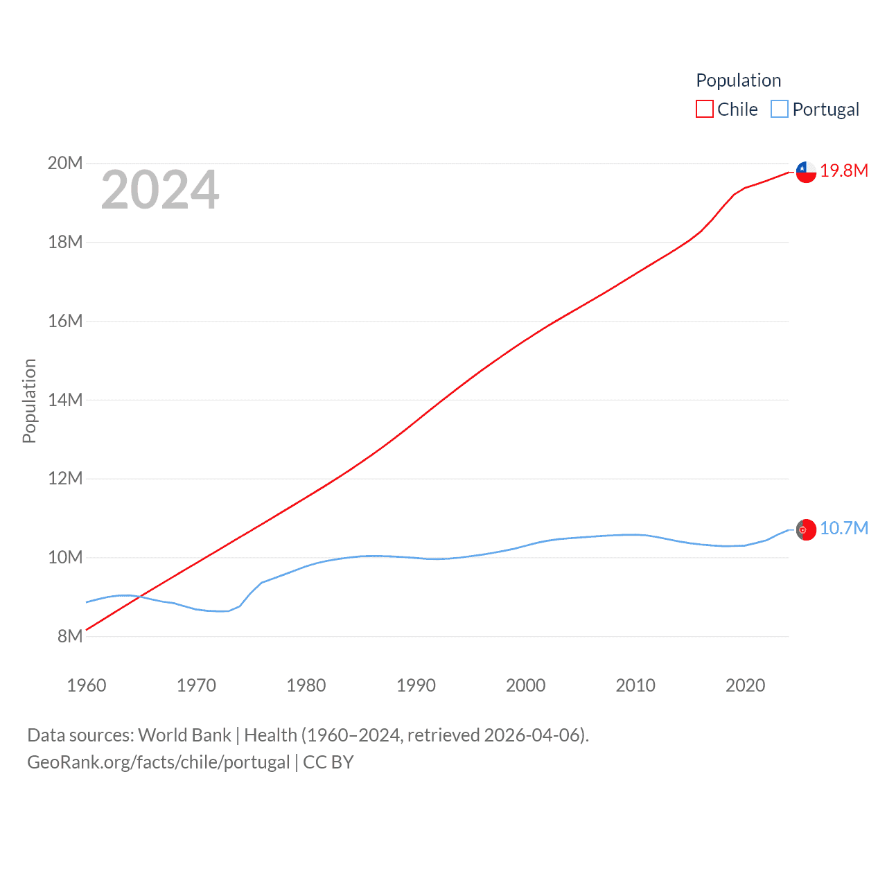 Chile has a population of 19.8M (ranked 66/197), compared with 10.7M in Portugal (ranked 90/197). Chile's land area is 286,809 sq mi versus 35,369 sq mi for Portugal (ranked 38th vs. 108th).