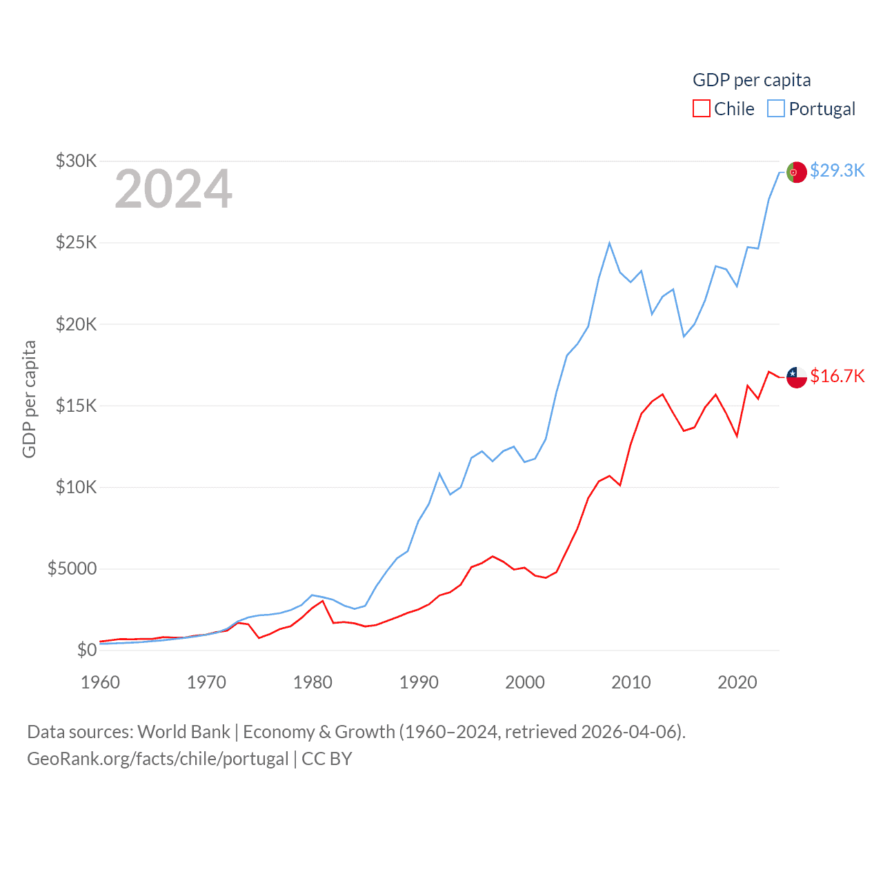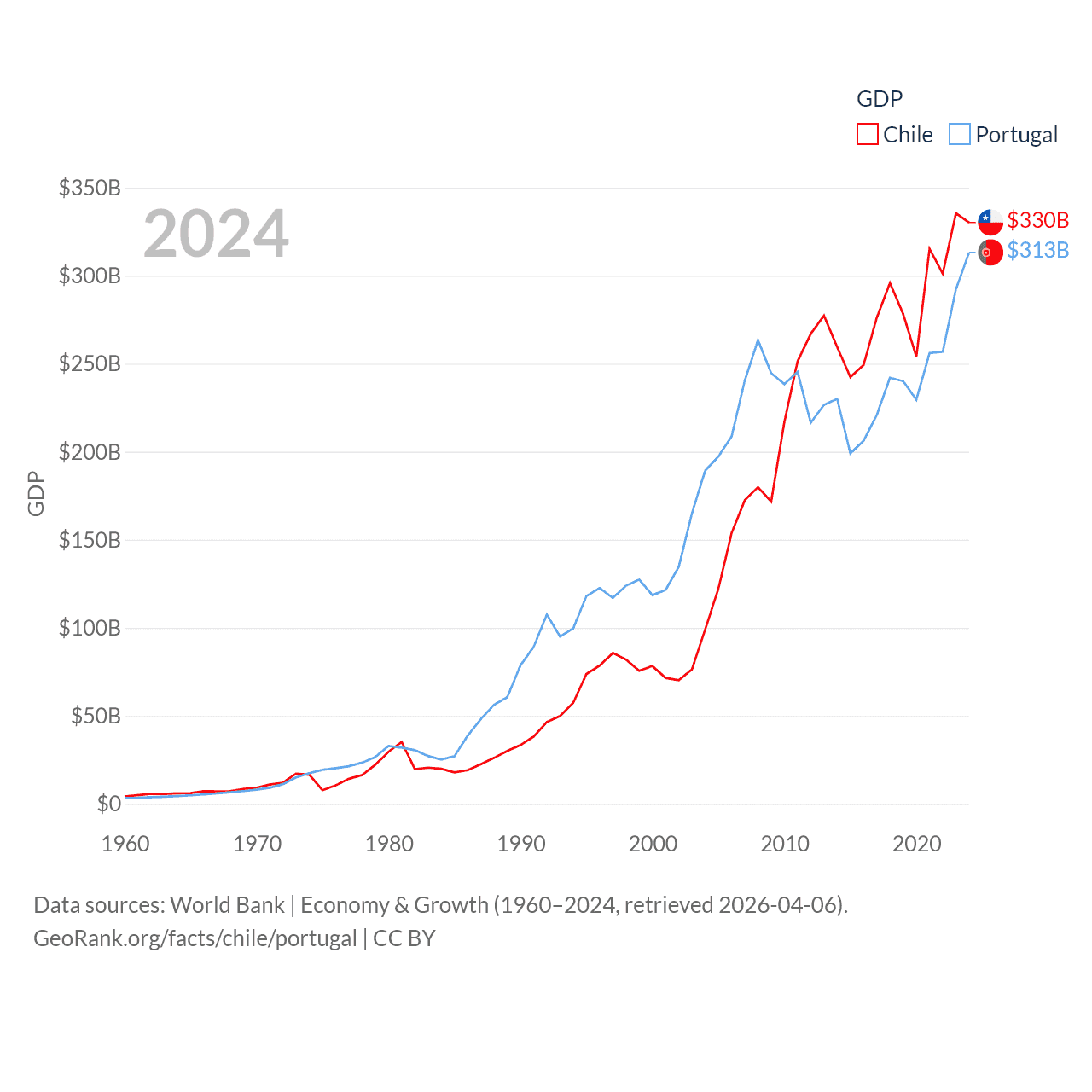 By GDP, Chile ranks 45/197 ($330B) and Portugal ranks 46/197 ($313B). By GDP per capita, Chile ranks 65/197 ($16,710), while Portugal ranks 44/197 ($29,292).