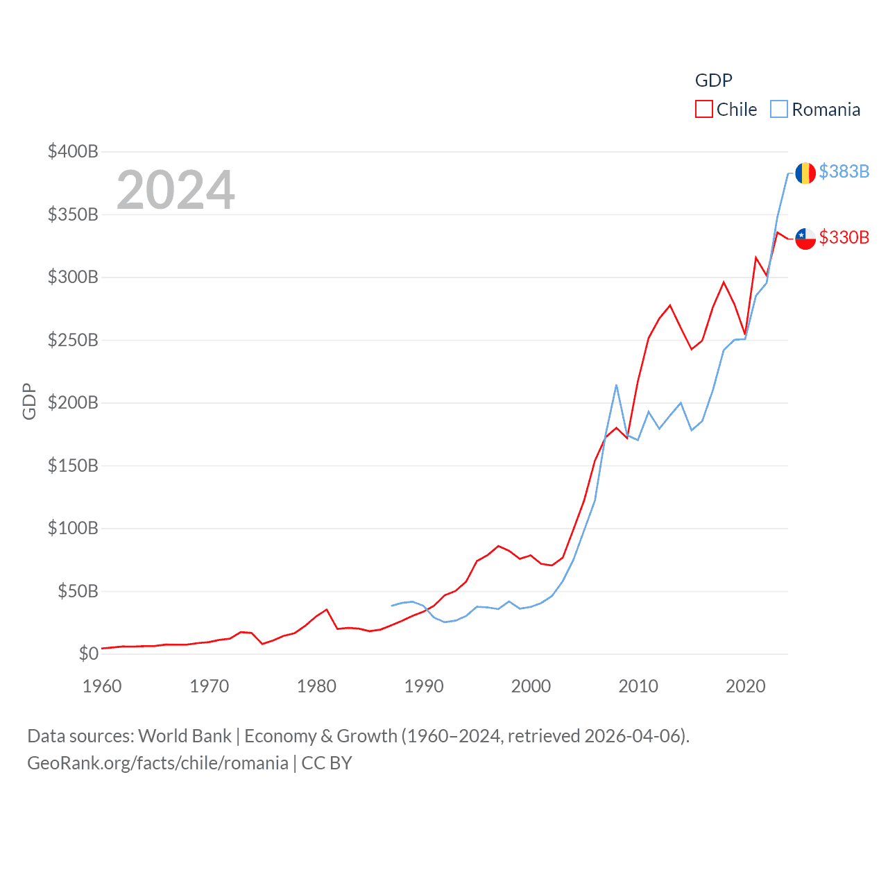 By GDP, Chile ranks 45/197 ($330B) and Romania ranks 42/197 ($383B). By GDP per capita, Chile ranks 65/197 ($16,710), while Romania ranks 58/197 ($20,080).