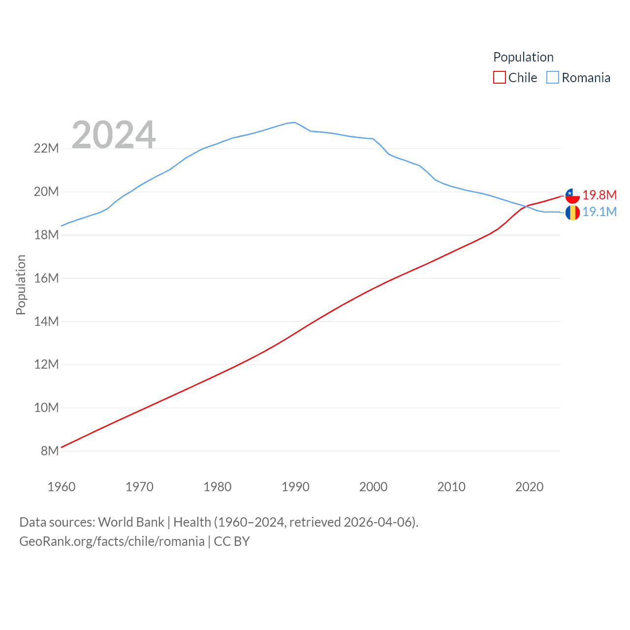 Chile has a population of 19.8M (ranked 66/197), compared with 19.1M in Romania (ranked 67/197). Chile's land area is 286,809 sq mi versus 88,834 sq mi for Romania (ranked 38th vs. 80th).