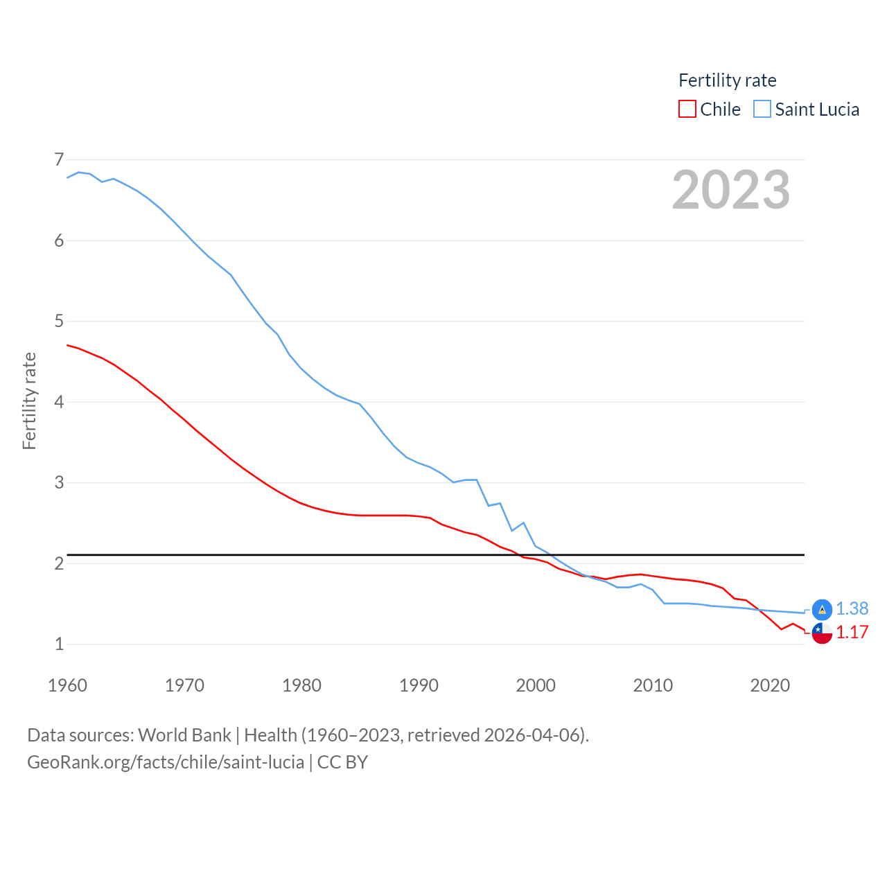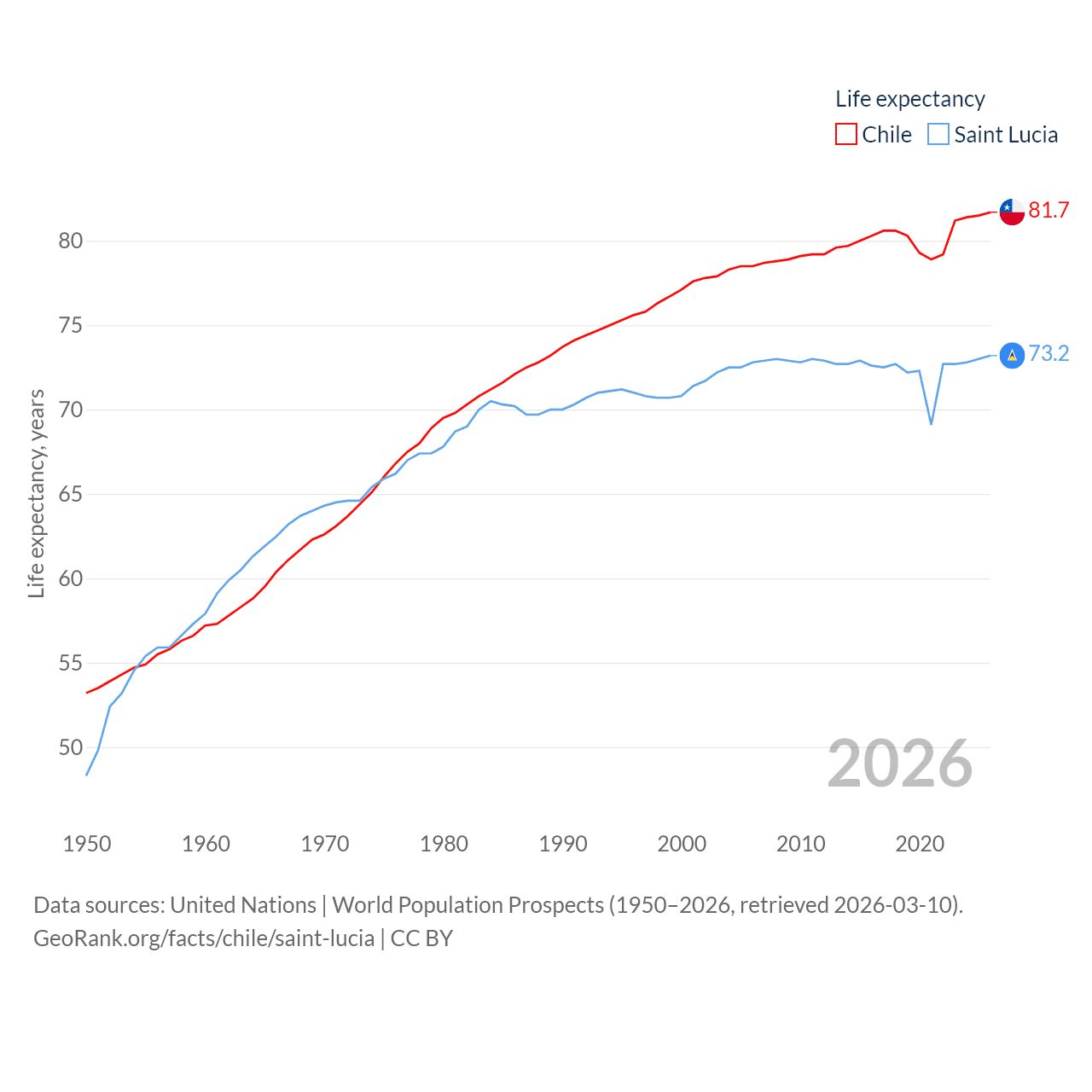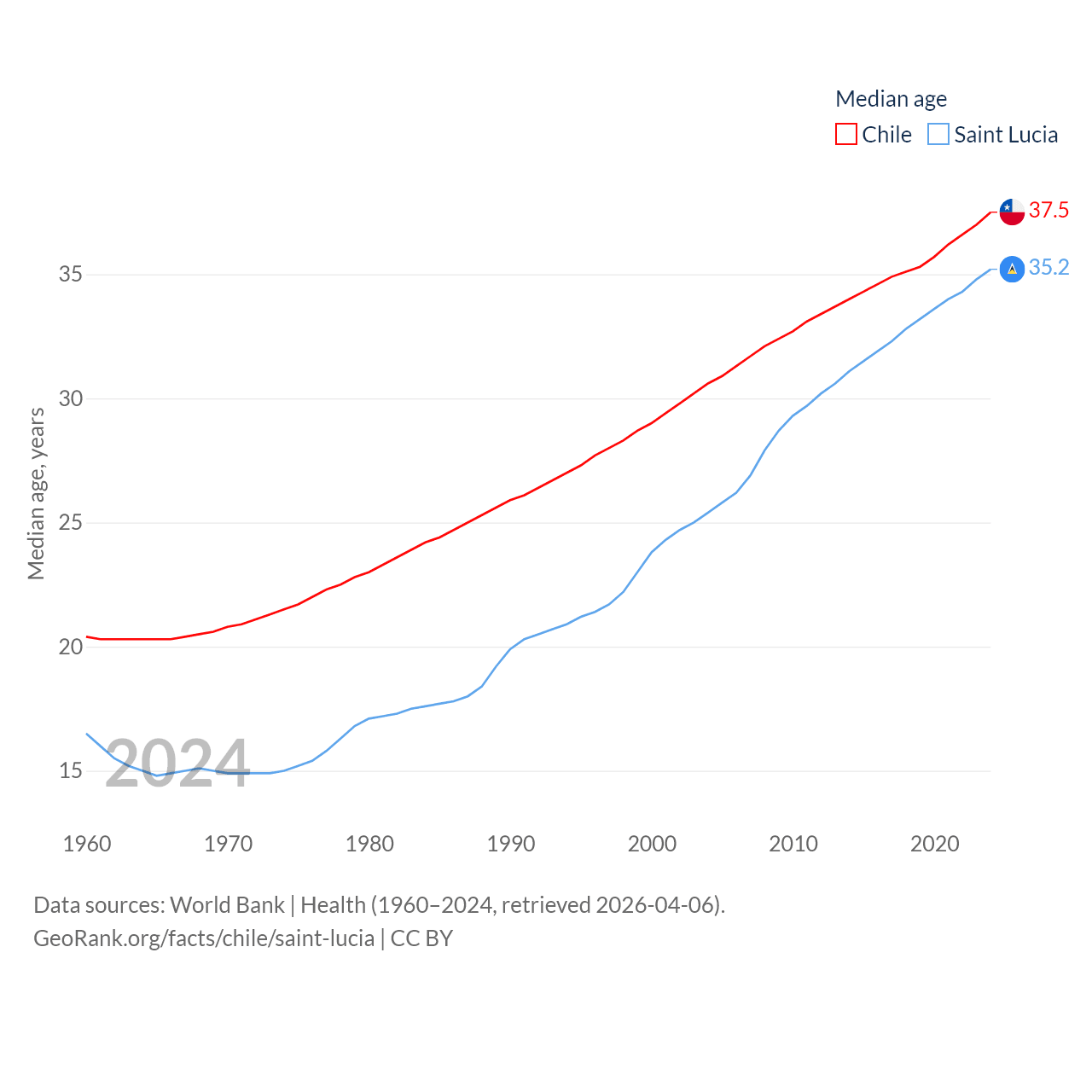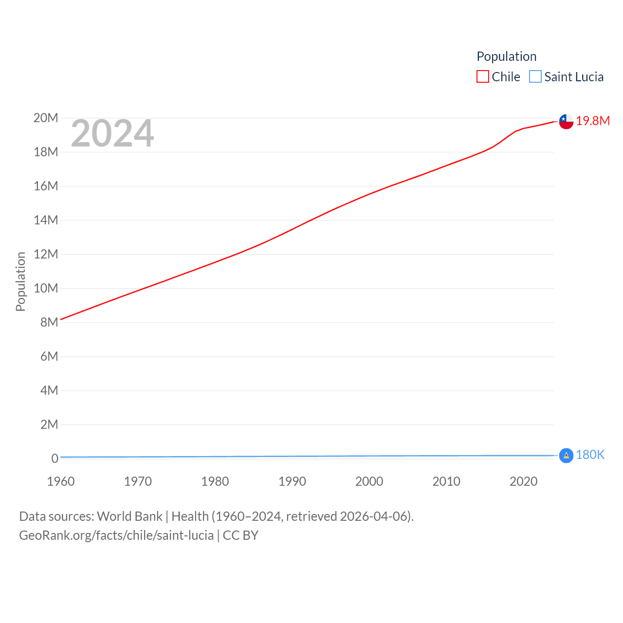 Chile has a population of 19.8M (ranked 66/197), compared with 180K in Saint Lucia (ranked 178/197). Chile's land area is 286,809 sq mi versus 235.5 sq mi for Saint Lucia (ranked 38th vs. 178th).