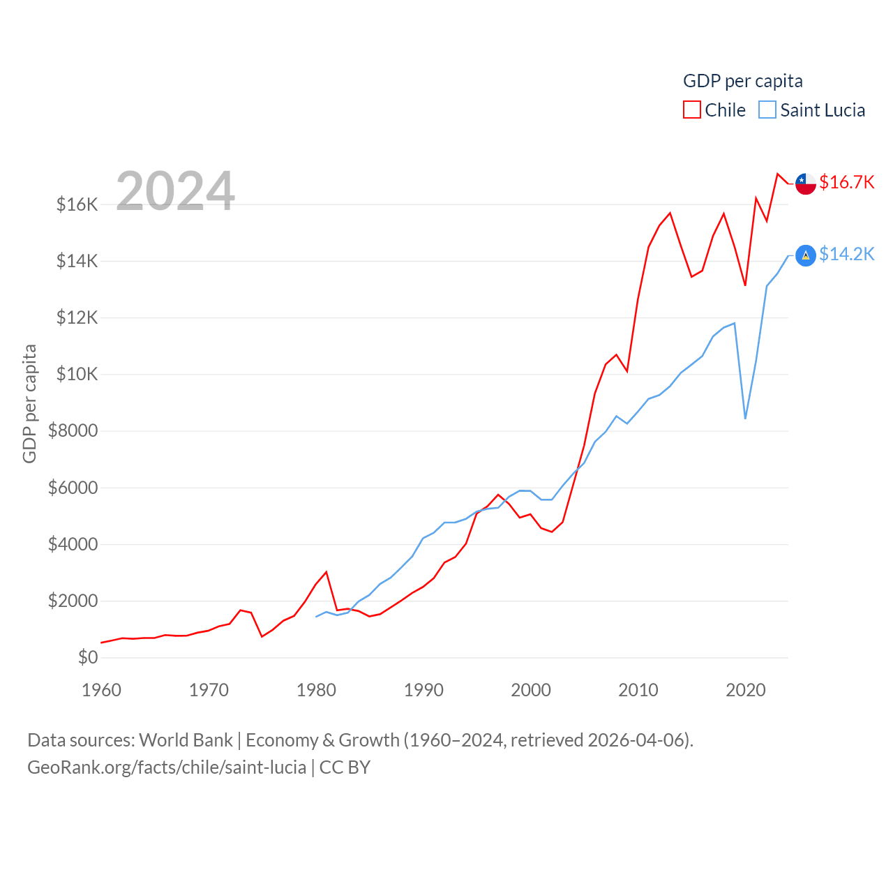 By GDP, Chile ranks 45/197 ($330B) and Saint Lucia ranks 173/197 ($2.55B). By GDP per capita, Chile ranks 65/197 ($16,710), while Saint Lucia ranks 70/197 ($14,182).