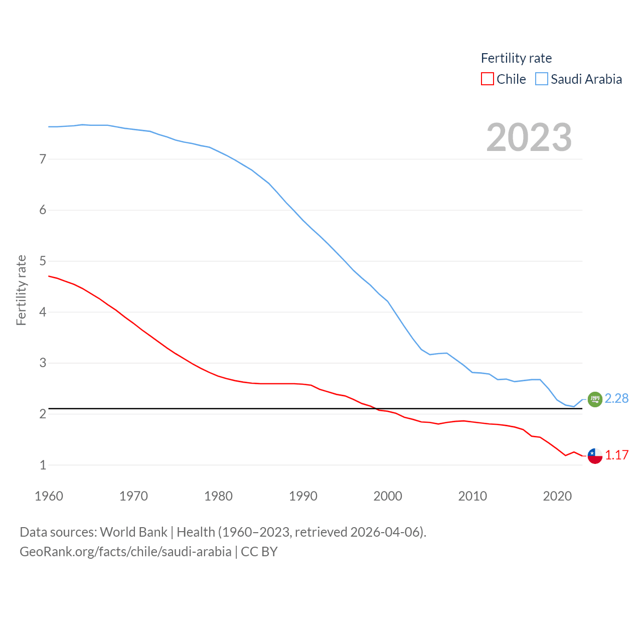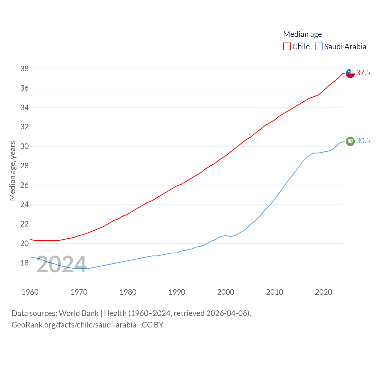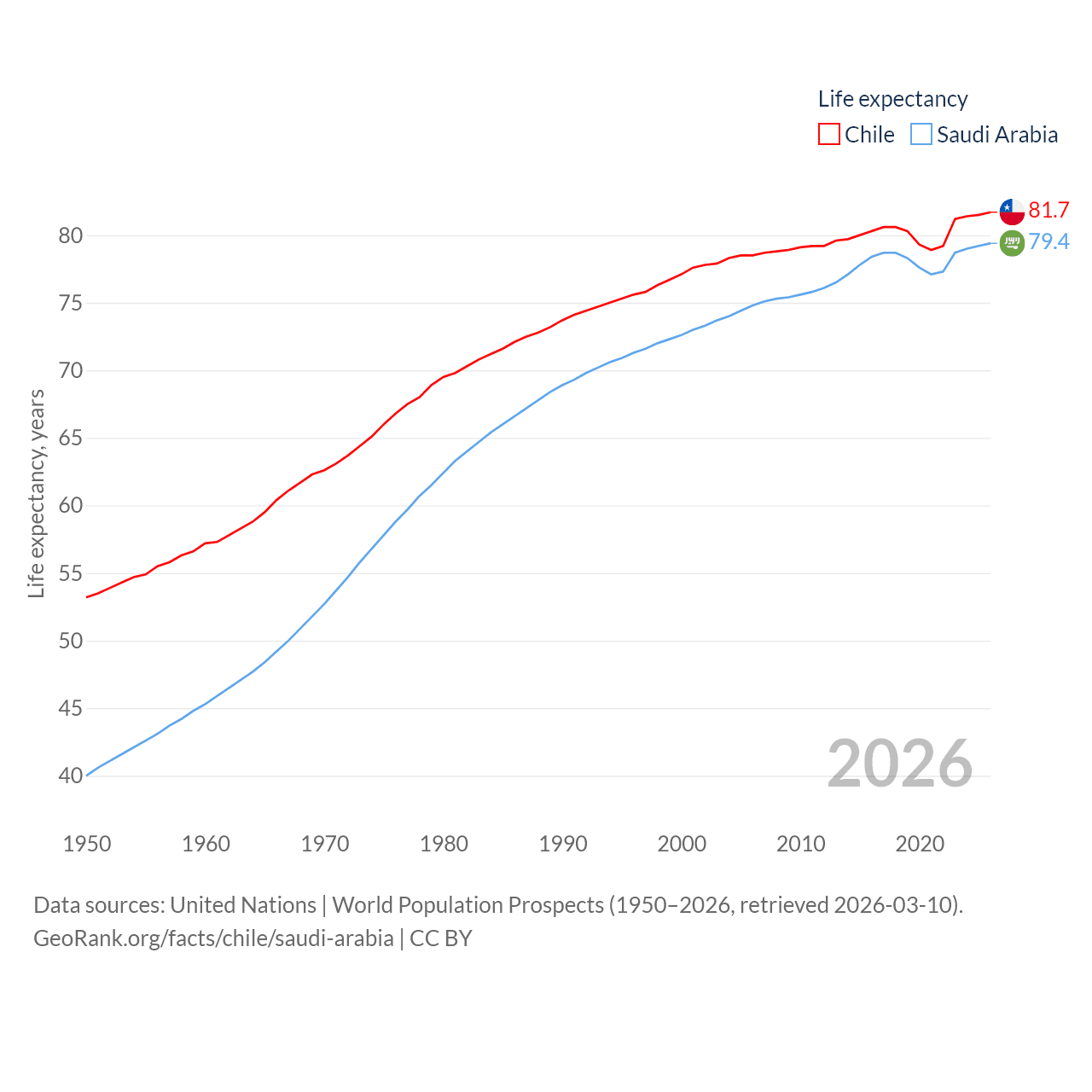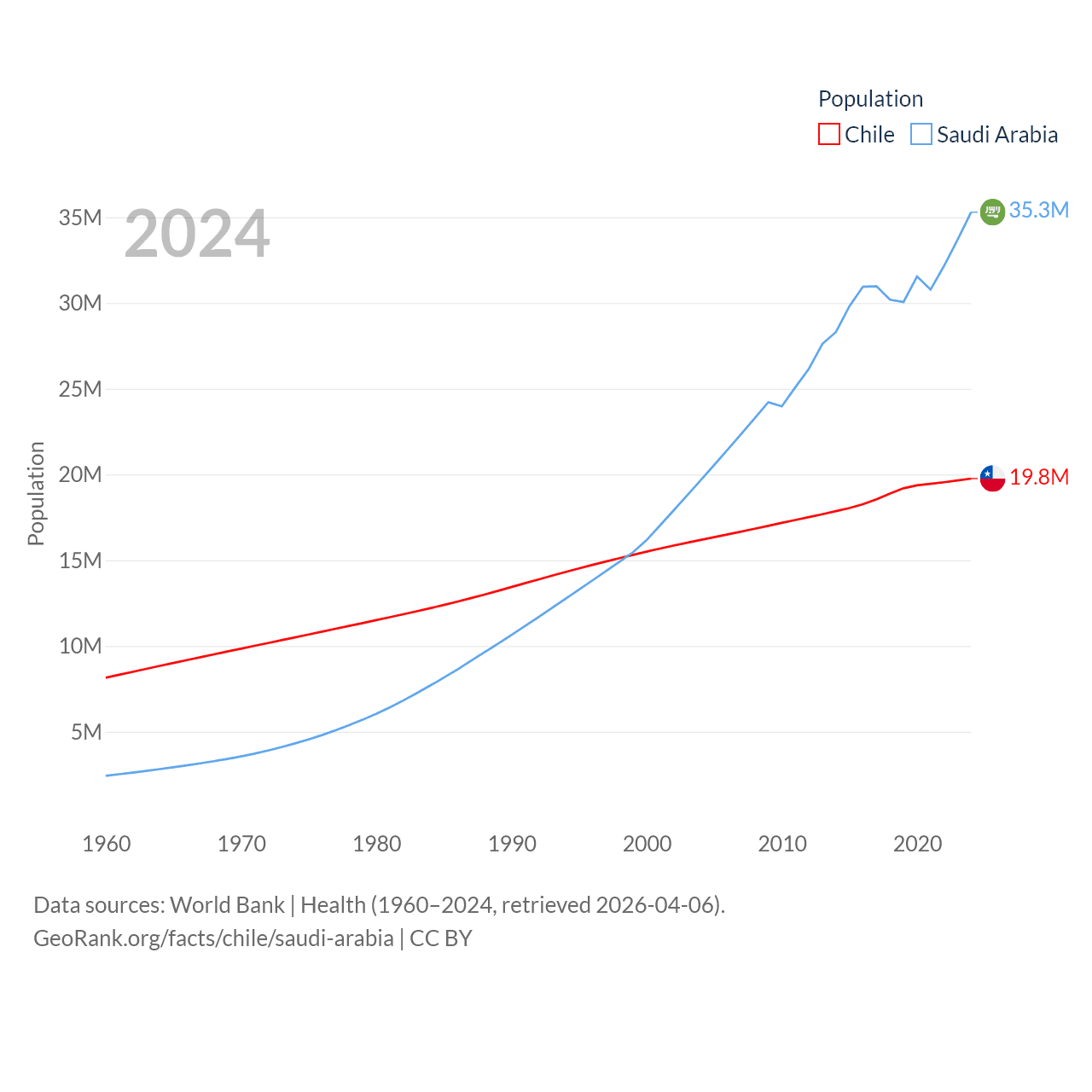 Chile has a population of 19.8M (ranked 66/197), compared with 35.3M in Saudi Arabia (ranked 45/197). Chile's land area is 286,809 sq mi versus 830,000 sq mi for Saudi Arabia (ranked 38th vs. 12th).