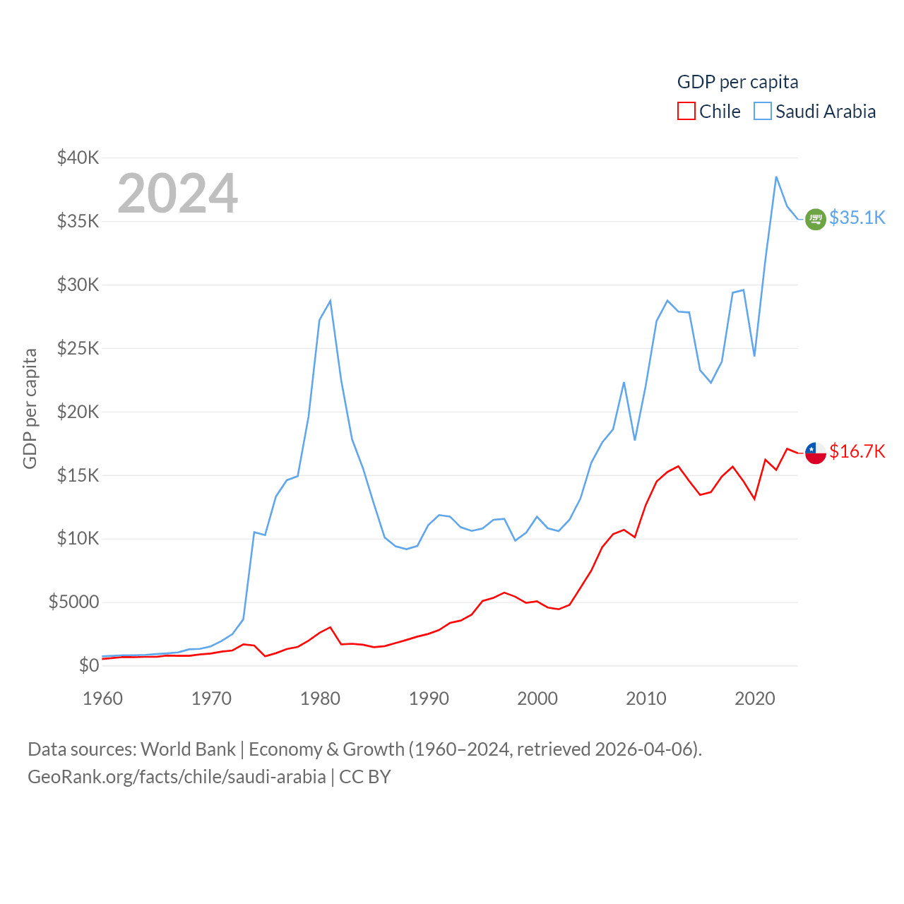 By GDP, Chile ranks 45/197 ($330B) and Saudi Arabia ranks 18/197 ($1.24T). By GDP per capita, Chile ranks 65/197 ($16,710), while Saudi Arabia ranks 33/197 ($35,122).