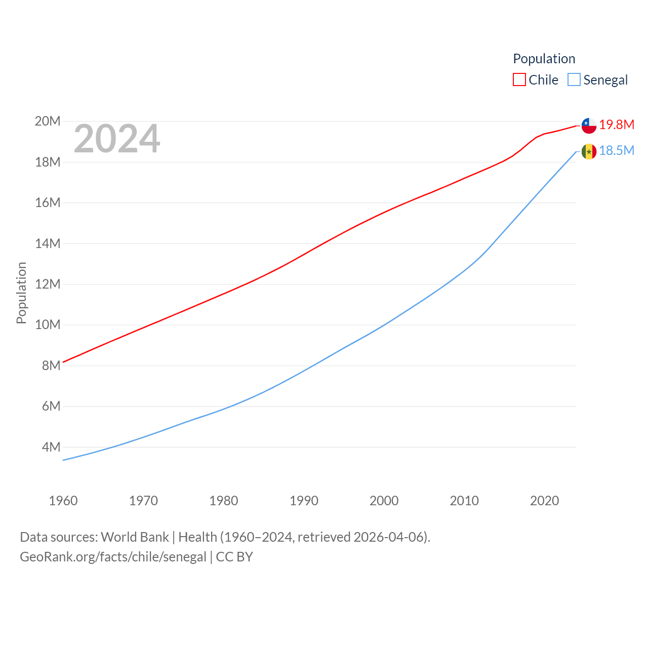Chile has a population of 19.8M (ranked 66/197), compared with 18.5M in Senegal (ranked 69/197). Chile's land area is 286,809 sq mi versus 74,336 sq mi for Senegal (ranked 38th vs. 85th).