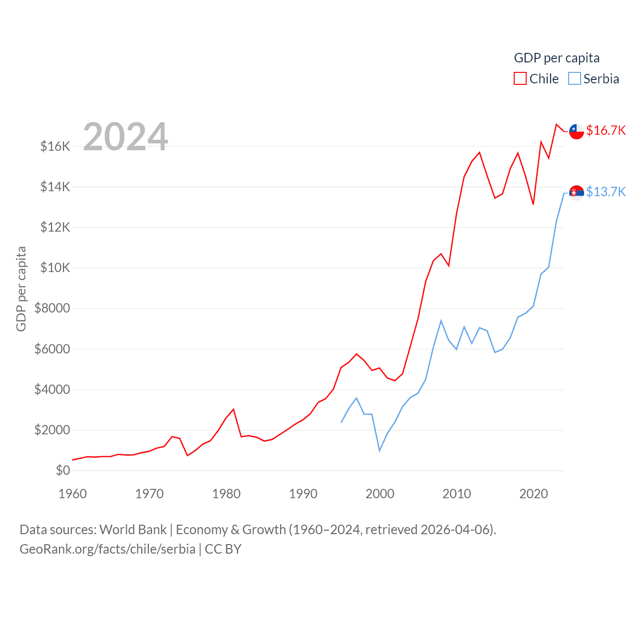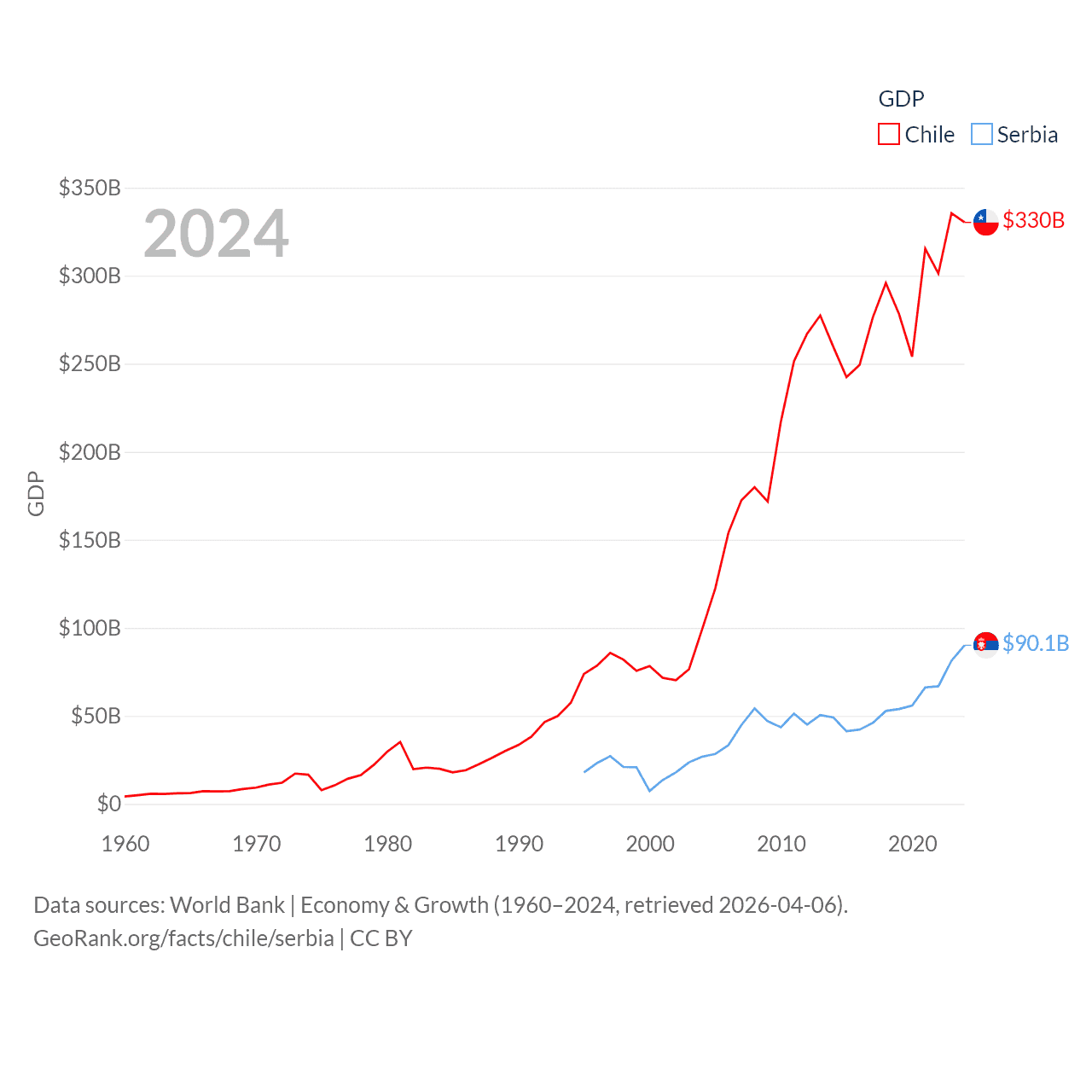 By GDP, Chile ranks 45/197 ($330B) and Serbia ranks 76/197 ($90.1B). By GDP per capita, Chile ranks 65/197 ($16,710), while Serbia ranks 73/197 ($13,679).