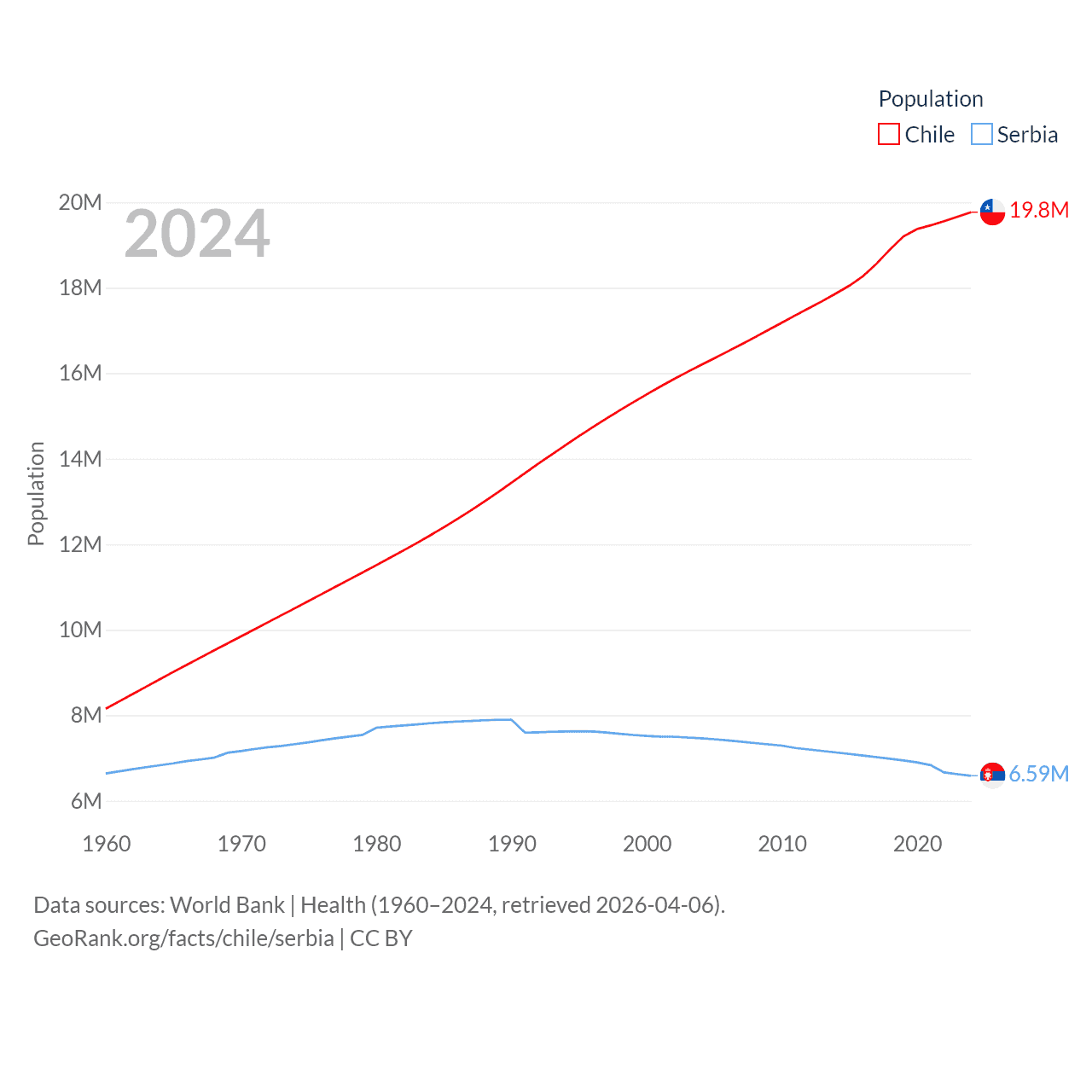 Chile has a population of 19.8M (ranked 66/197), compared with 6.59M in Serbia (ranked 109/197). Chile's land area is 286,809 sq mi versus 32,467 sq mi for Serbia (ranked 38th vs. 111th).