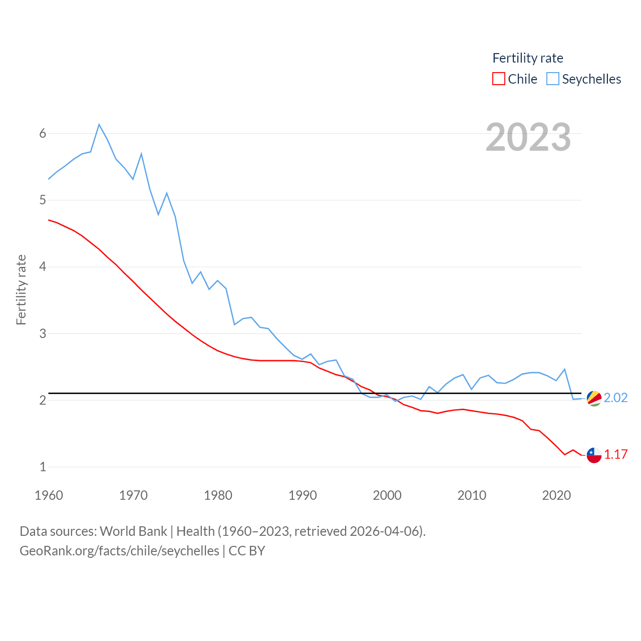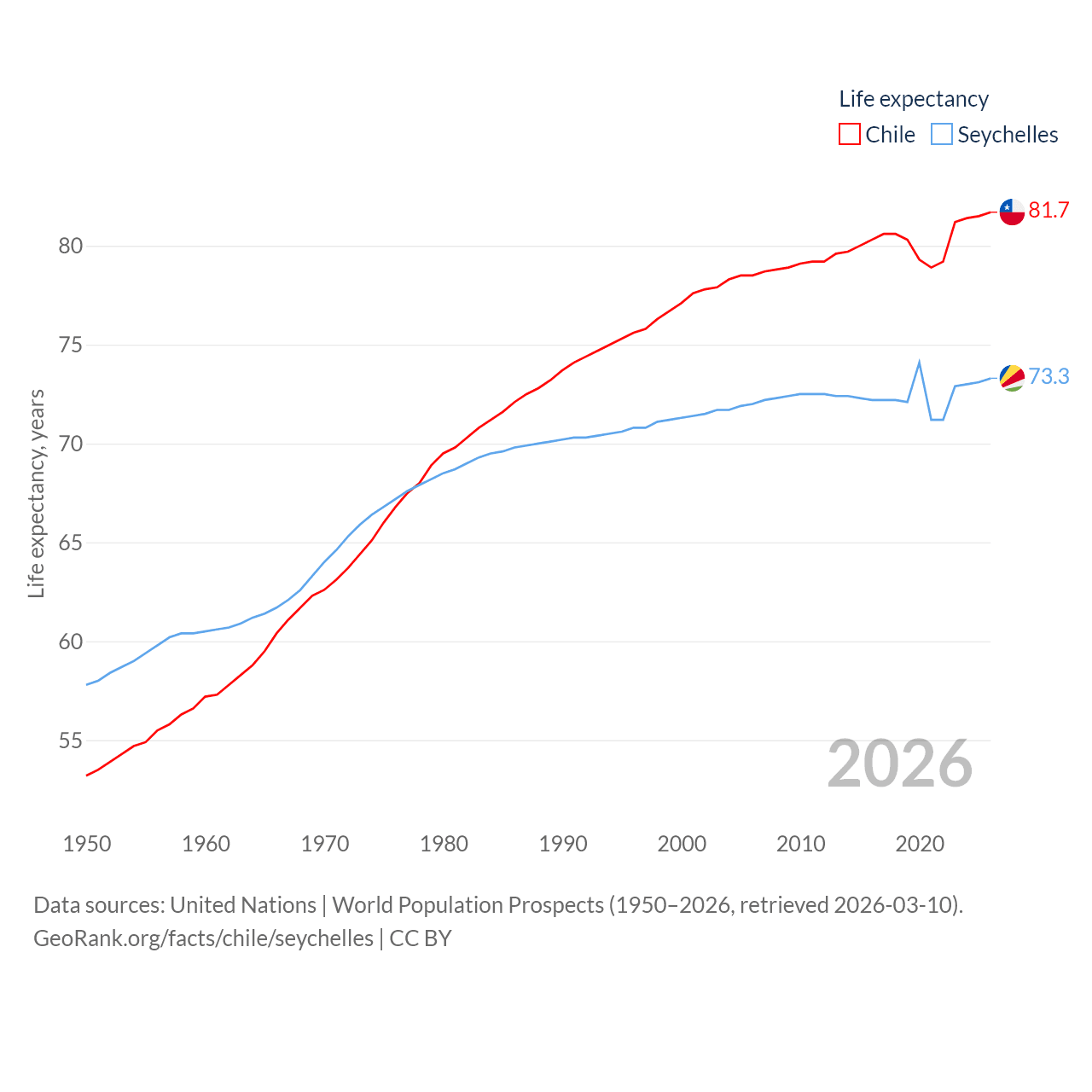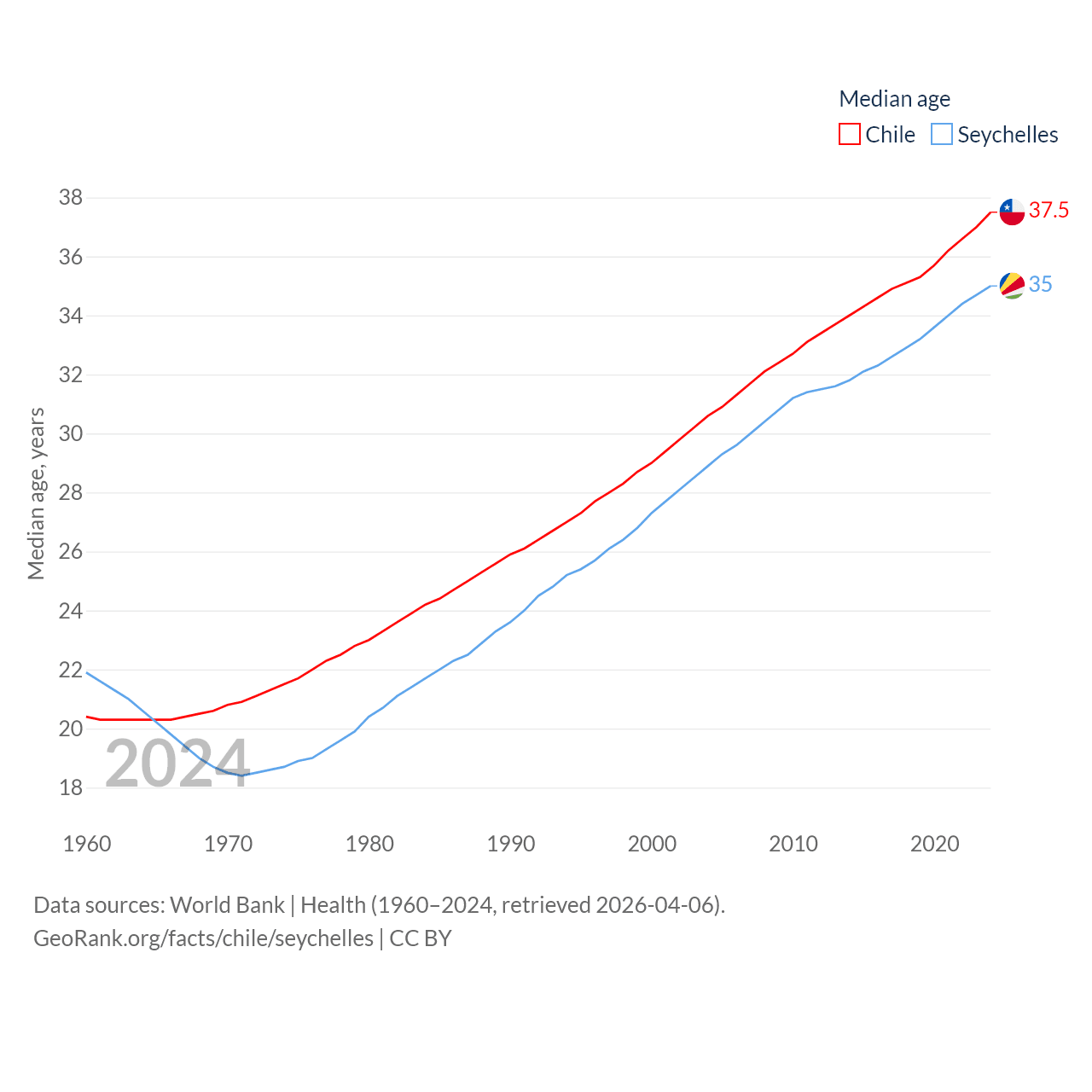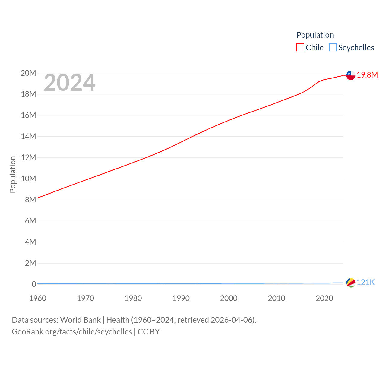 Chile has a population of 19.8M (ranked 66/197), compared with 121K in The Seychelles (ranked 181/197). Chile's land area is 286,809 sq mi versus 177.6 sq mi for The Seychelles (ranked 38th vs. 181st).