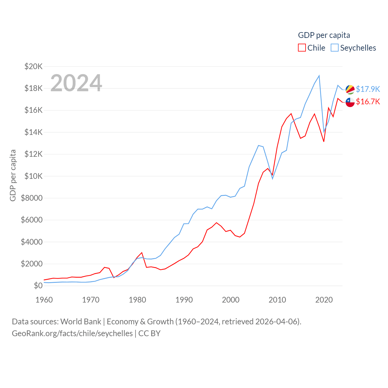 By GDP, Chile ranks 45/197 ($330B) and The Seychelles ranks 178/197 ($2.17B). By GDP per capita, Chile ranks 65/197 ($16,710), while The Seychelles ranks 63/197 ($17,859).