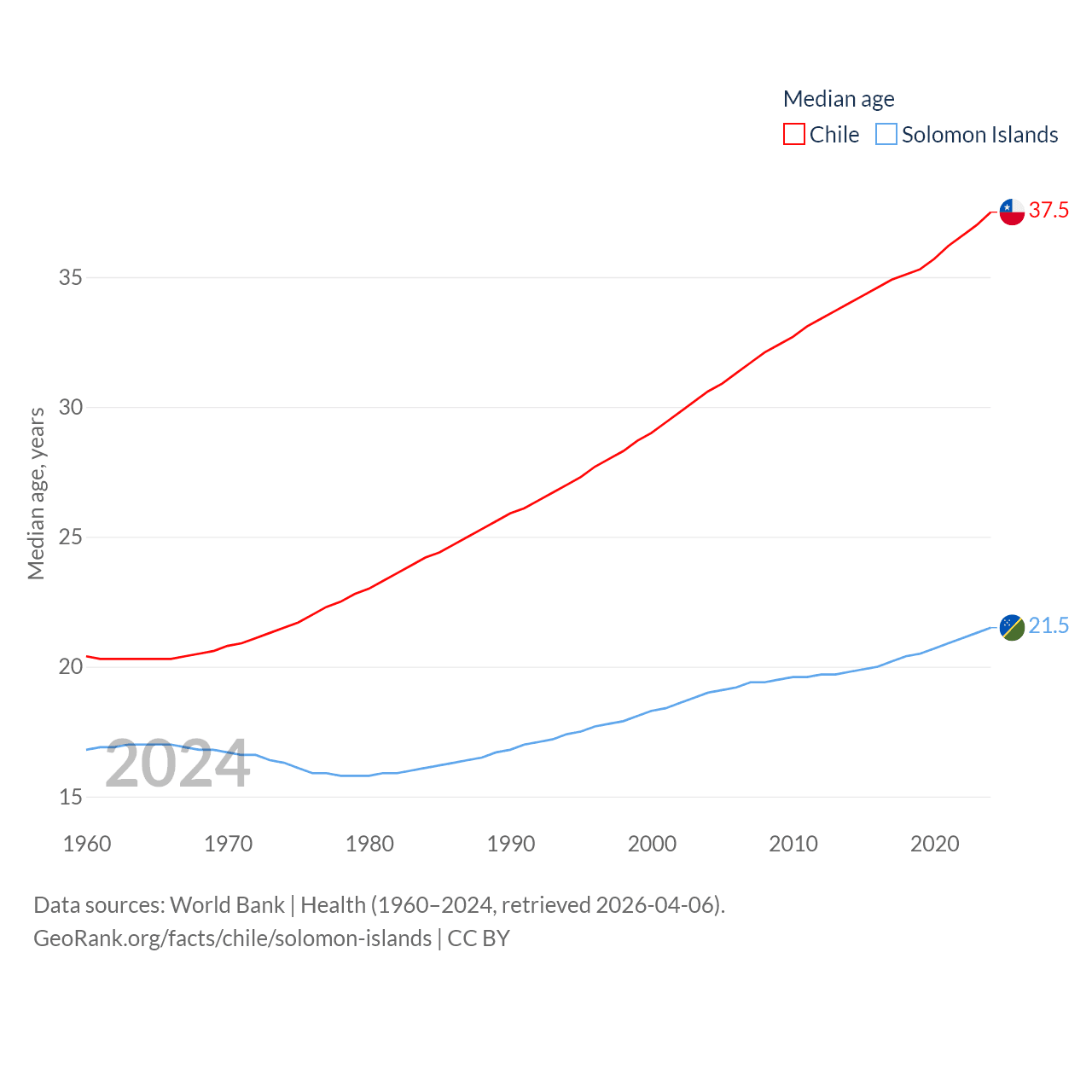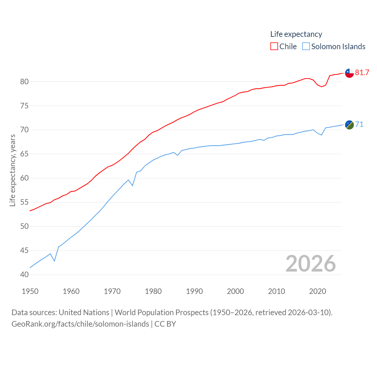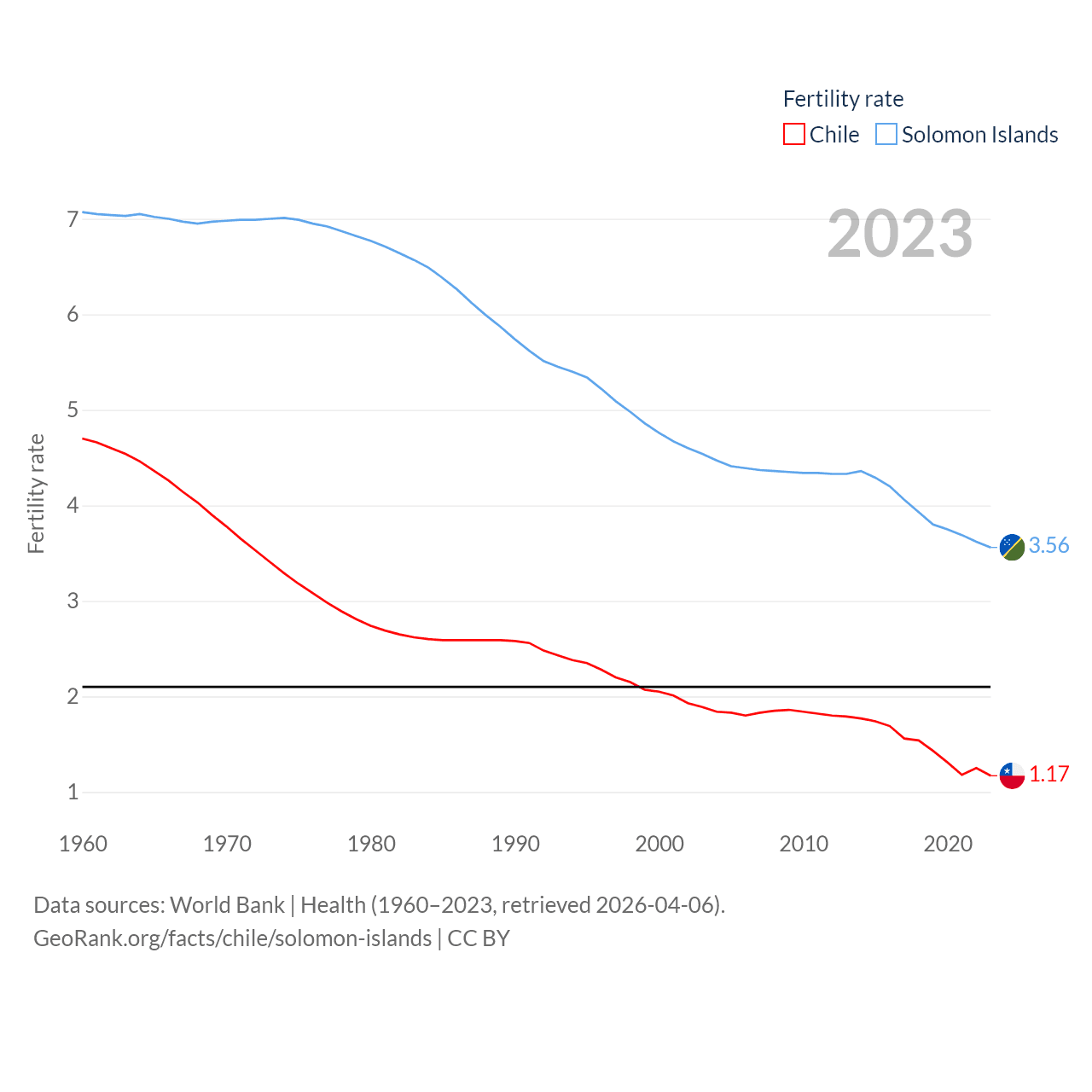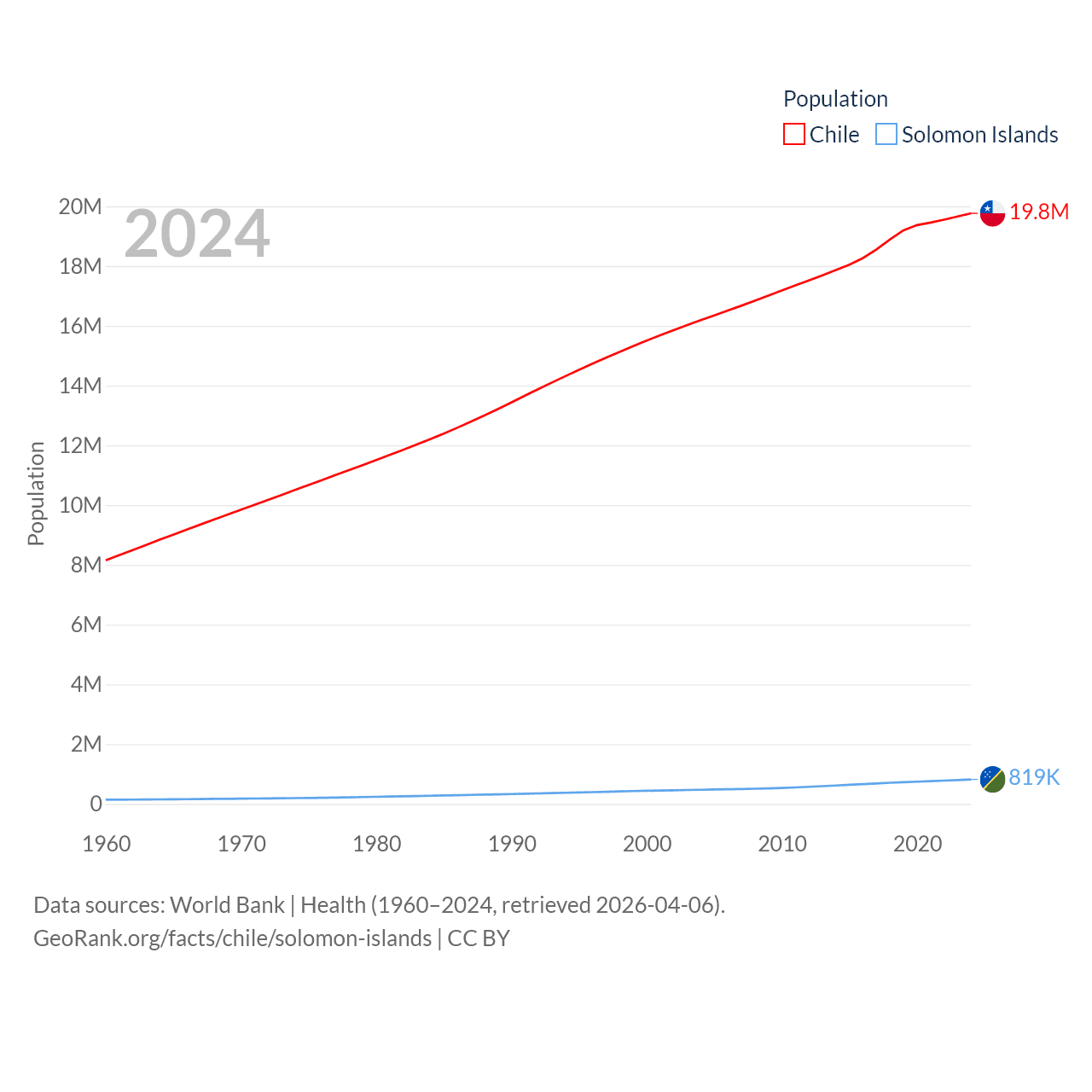 Chile has a population of 19.8M (ranked 66/197), compared with 819K in The Solomon Islands (ranked 162/197). Chile's land area is 286,809 sq mi versus 10,807 sq mi for The Solomon Islands (ranked 38th vs. 141st).