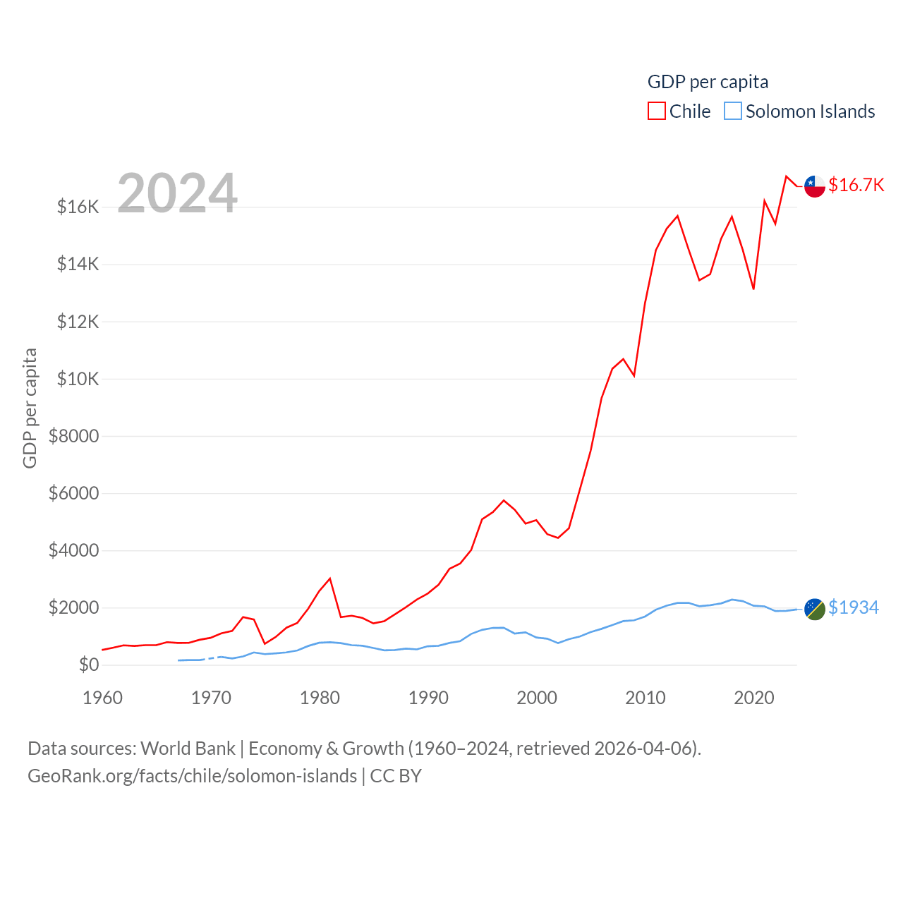 By GDP, Chile ranks 45/197 ($330B) and The Solomon Islands ranks 182/197 ($1.58B). By GDP per capita, Chile ranks 65/197 ($16,710), while The Solomon Islands ranks 157/197 ($1,934).