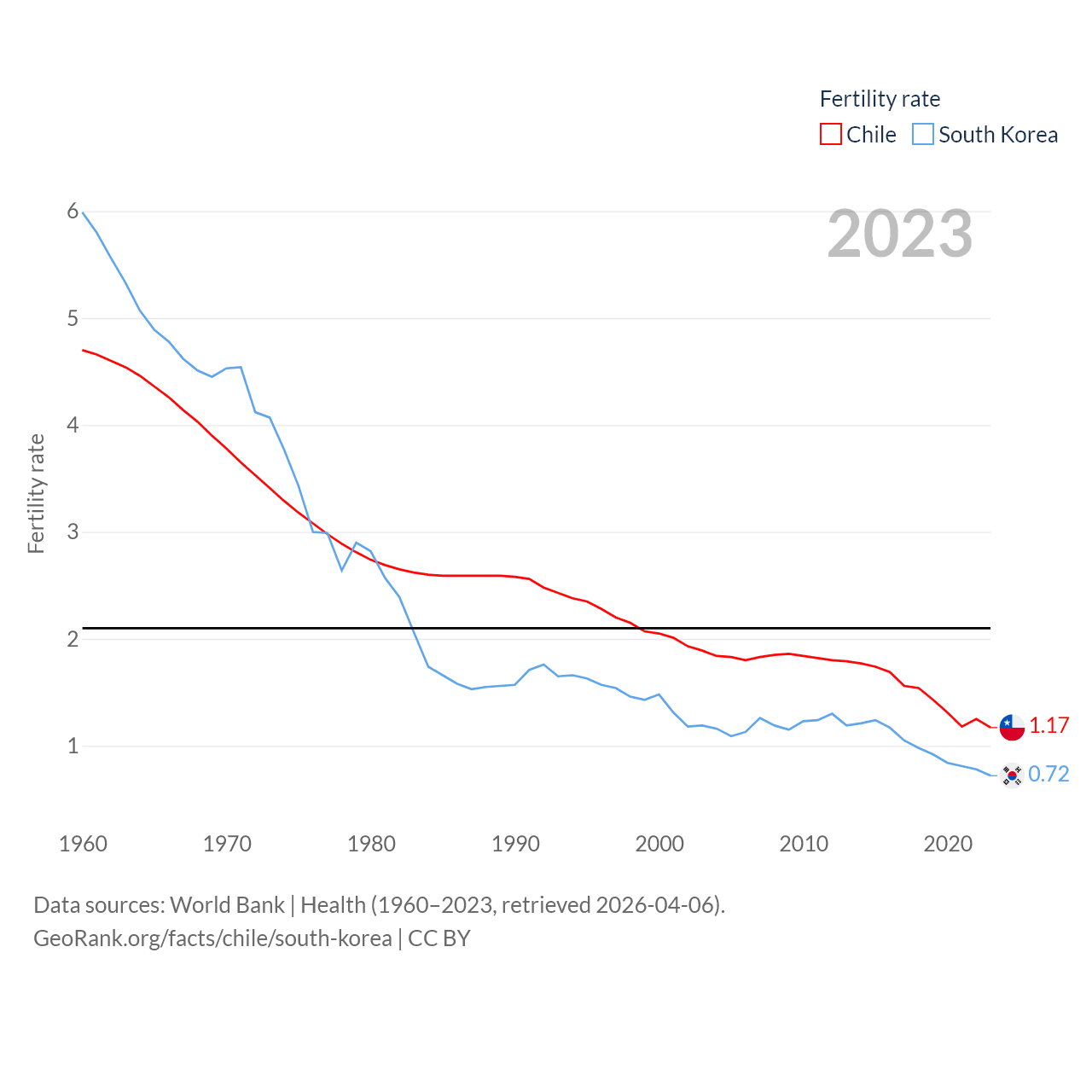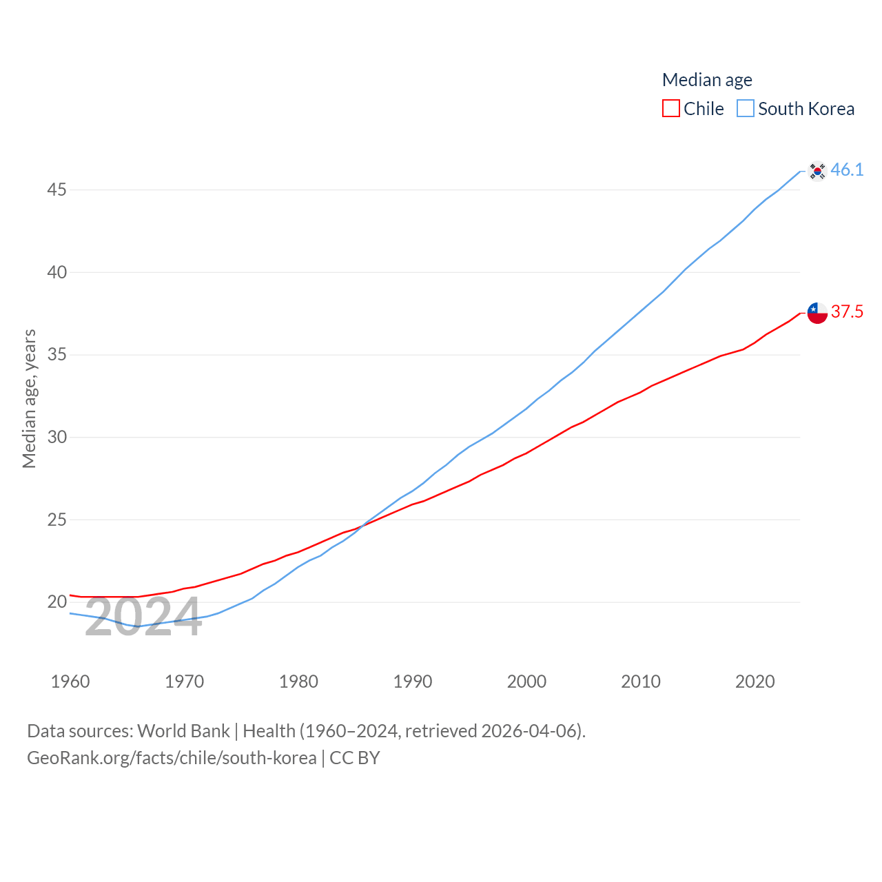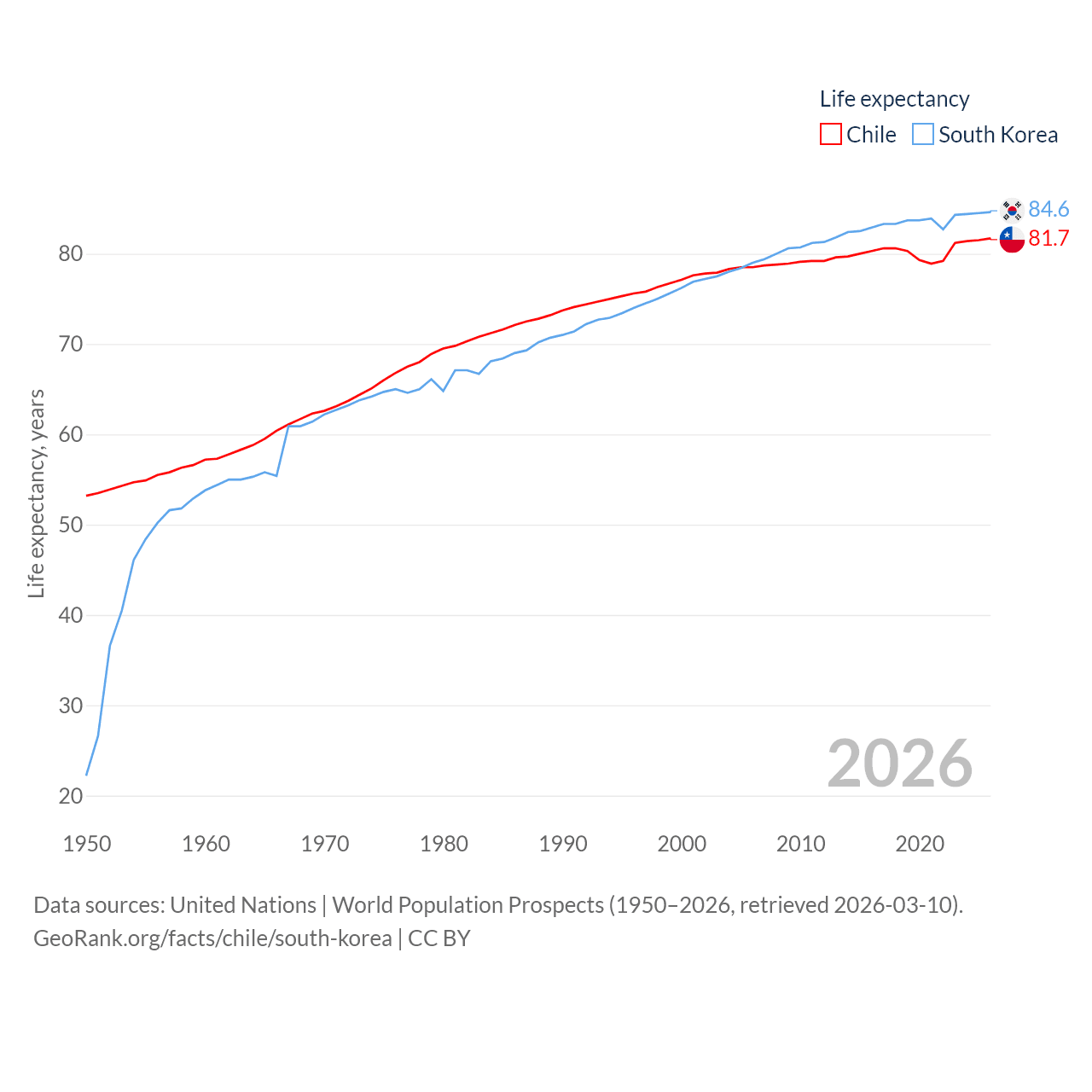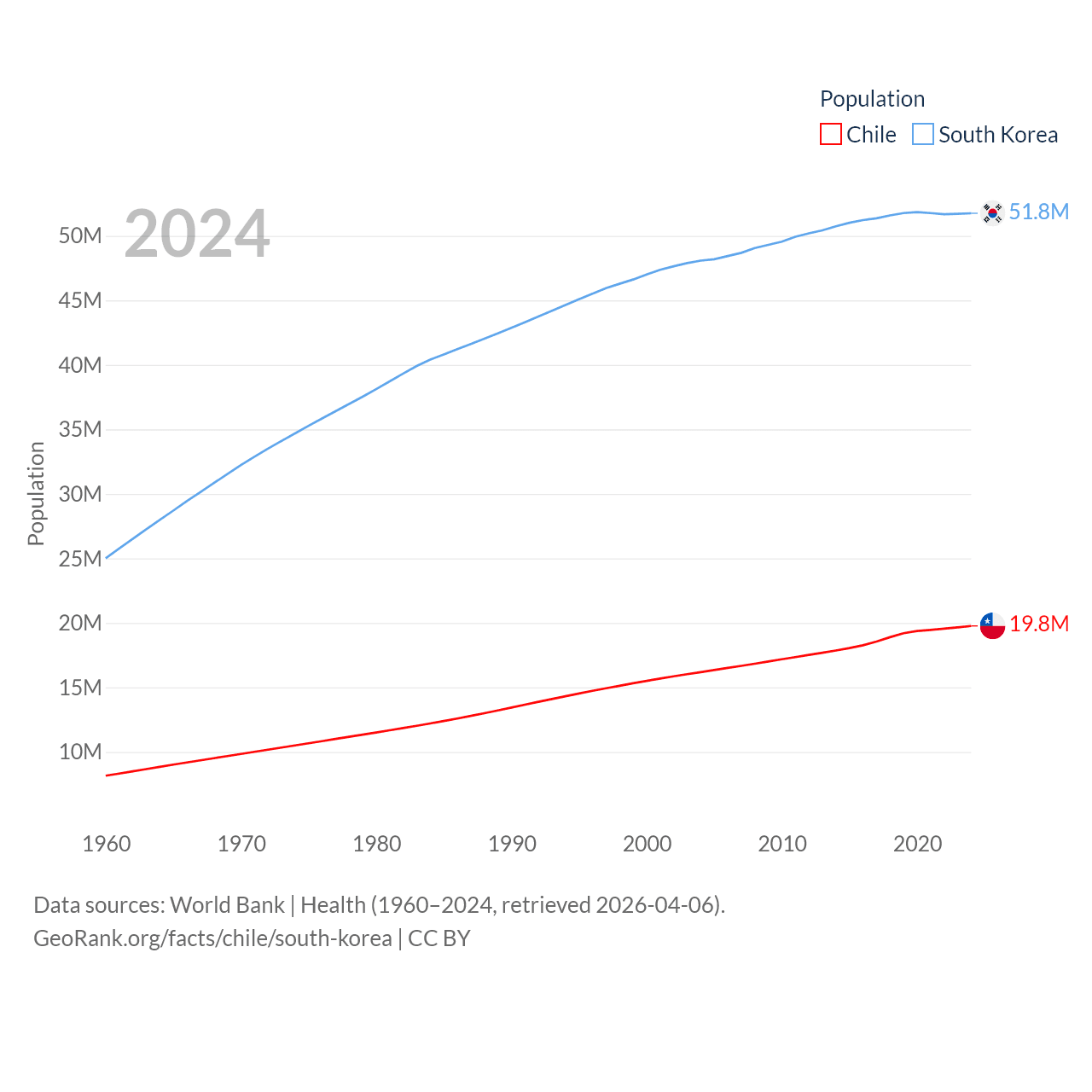 Chile has a population of 19.8M (ranked 66/197), compared with 51.8M in South Korea (ranked 29/197). Chile's land area is 286,809 sq mi versus 37,684 sq mi for South Korea (ranked 38th vs. 105th).