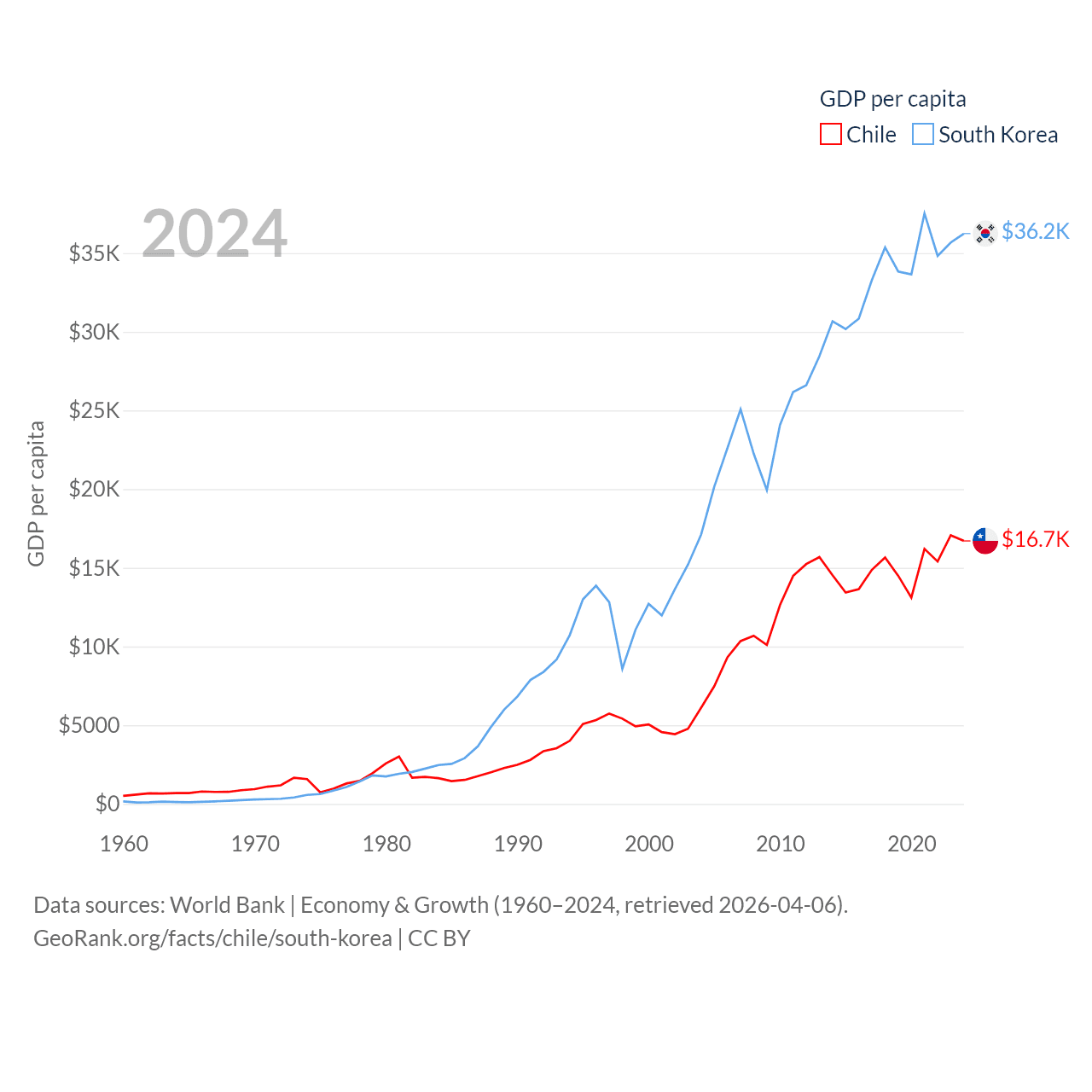 By GDP, Chile ranks 45/197 ($330B) and South Korea ranks 12/197 ($1.88T). By GDP per capita, Chile ranks 65/197 ($16,710), while South Korea ranks 31/197 ($36,239).