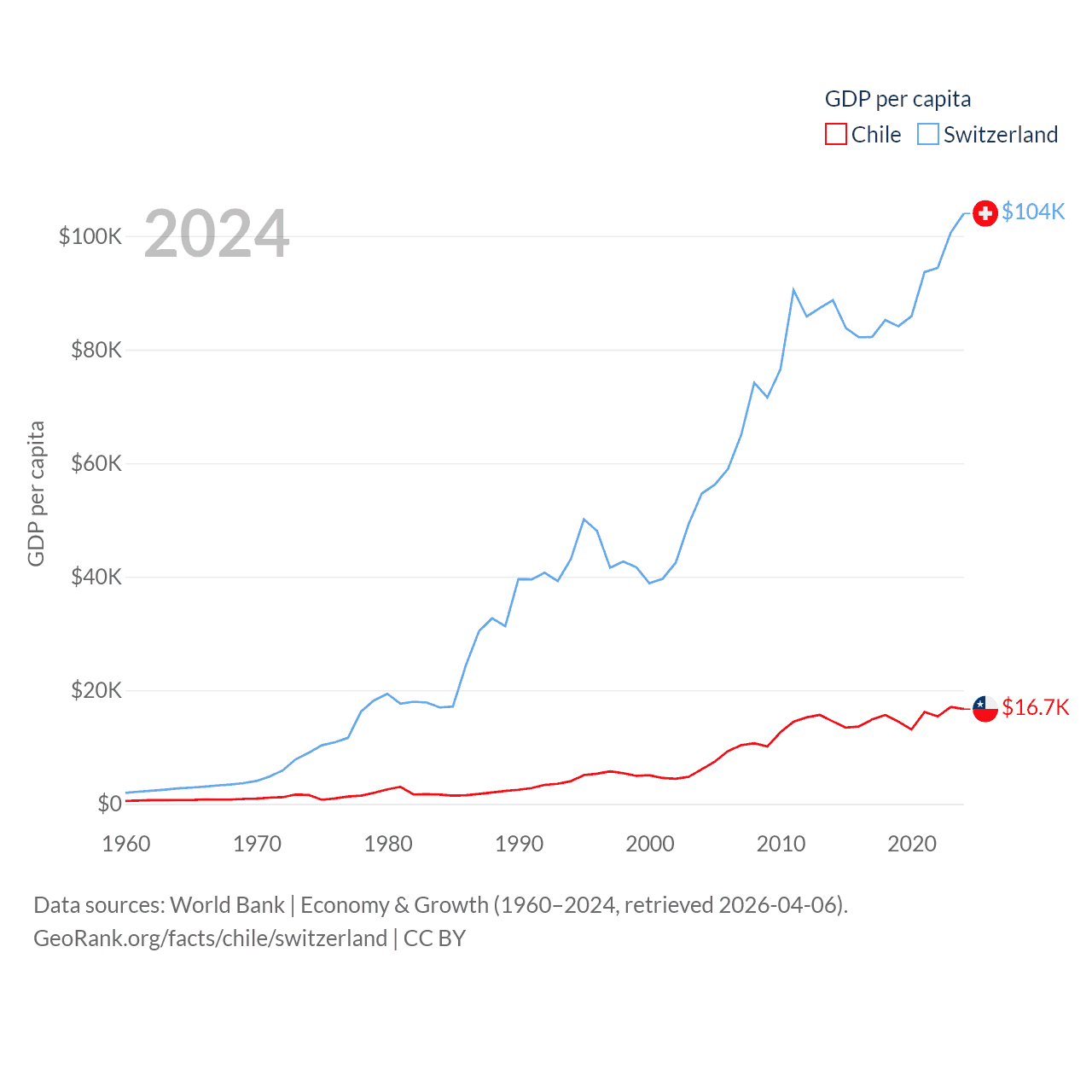 By GDP, Chile ranks 45/197 ($330B) and Switzerland ranks 20/197 ($937B). By GDP per capita, Chile ranks 65/197 ($16,710), while Switzerland ranks 5/197 ($103,998).