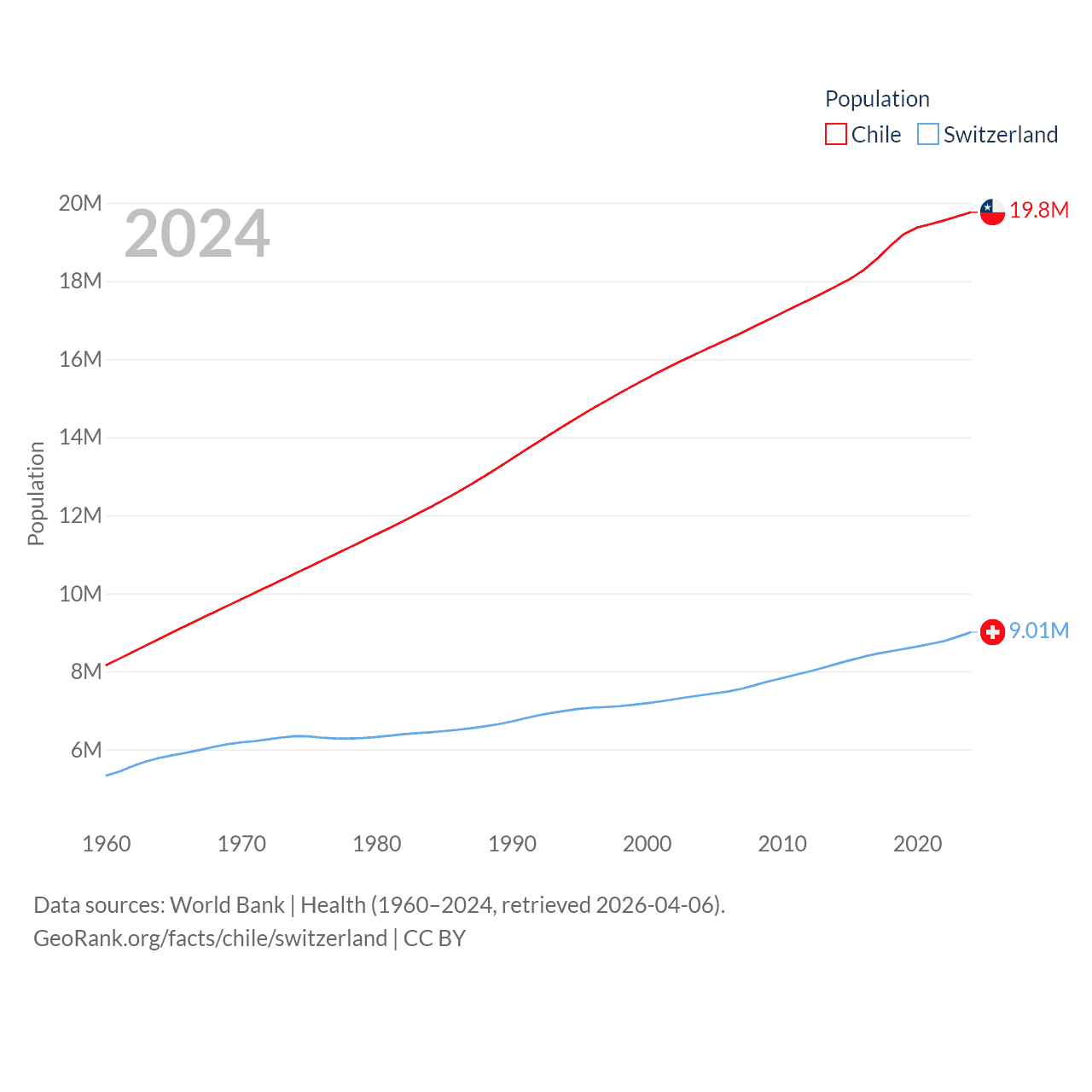 Chile has a population of 19.8M (ranked 66/197), compared with 9.01M in Switzerland (ranked 101/197). Chile's land area is 286,809 sq mi versus 15,255 sq mi for Switzerland (ranked 38th vs. 131st).
