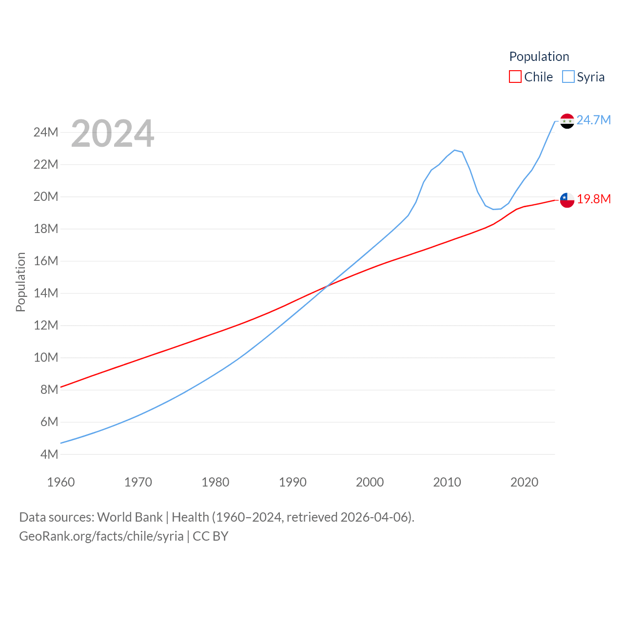 Chile has a population of 19.8M (ranked 66/197), compared with 24.7M in Syria (ranked 57/197). Chile's land area is 286,809 sq mi versus 70,900 sq mi for Syria (ranked 38th vs. 87th).
