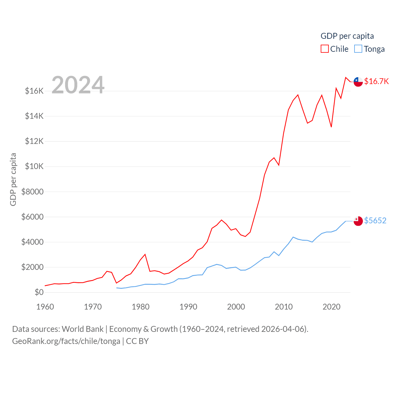 By GDP, Chile ranks 45/197 ($330B) and Tonga ranks 191/197 ($591M). By GDP per capita, Chile ranks 65/197 ($16,710), while Tonga ranks 115/197 ($5,652).