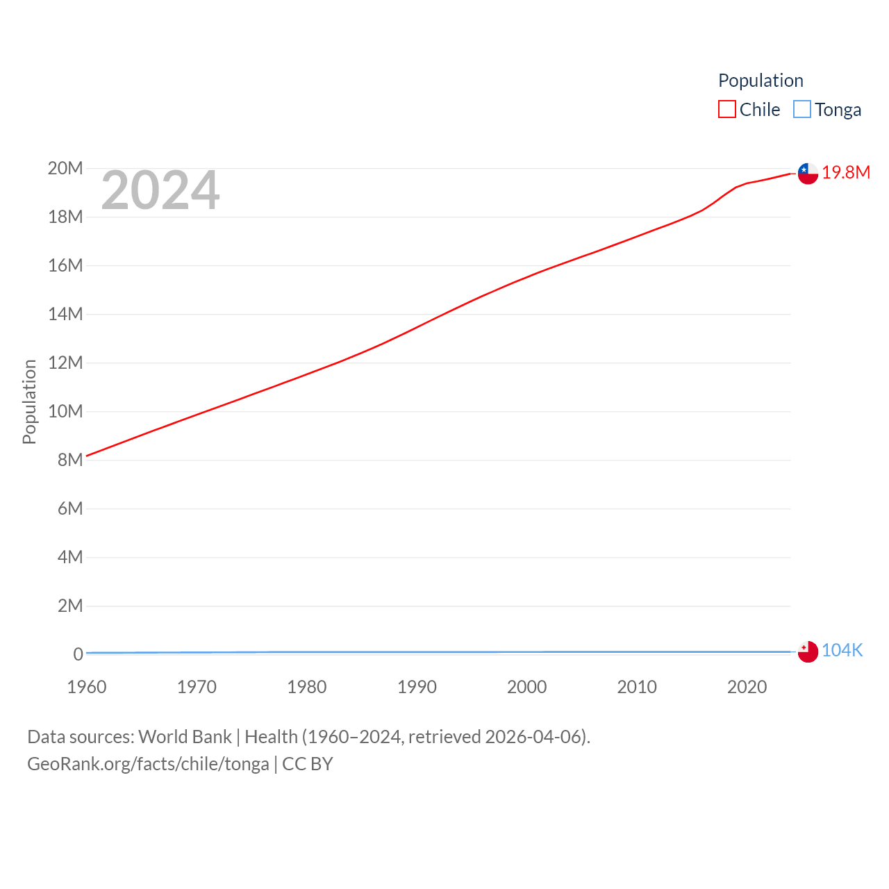 Chile has a population of 19.8M (ranked 66/197), compared with 104K in Tonga (ranked 183/197). Chile's land area is 286,809 sq mi versus 278 sq mi for Tonga (ranked 38th vs. 176th).