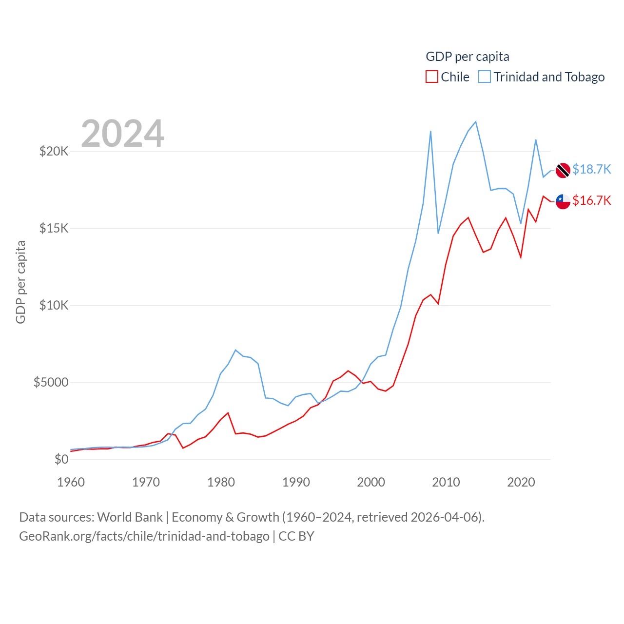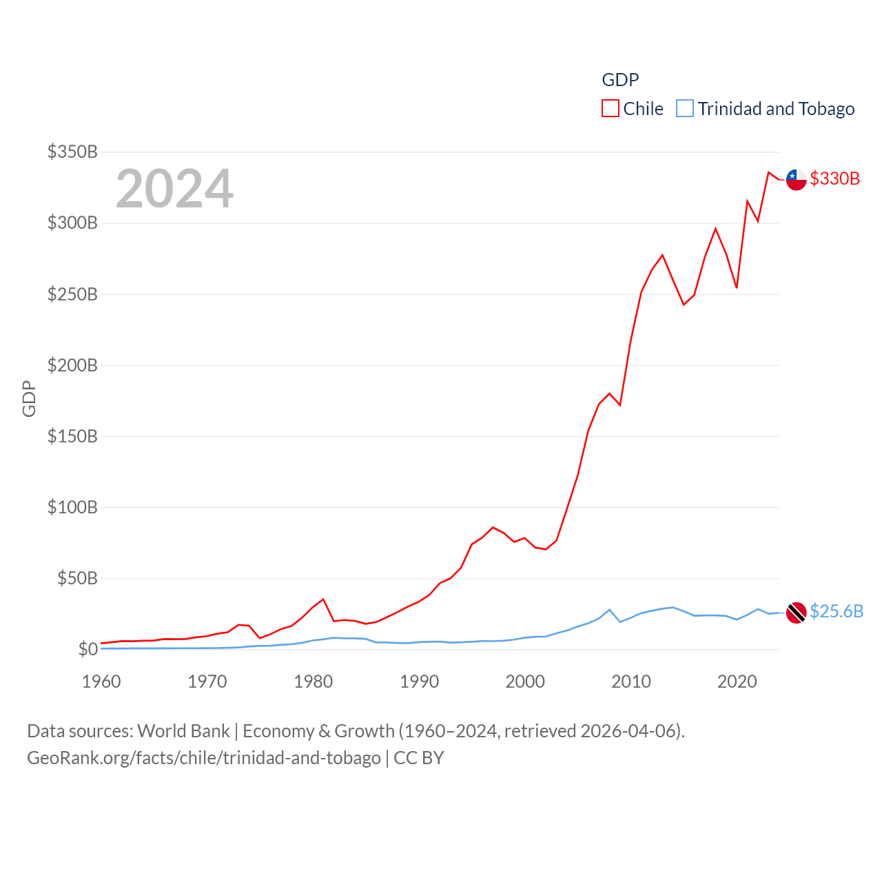 By GDP, Chile ranks 45/197 ($330B) and Trinidad and Tobago ranks 115/197 ($25.6B). By GDP per capita, Chile ranks 65/197 ($16,710), while Trinidad and Tobago ranks 61/197 ($18,733).