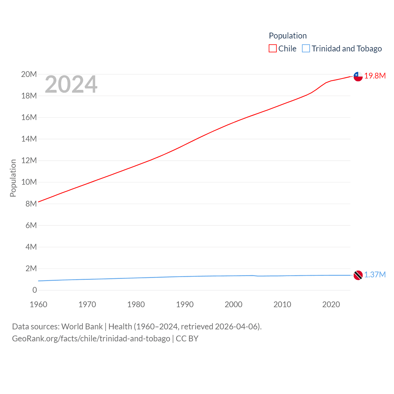 Chile has a population of 19.8M (ranked 66/197), compared with 1.37M in Trinidad and Tobago (ranked 154/197). Chile's land area is 286,809 sq mi versus 1,981 sq mi for Trinidad and Tobago (ranked 38th vs. 166th).