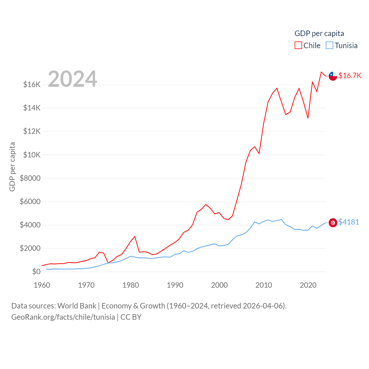 By GDP, Chile ranks 45/197 ($330B) and Tunisia ranks 93/197 ($51.3B). By GDP per capita, Chile ranks 65/197 ($16,710), while Tunisia ranks 129/197 ($4,181).