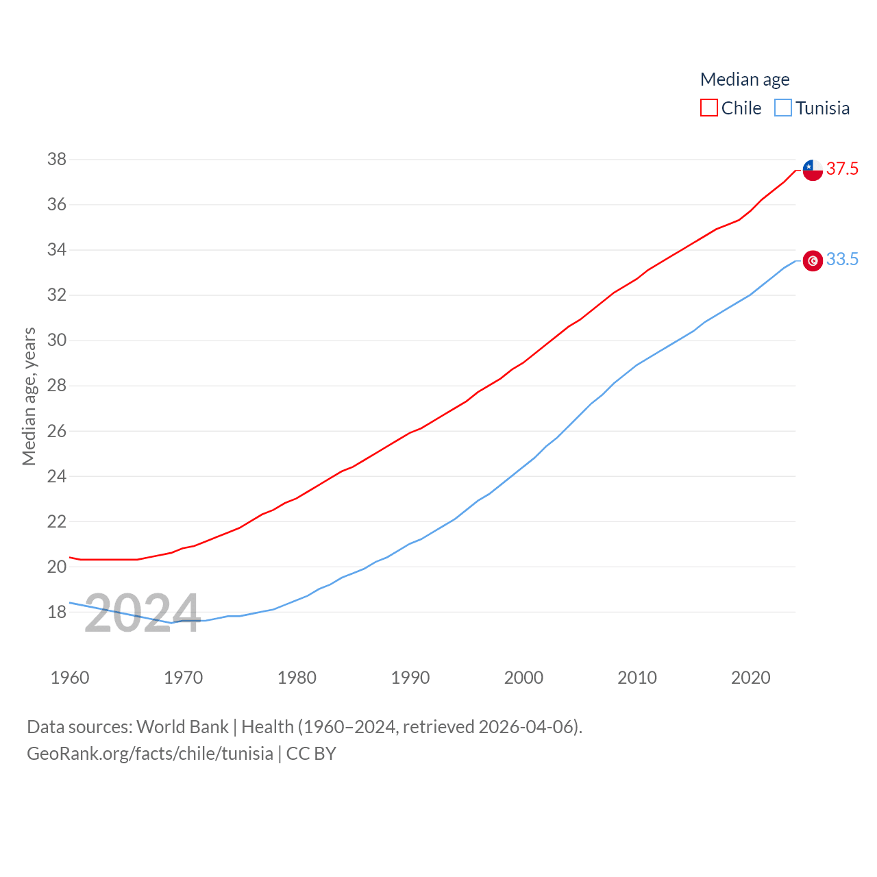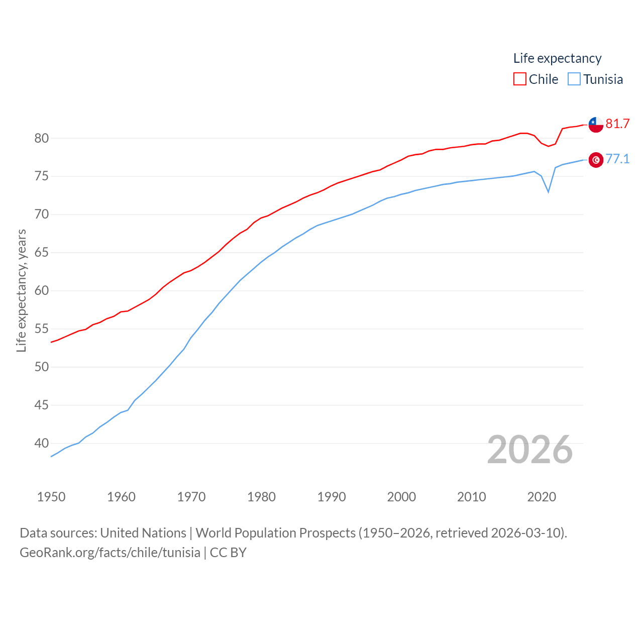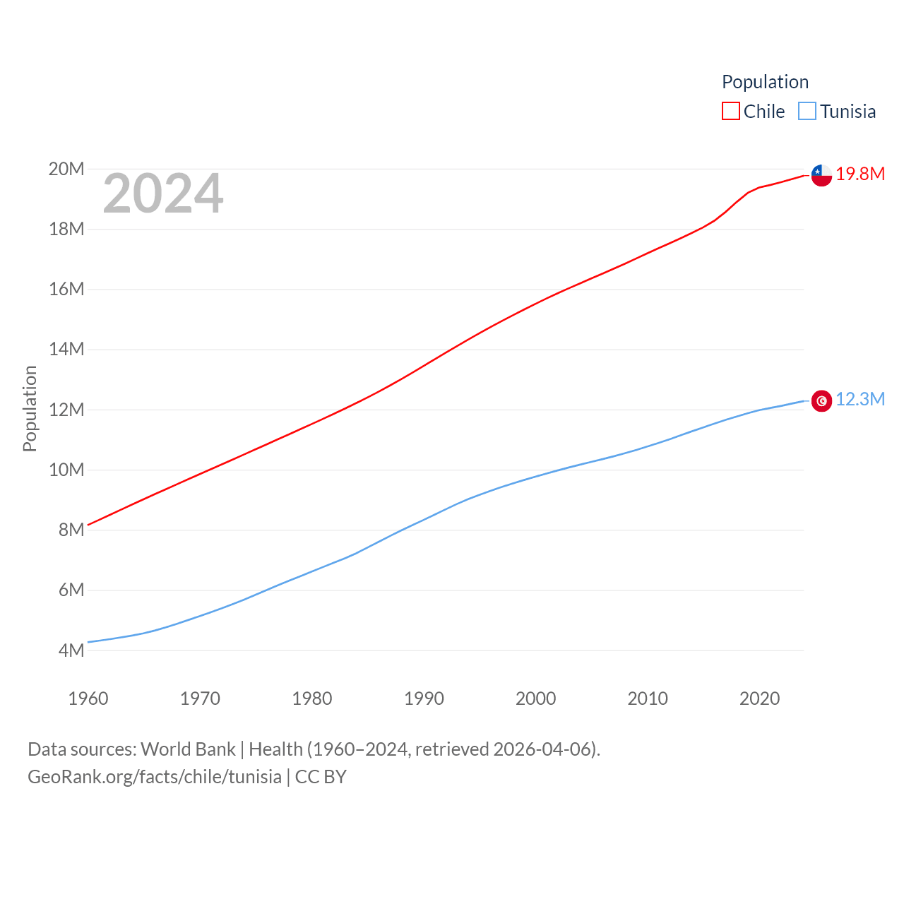 Chile has a population of 19.8M (ranked 66/197), compared with 12.3M in Tunisia (ranked 80/197). Chile's land area is 286,809 sq mi versus 59,985 sq mi for Tunisia (ranked 38th vs. 91st).