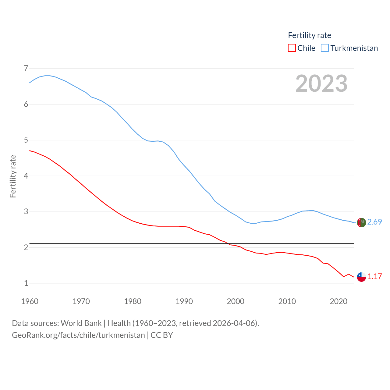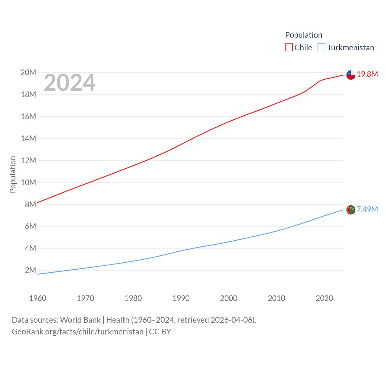 Chile has a population of 19.8M (ranked 66/197), compared with 7.49M in Turkmenistan (ranked 104/197). Chile's land area is 286,809 sq mi versus 181,441 sq mi for Turkmenistan (ranked 38th vs. 53rd).