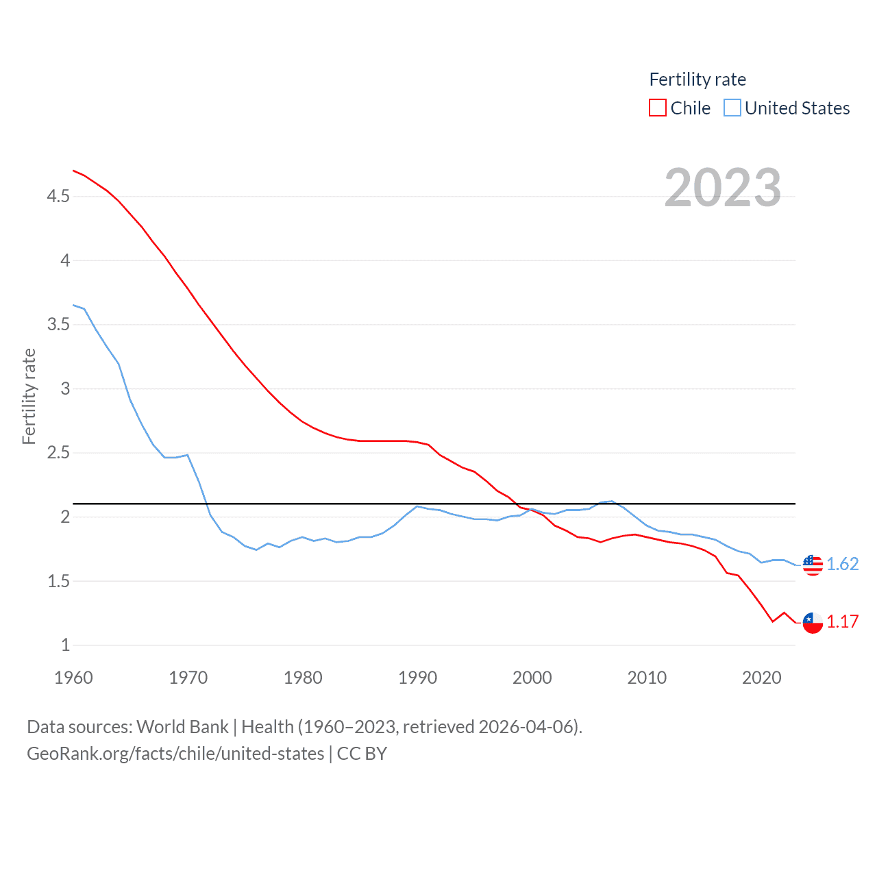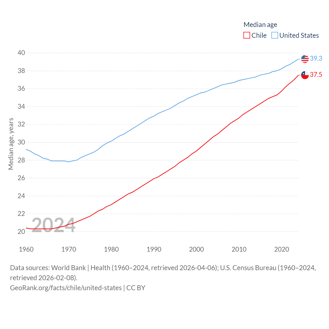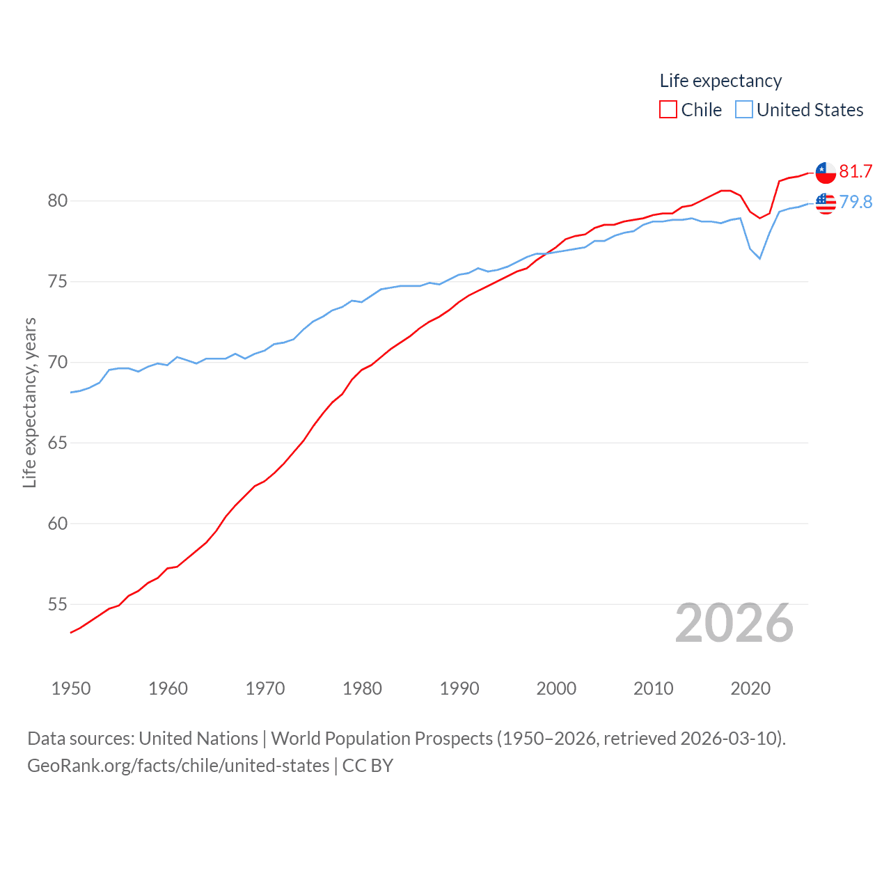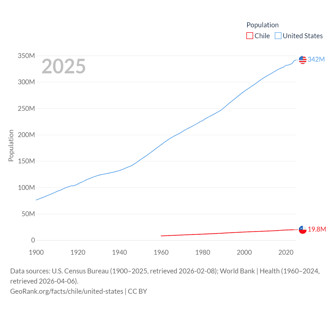 Chile has a population of 19.8M (ranked 66/197), compared with 342M in The United States (ranked 3/197). Chile's land area is 286,809 sq mi versus 3,531,839 sq mi for The United States (ranked 38th vs. 3rd).