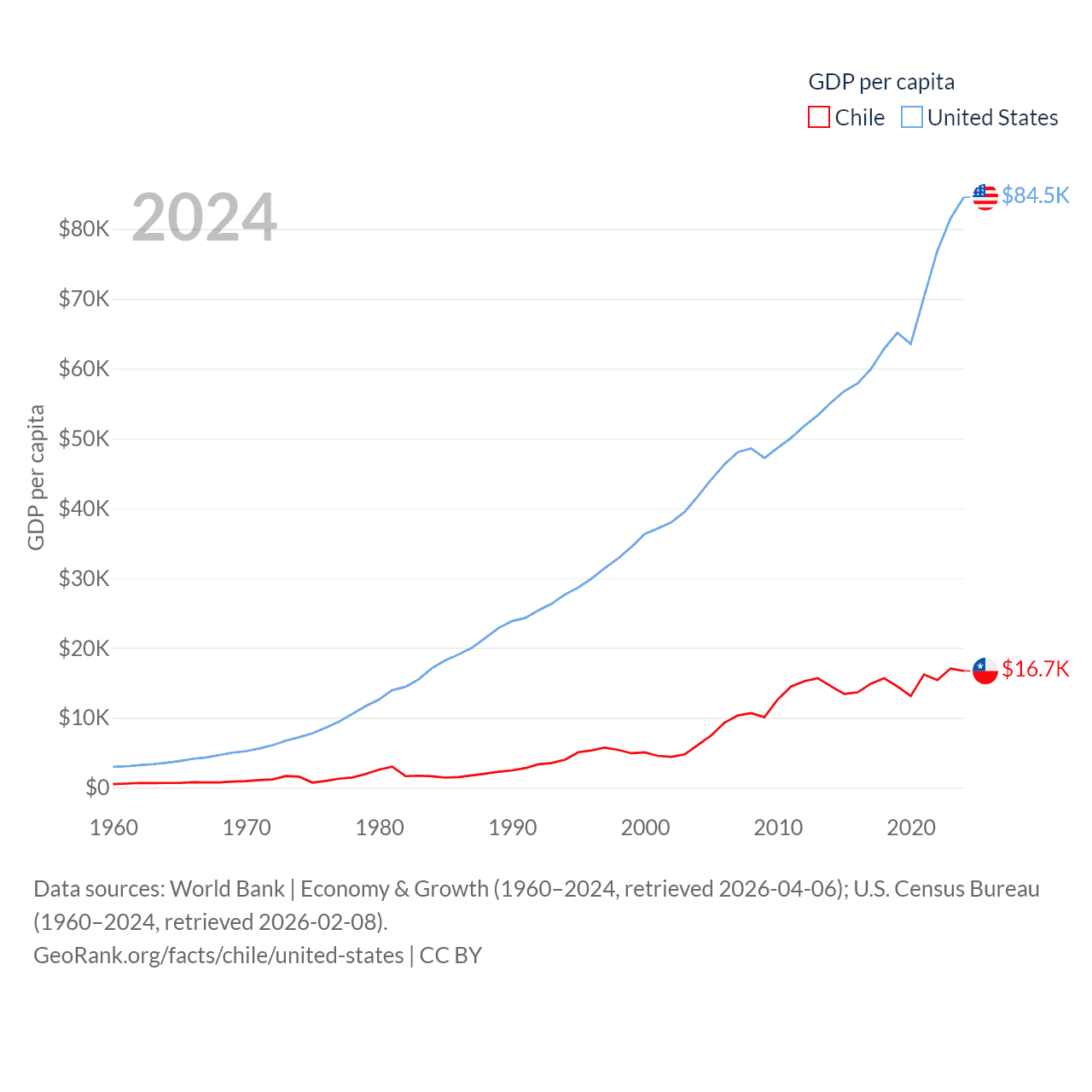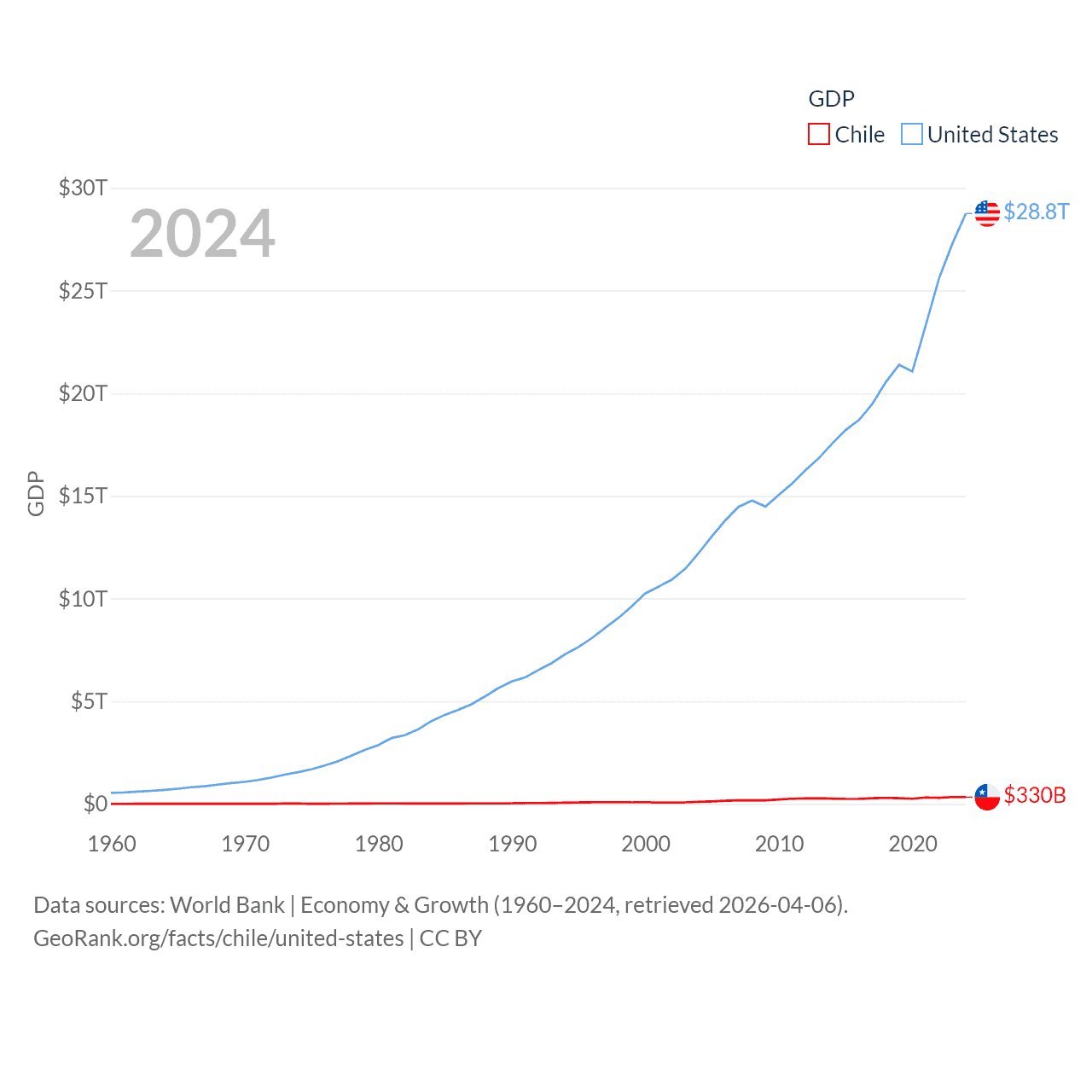 By GDP, Chile ranks 45/197 ($330B) and The United States ranks 1/197 ($28.8T). By GDP per capita, Chile ranks 65/197 ($16,710), while The United States ranks 10/197 ($84,534).